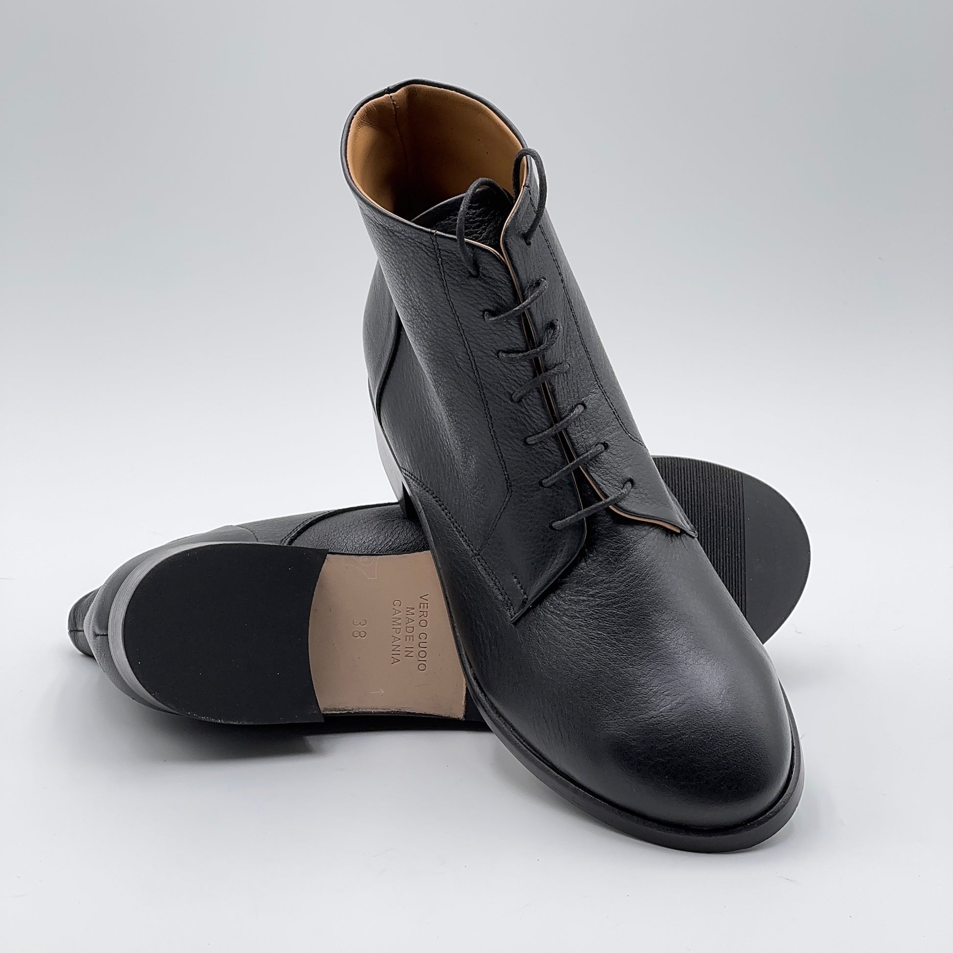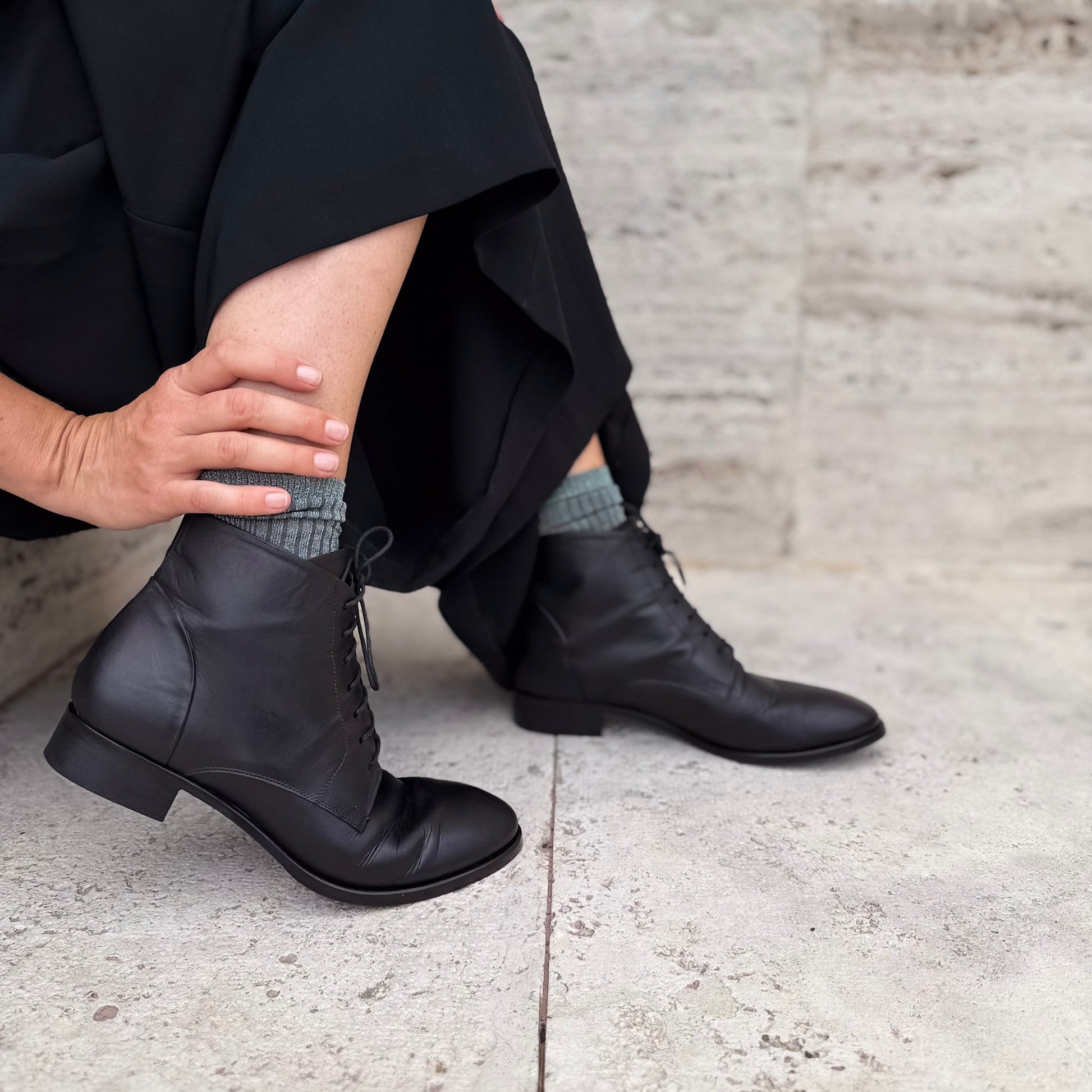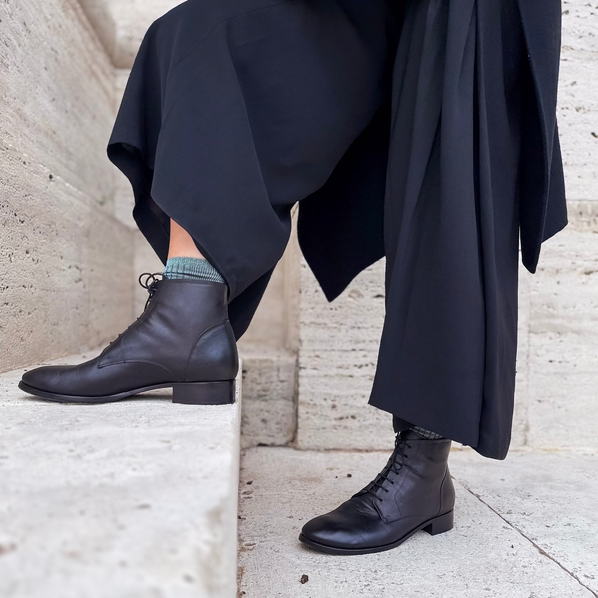 Stivaletto artigianale in morbida nappa nera dal design essenziale e raffinato. La linea affusolata e la chiusura frontale con lacci richiamano lo stile classico delle calzature tradizionali, reinterpretato in chiave contemporanea con la tipica eleganza Marta Ray.