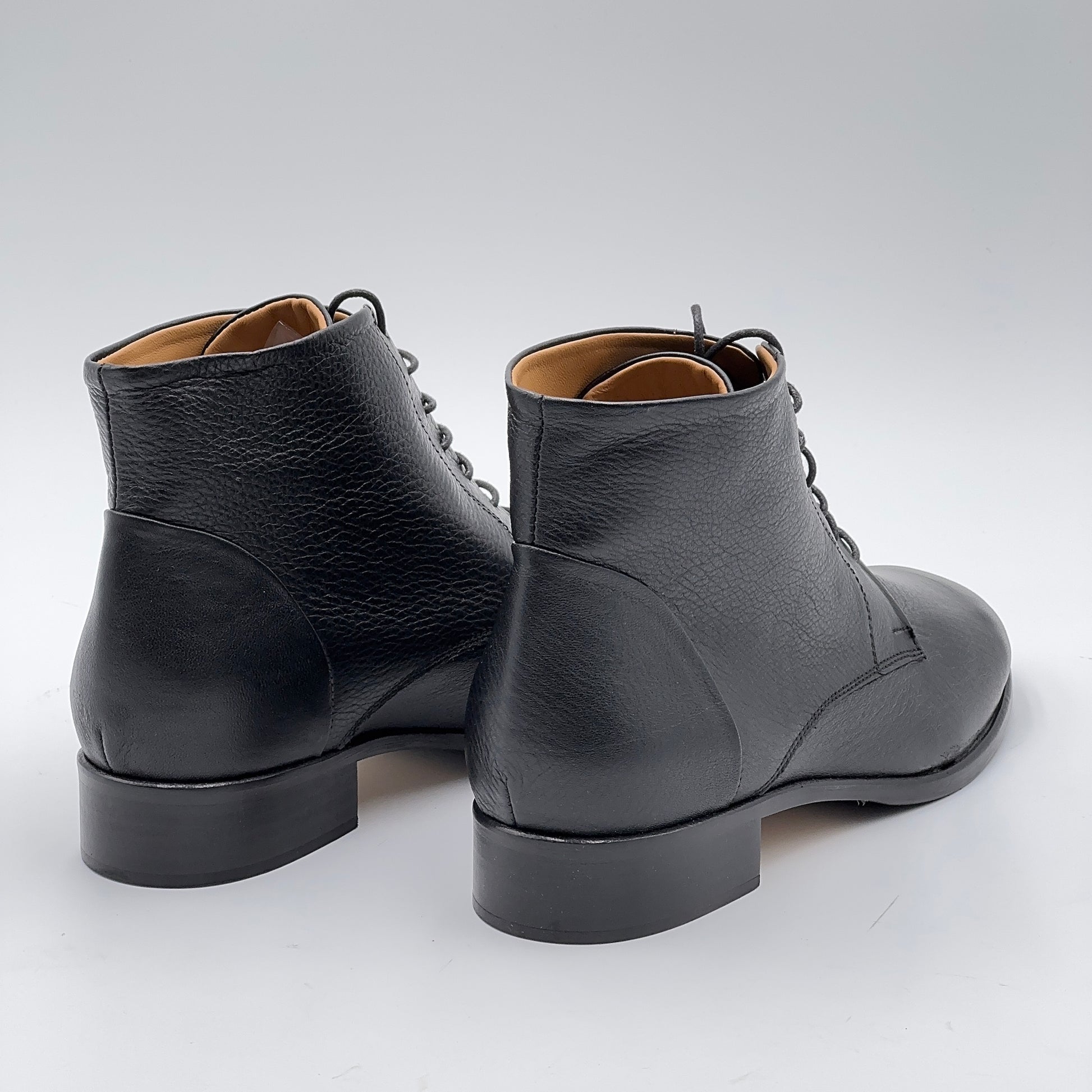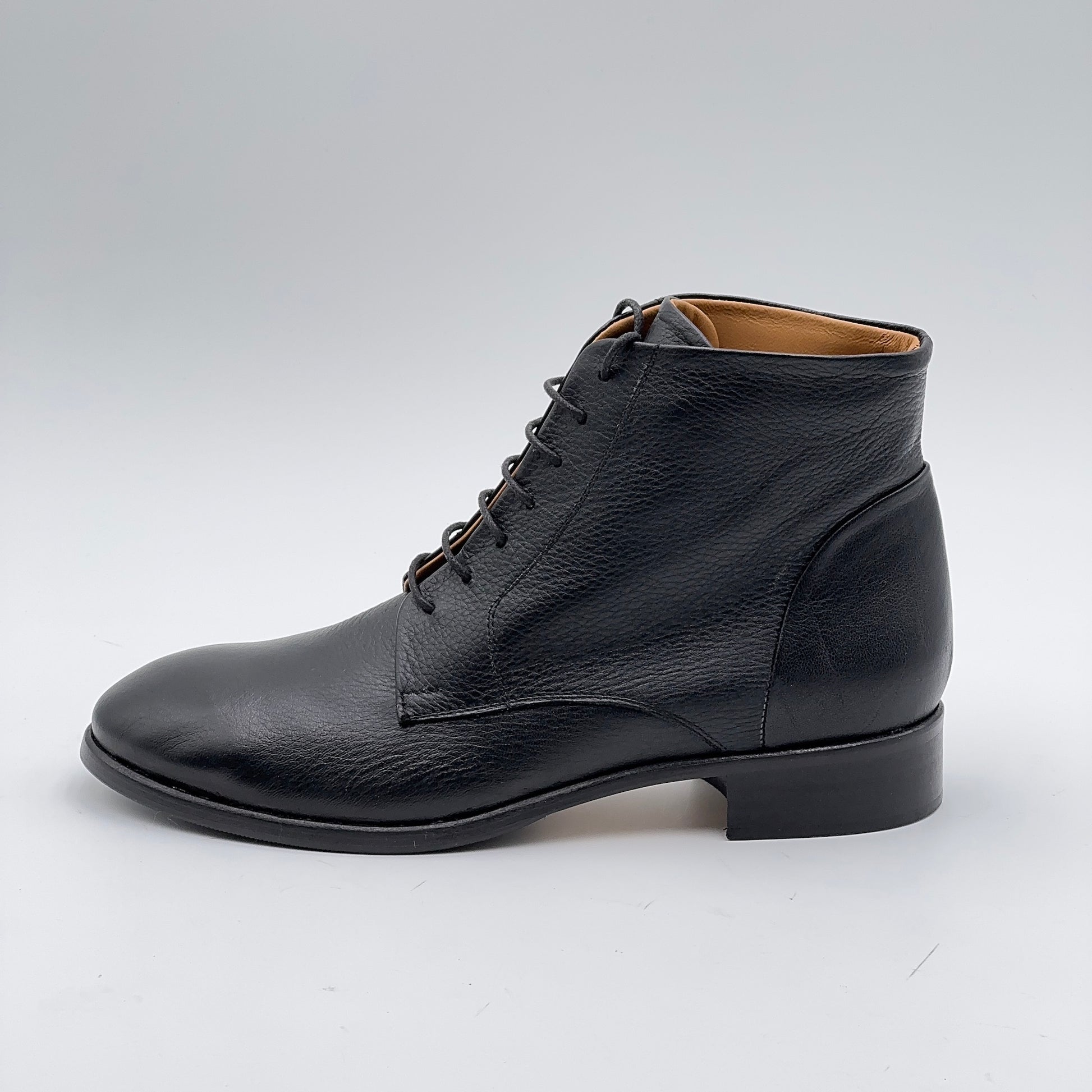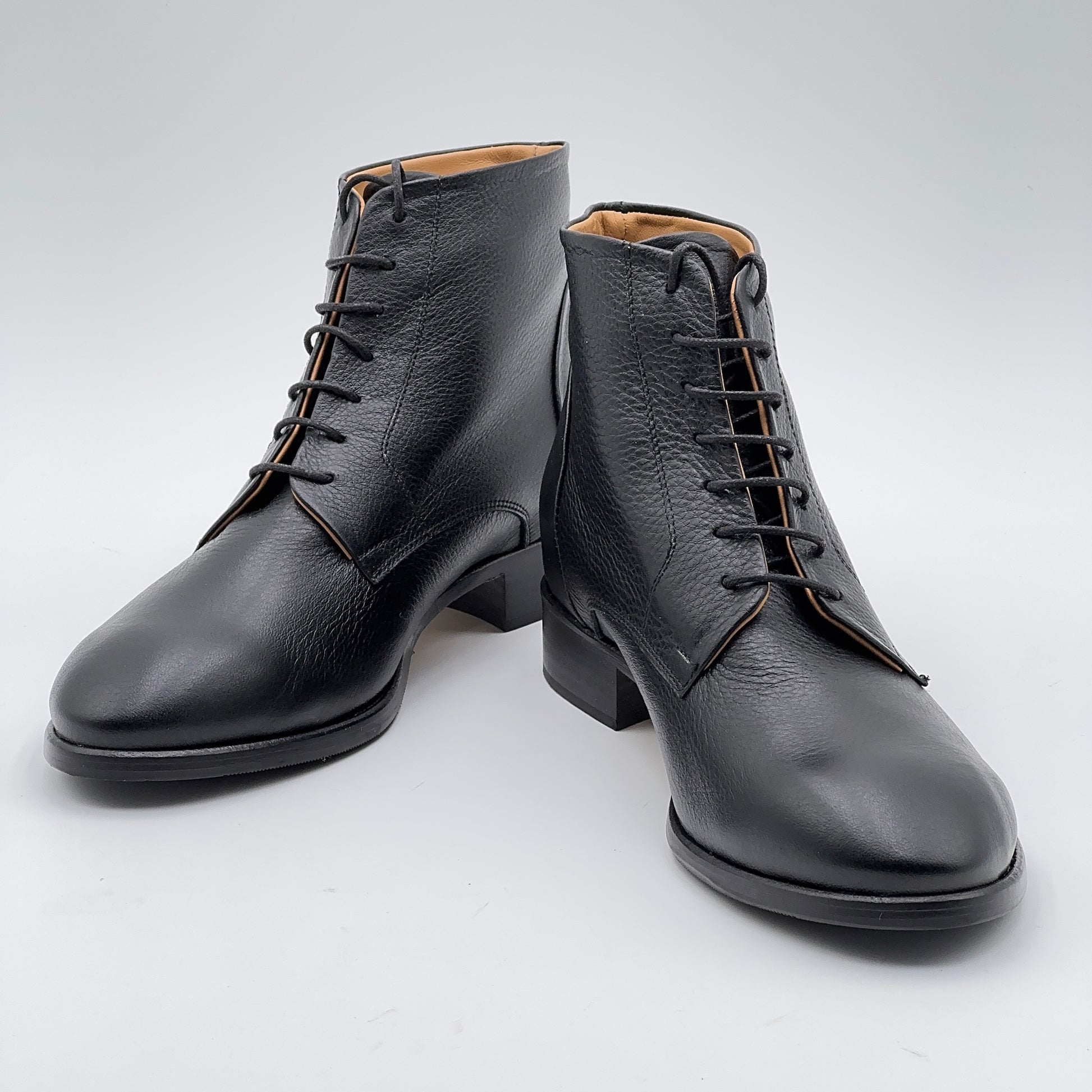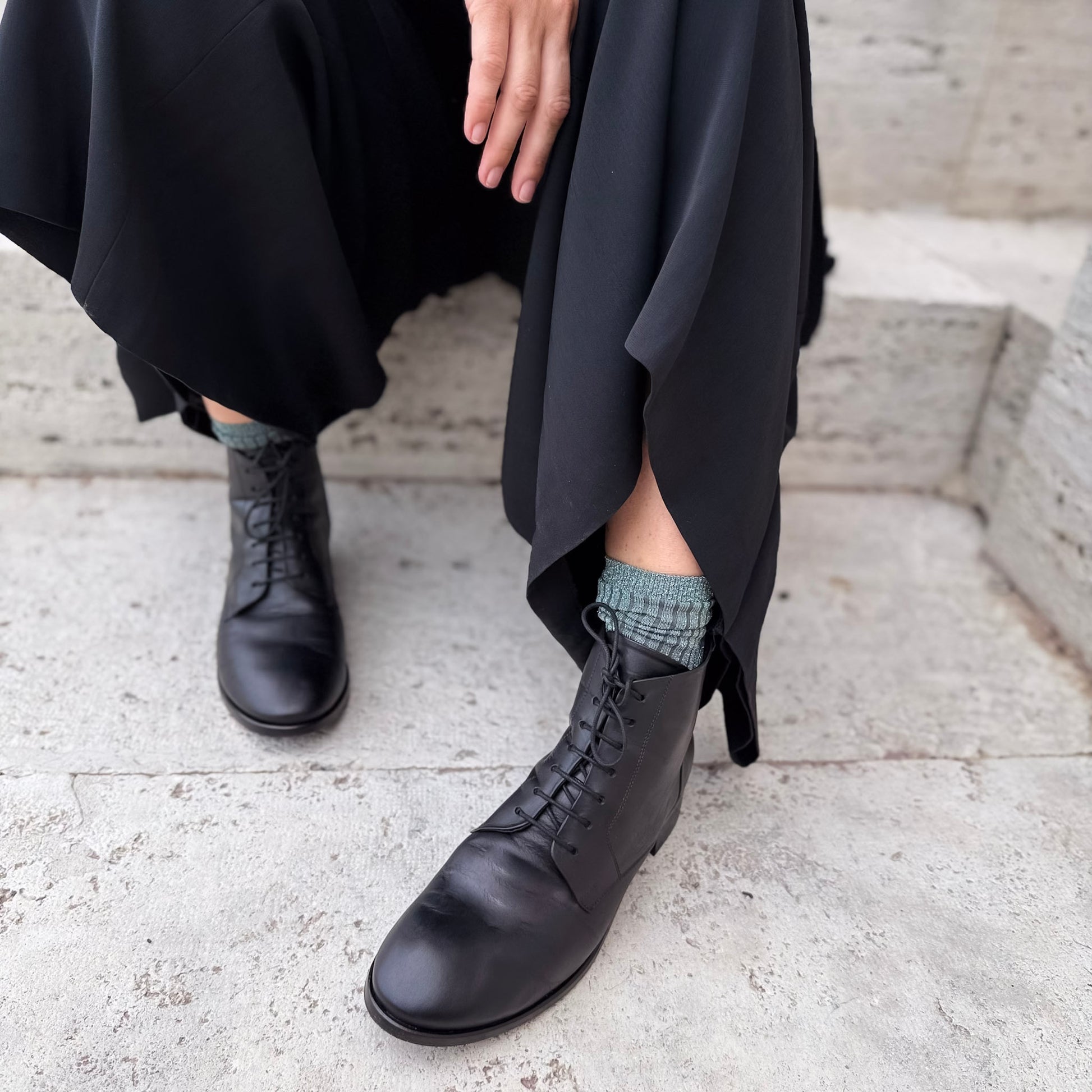 Stivaletto artigianale in morbida nappa nera dal design essenziale e raffinato. La linea affusolata e la chiusura frontale con lacci richiamano lo stile classico delle calzature tradizionali, reinterpretato in chiave contemporanea con la tipica eleganza Marta Ray.