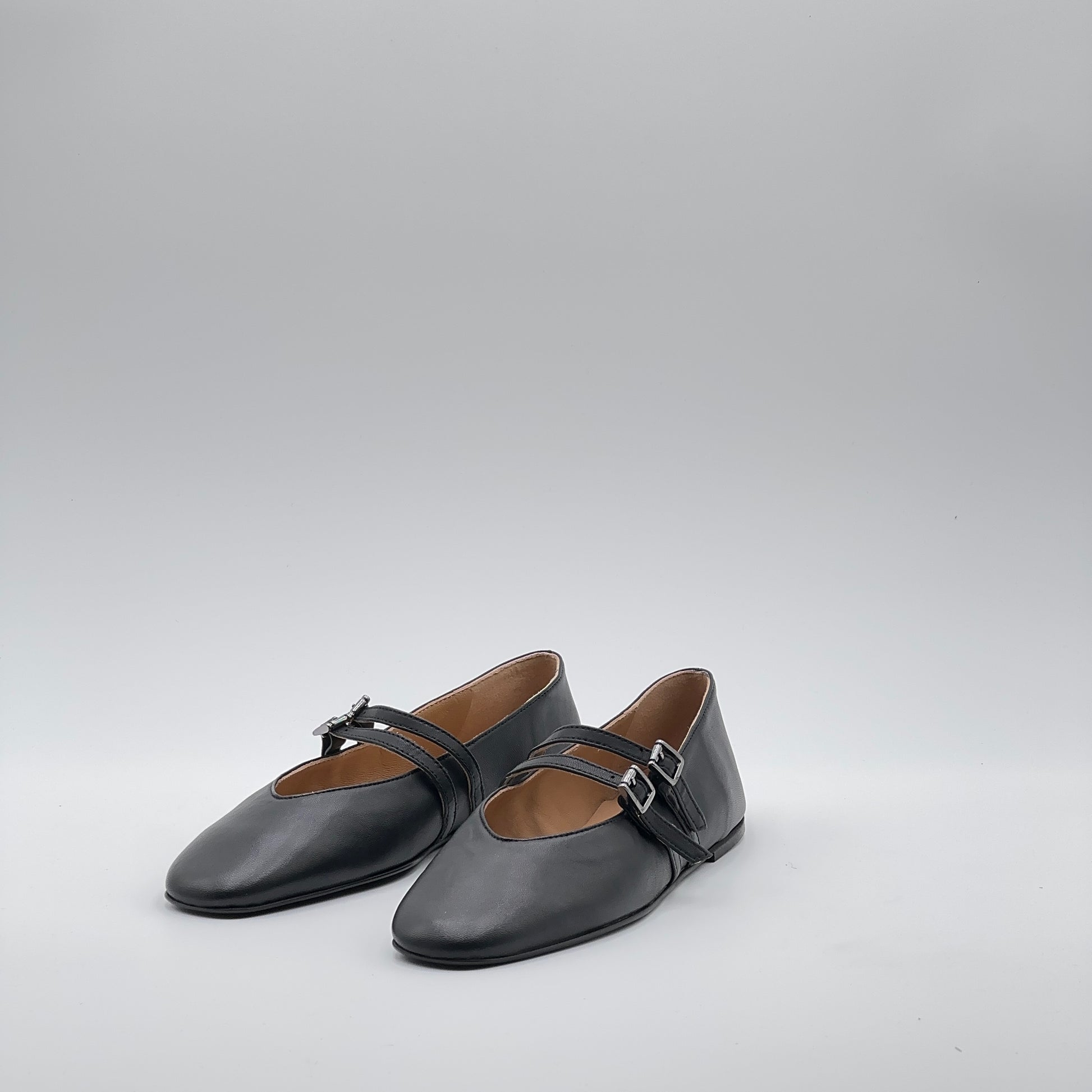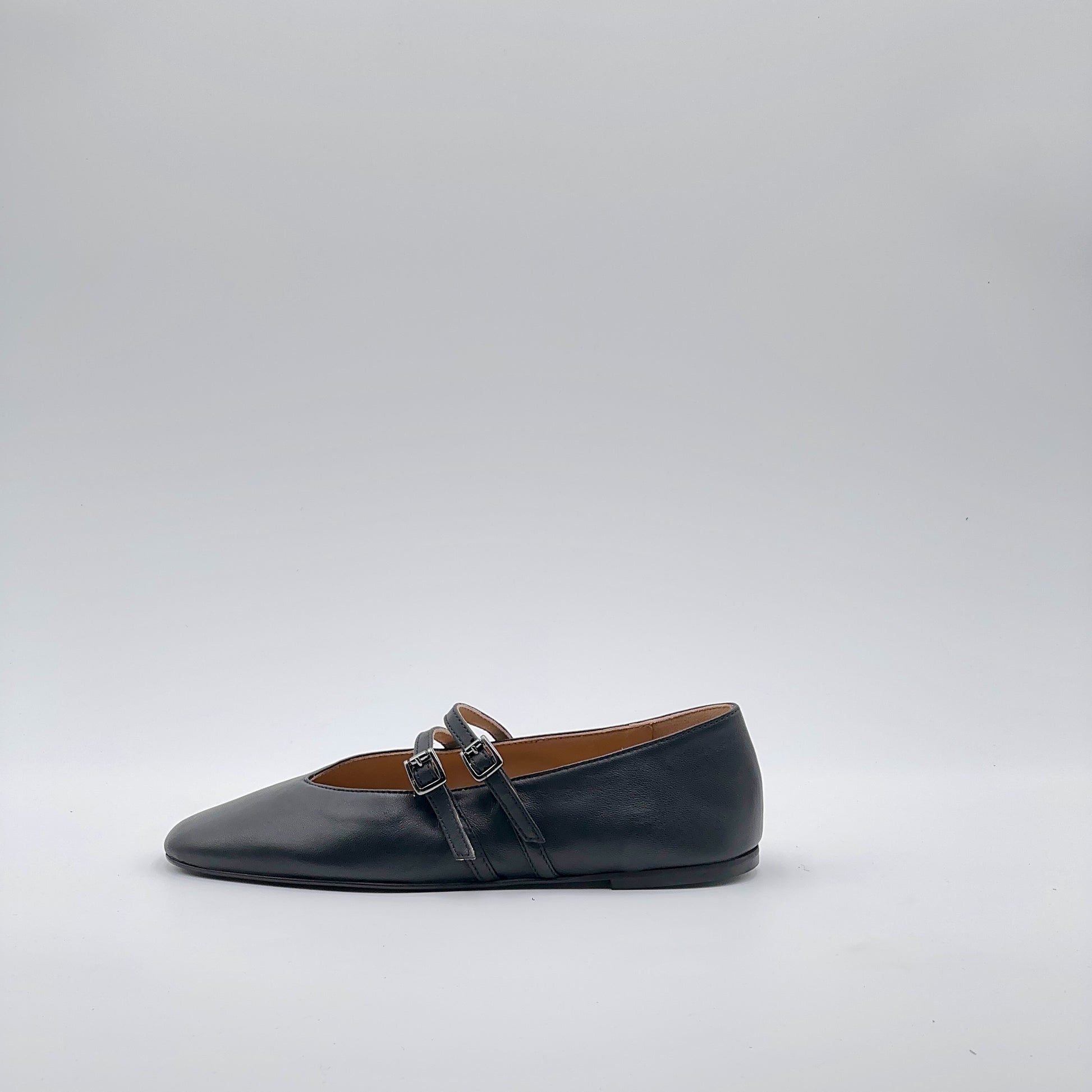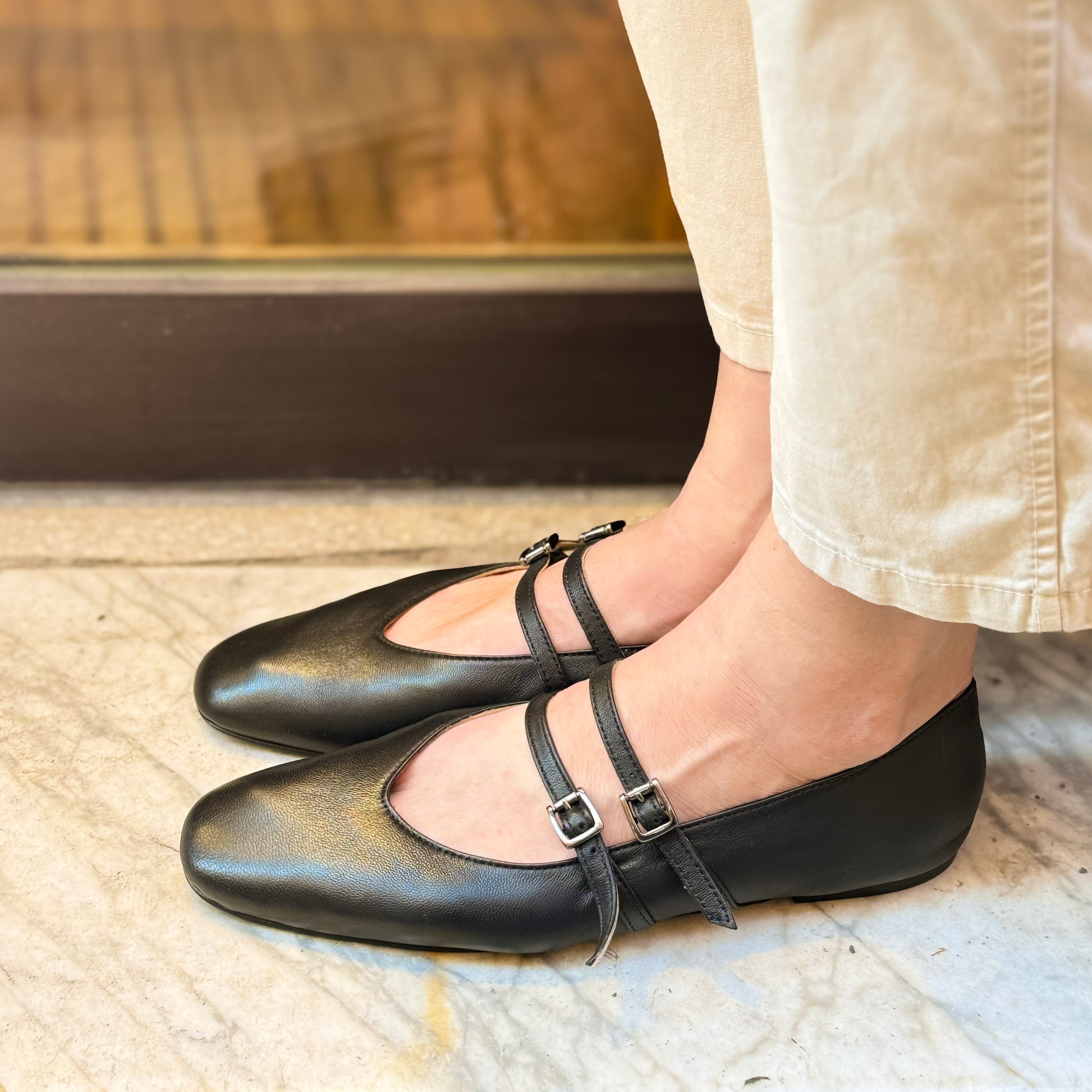 Ballerina doppio cinturino in morbida nappa nera, elegante e senza tempo. Cinturini in pelle tono su tono con fibbia regolabile.