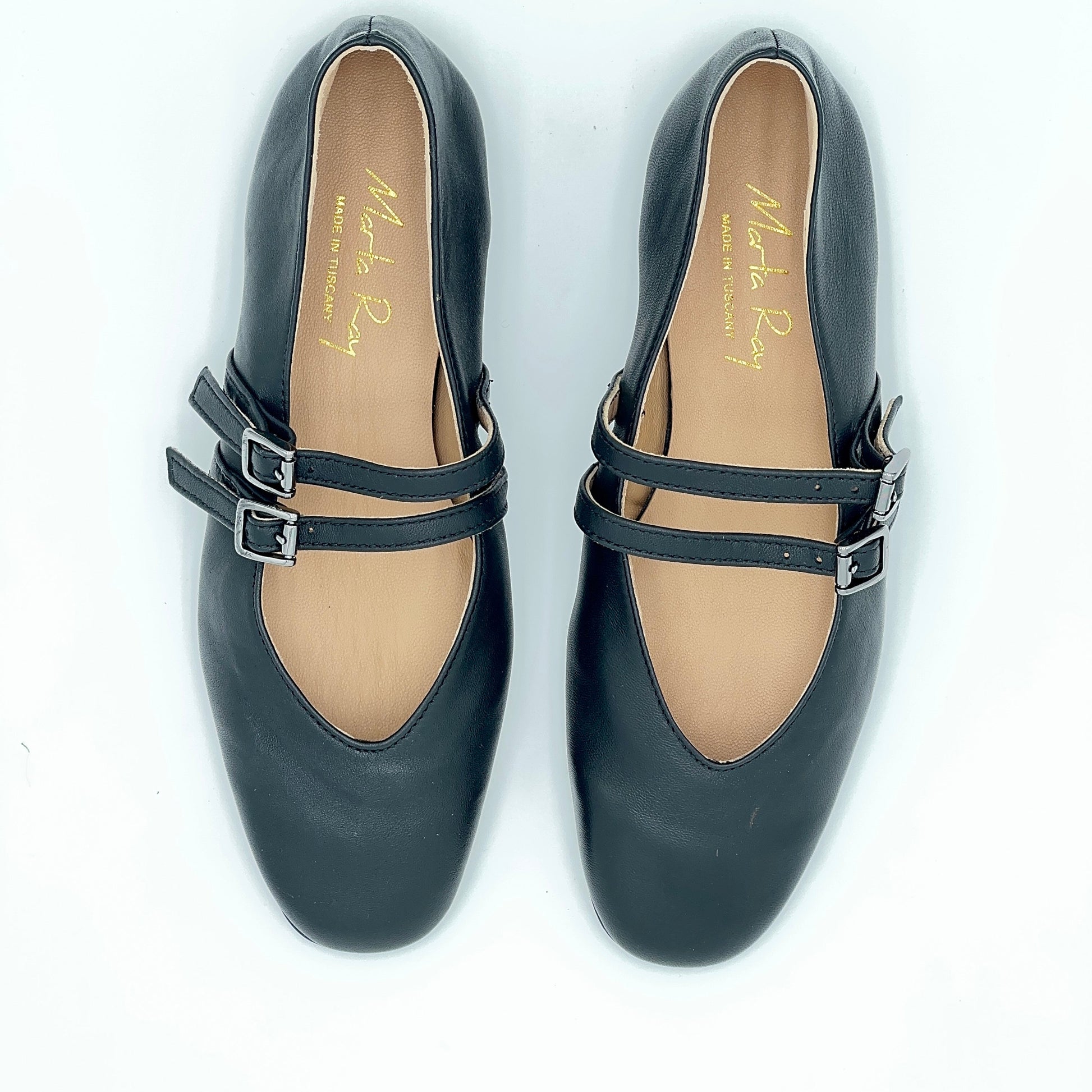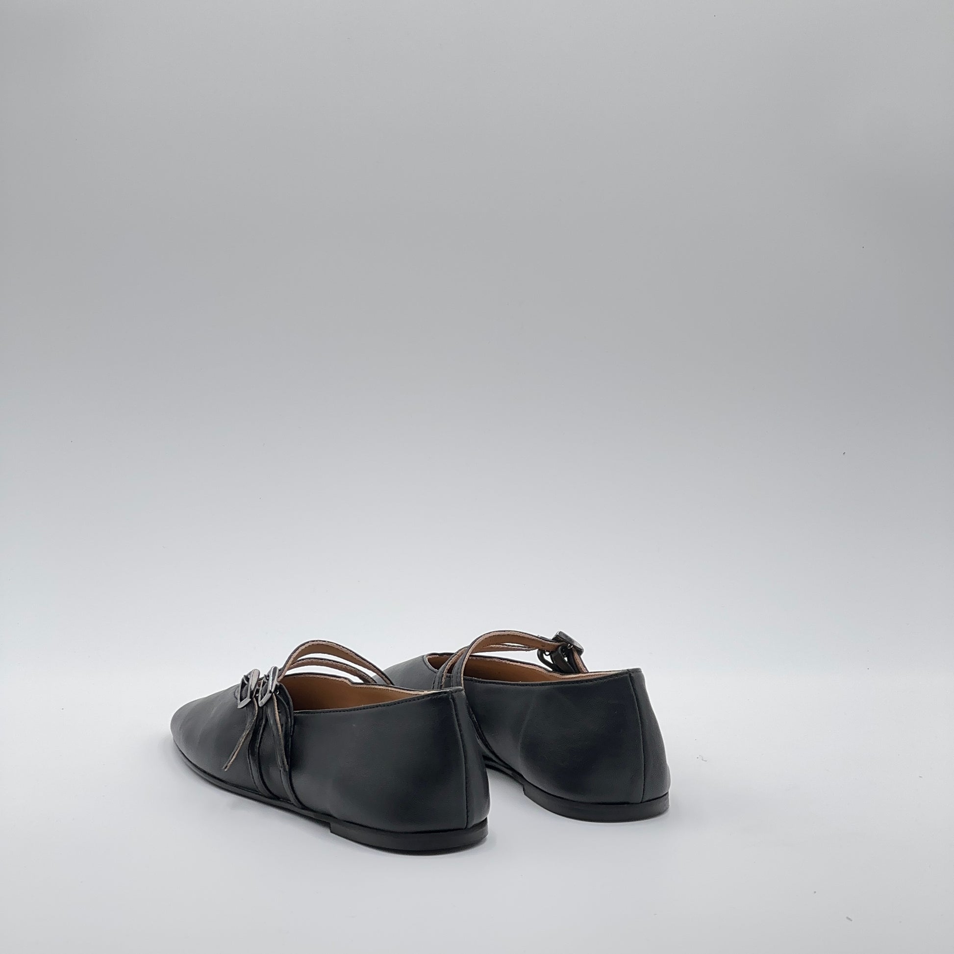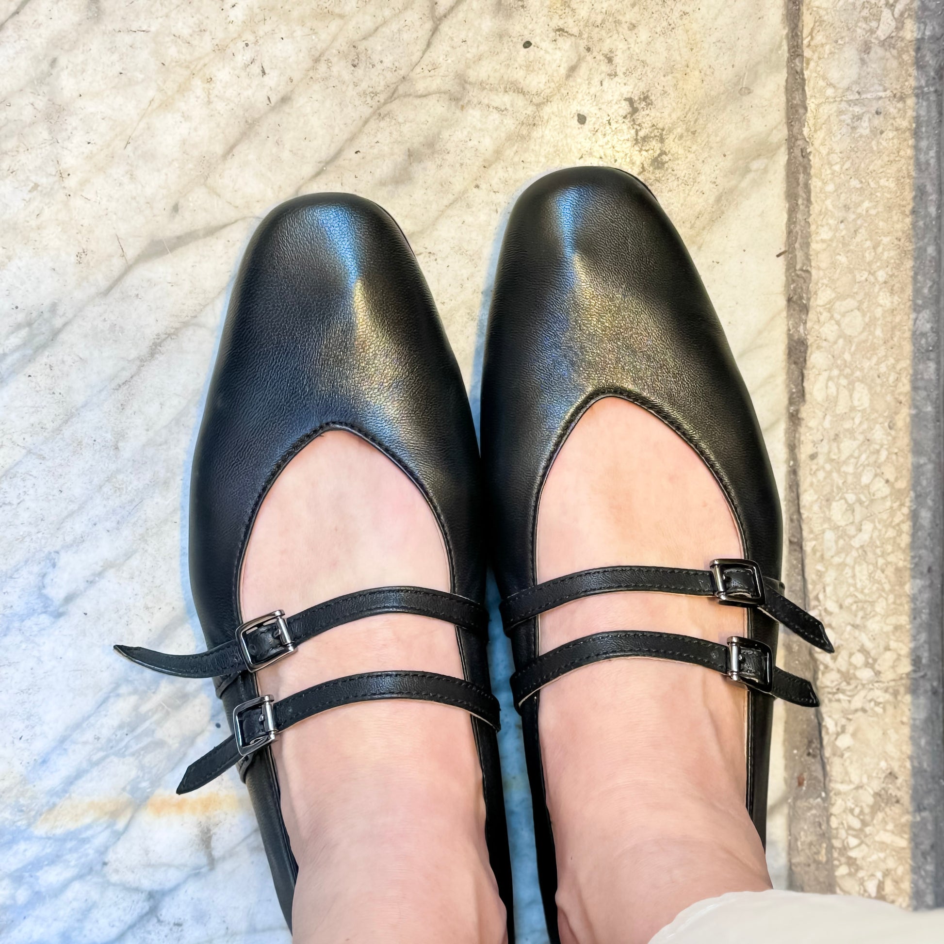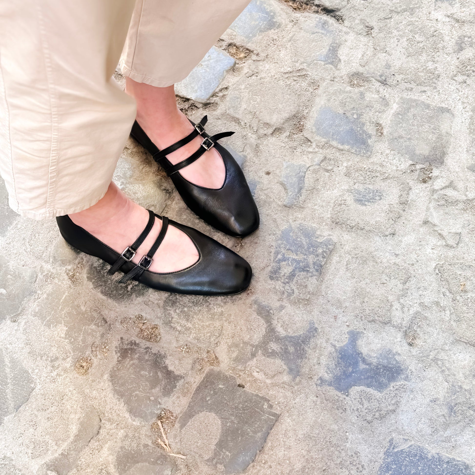 Ballerina doppio cinturino in morbida nappa nera, elegante e senza tempo. Cinturini in pelle tono su tono con fibbia regolabile.