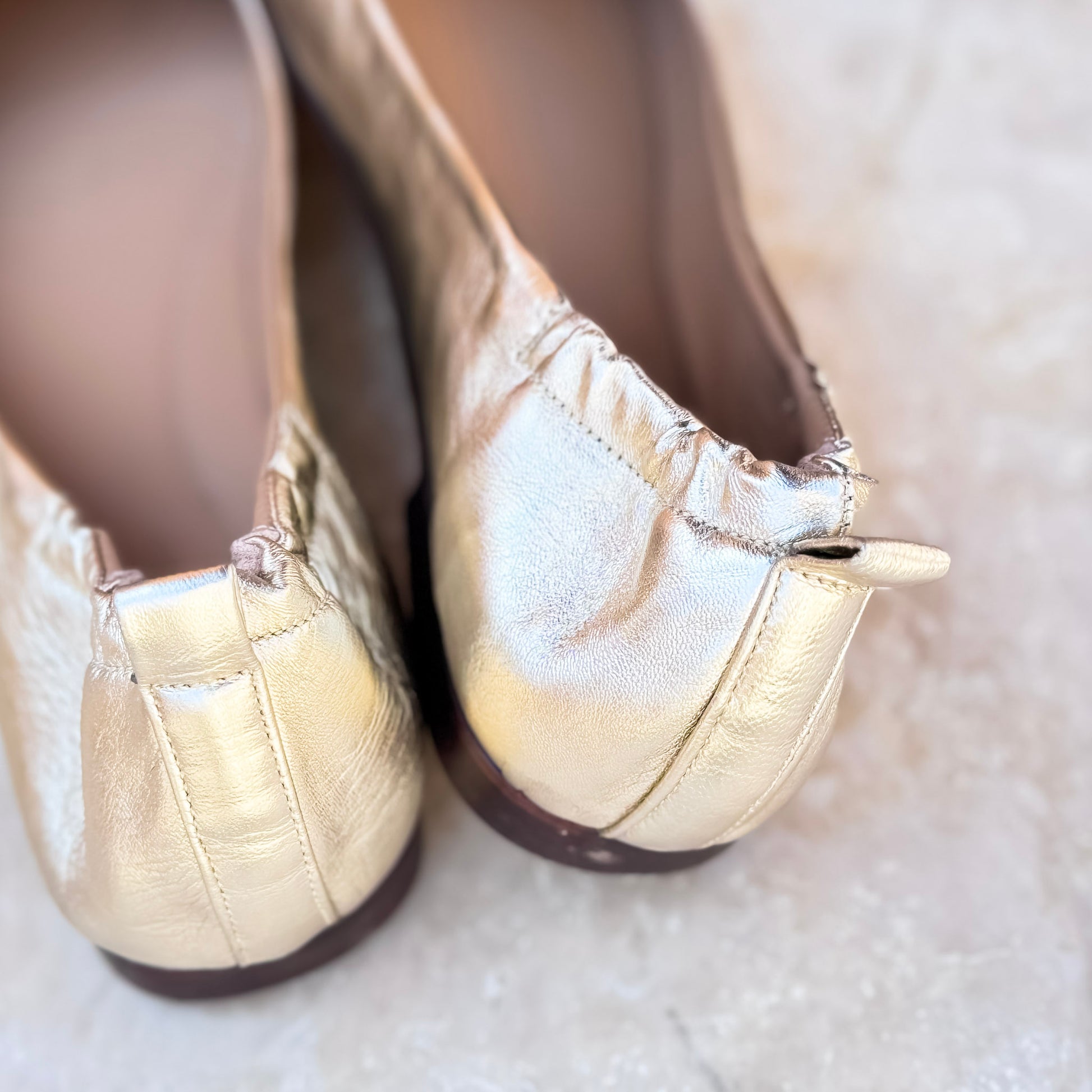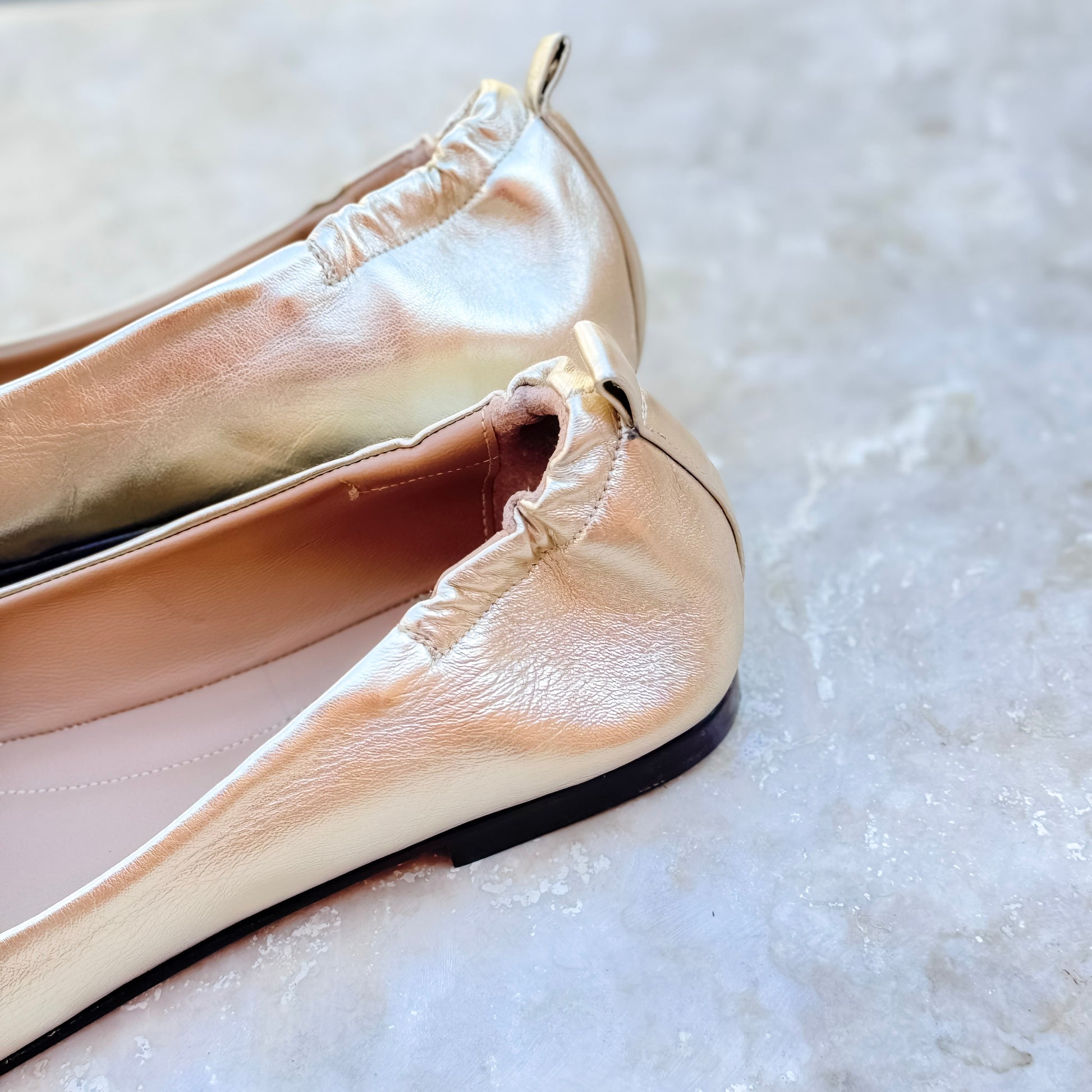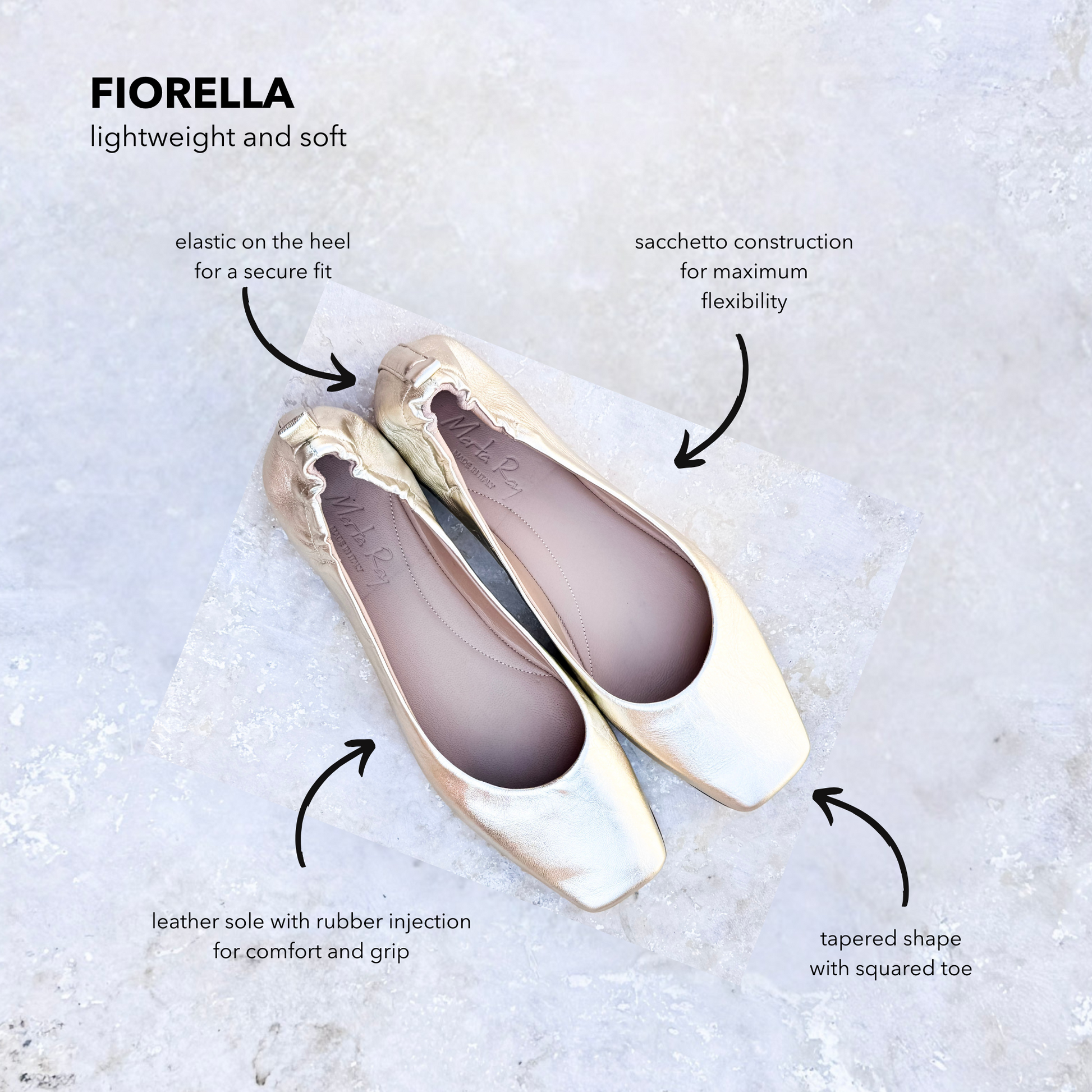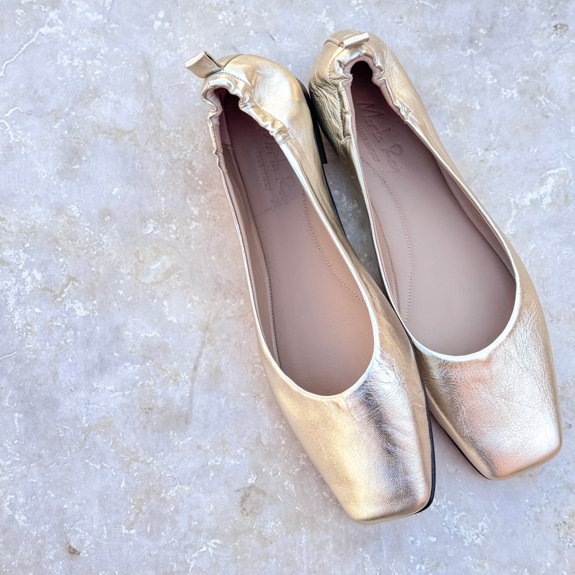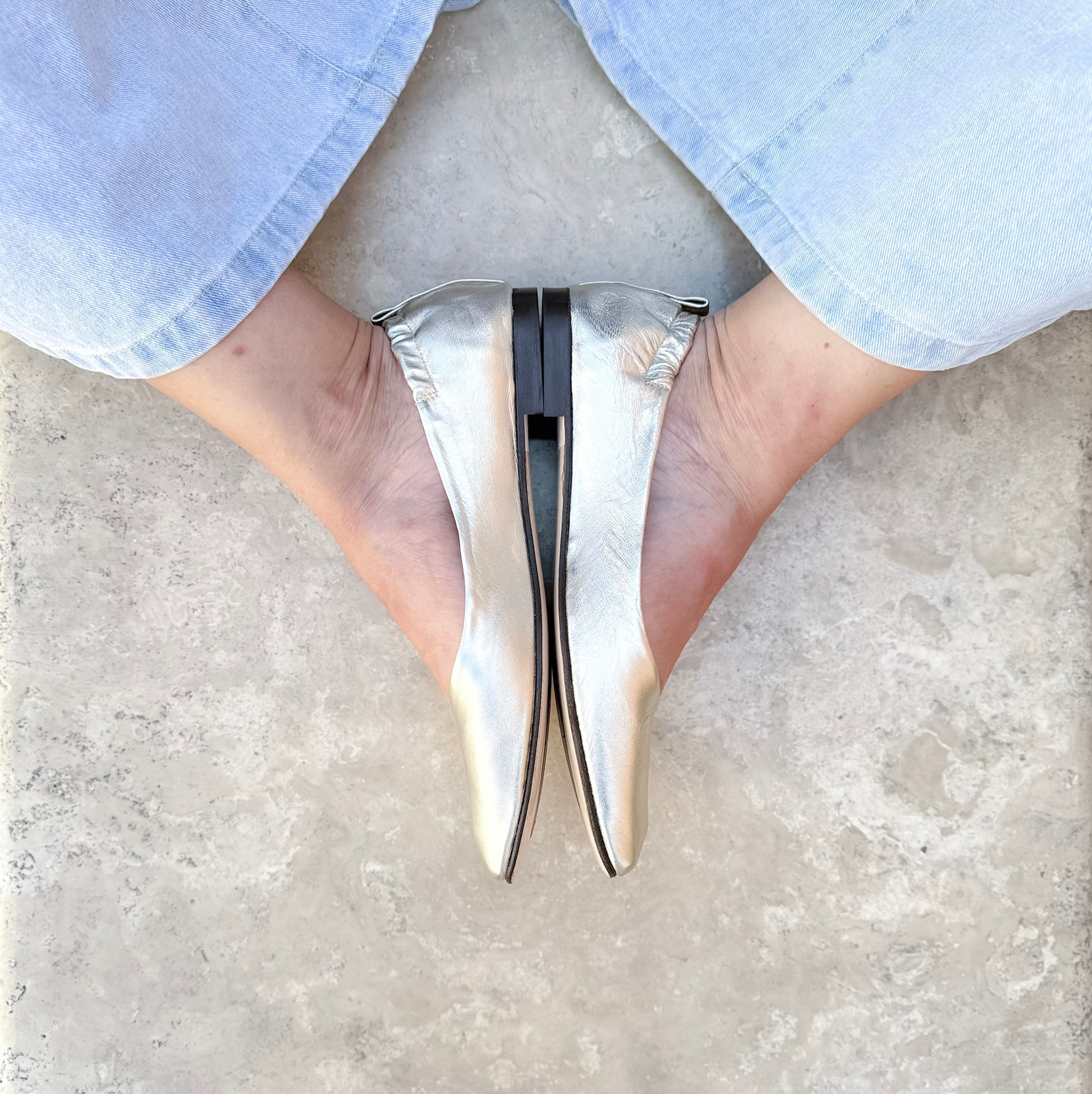Ballerina a punta quadrata in pelle laminata platino con costruzione a sacchetto. Calzata comoda e flessibile, fondo in cuoio con goccia di gomma iniettata.