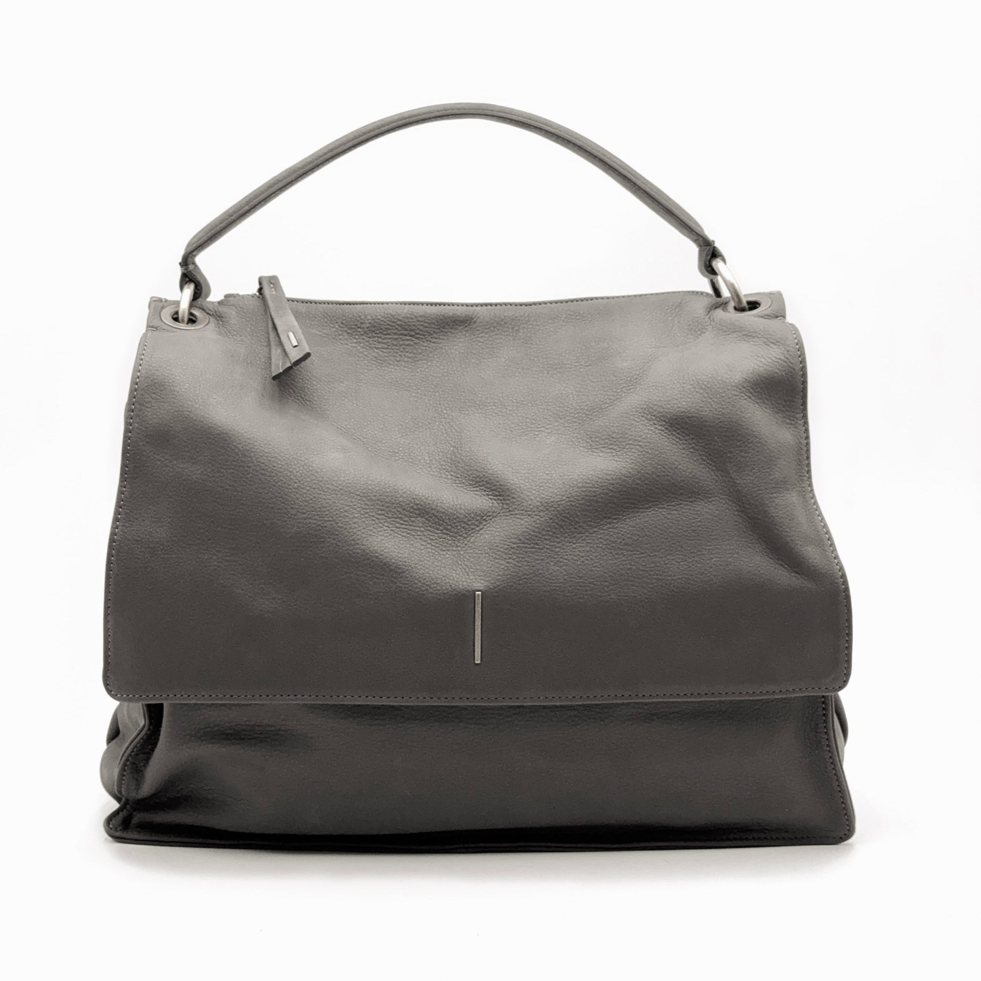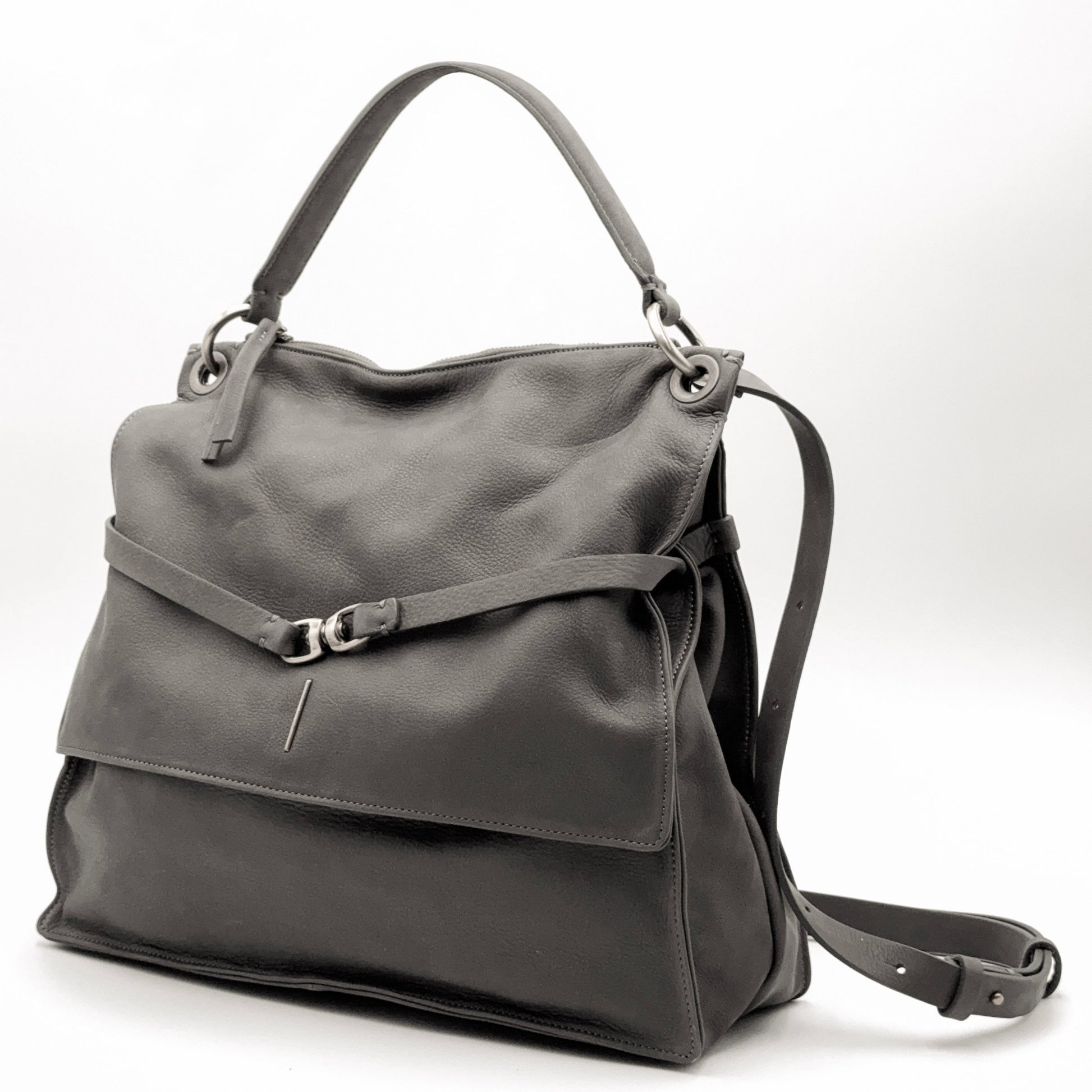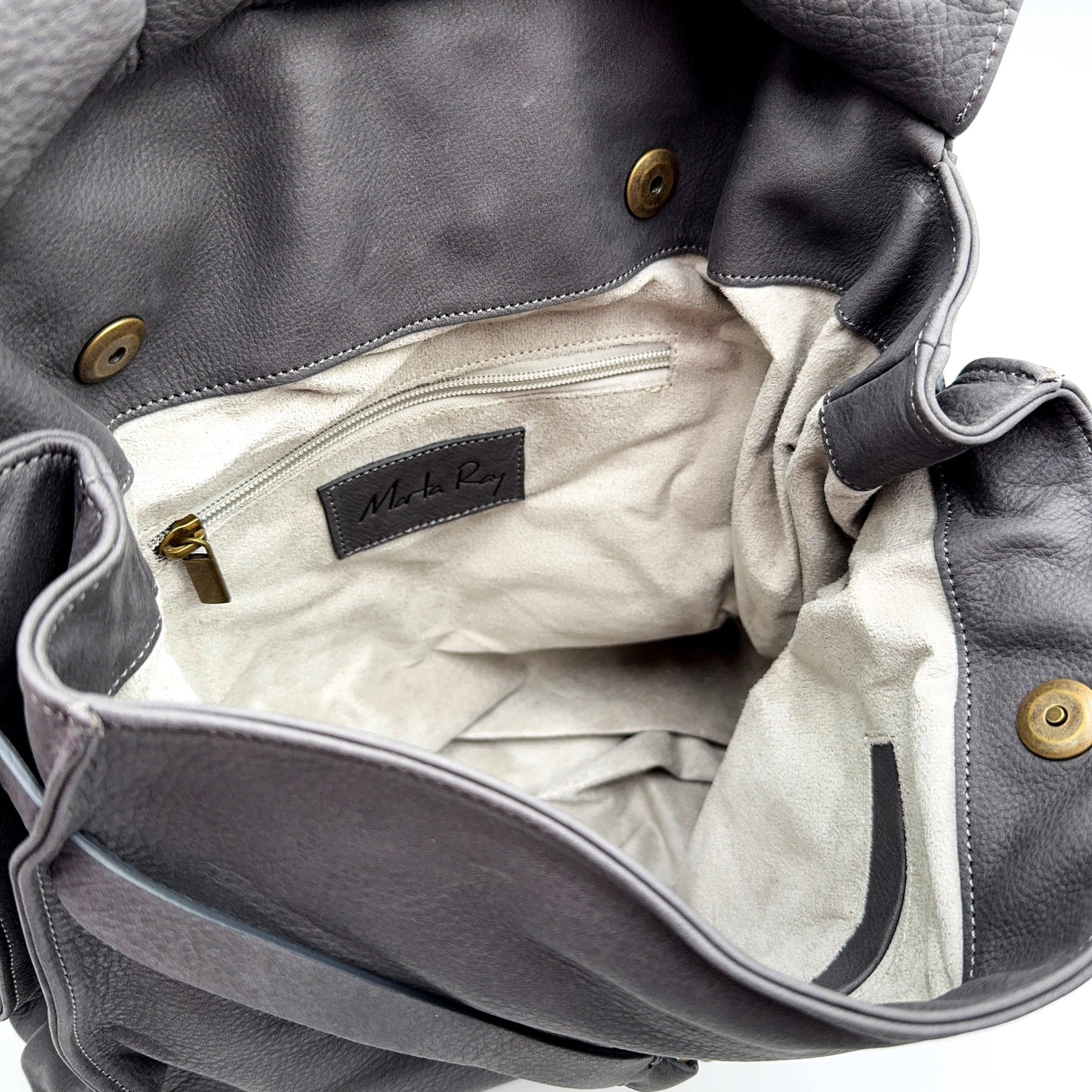 Bordi cuciti e rimboccati per dare un tocco morbido, vari rinforzi cuciti a mano e la patta doppiata che nasconde una ampia apertura con doppia chiusura magnetica