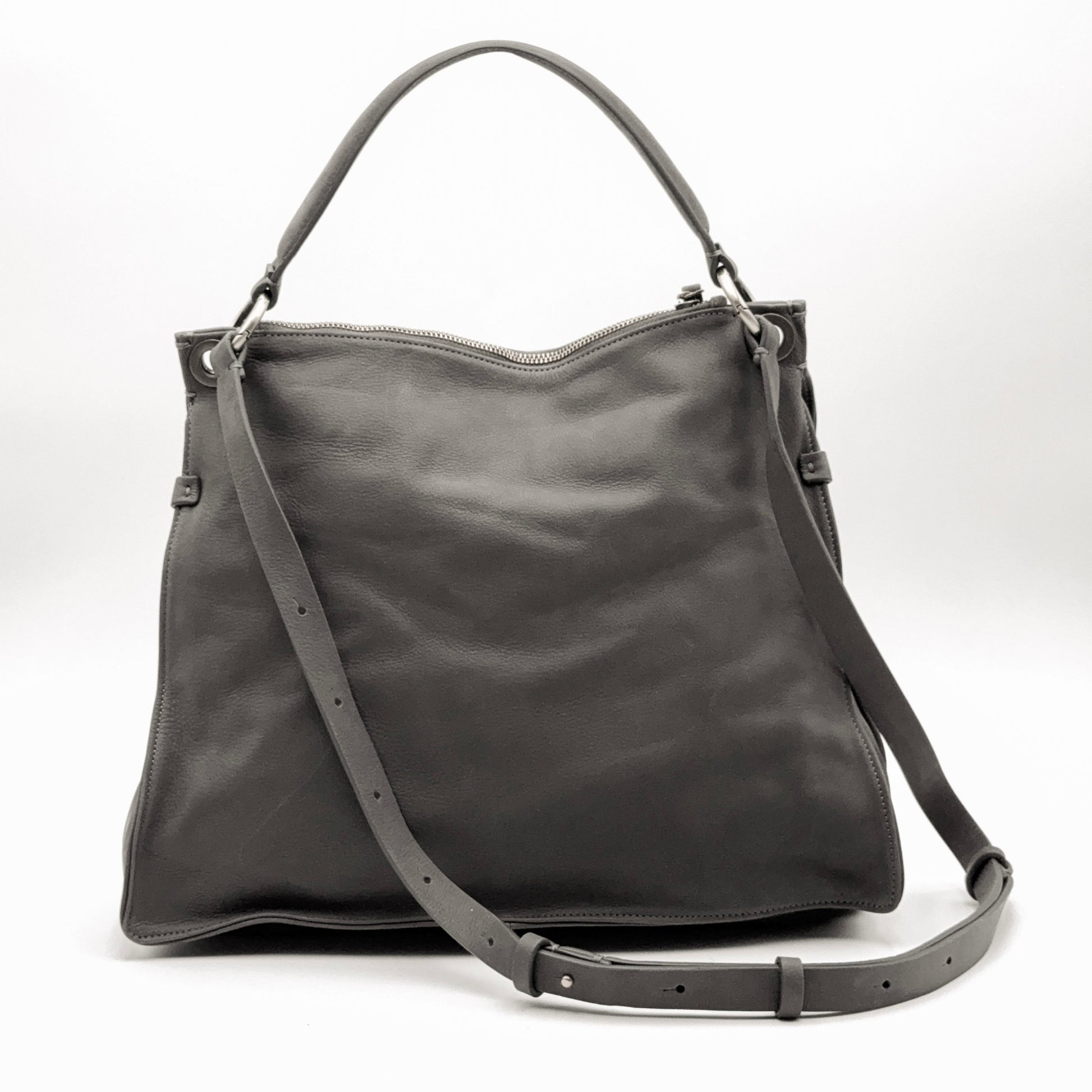 Tracolla rimovibile e regolabile, manico leggermente imbottito, foderata in micro fibra chiara. Accessori in ottone spazzolato.