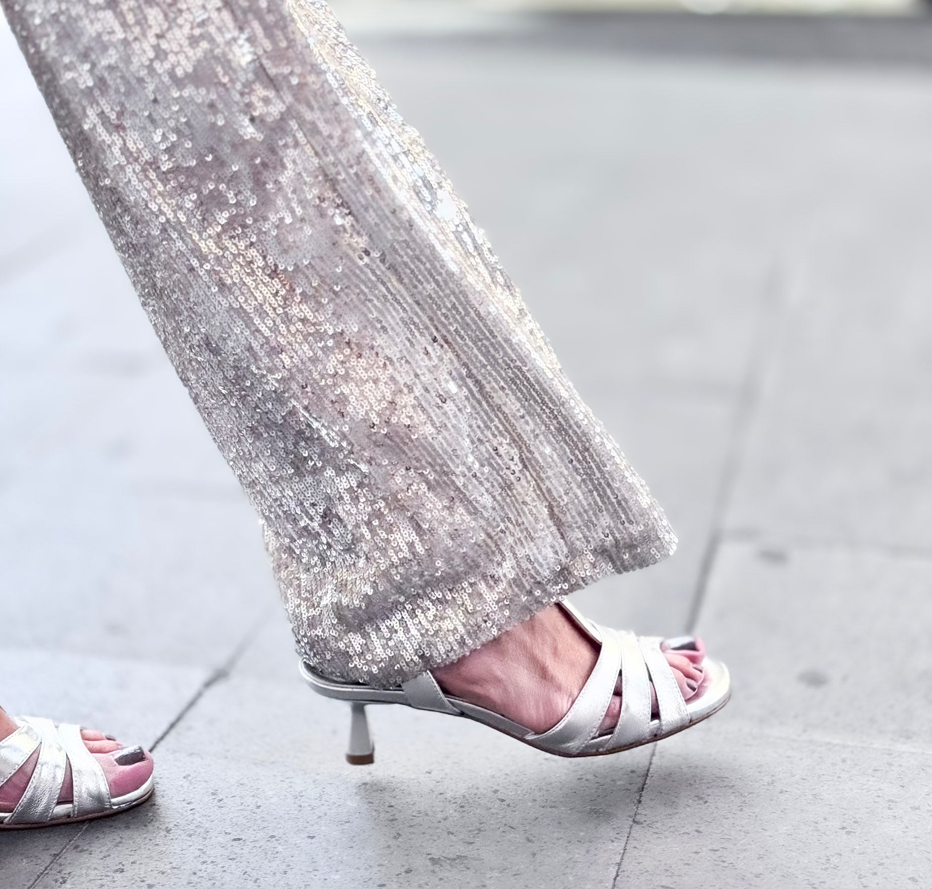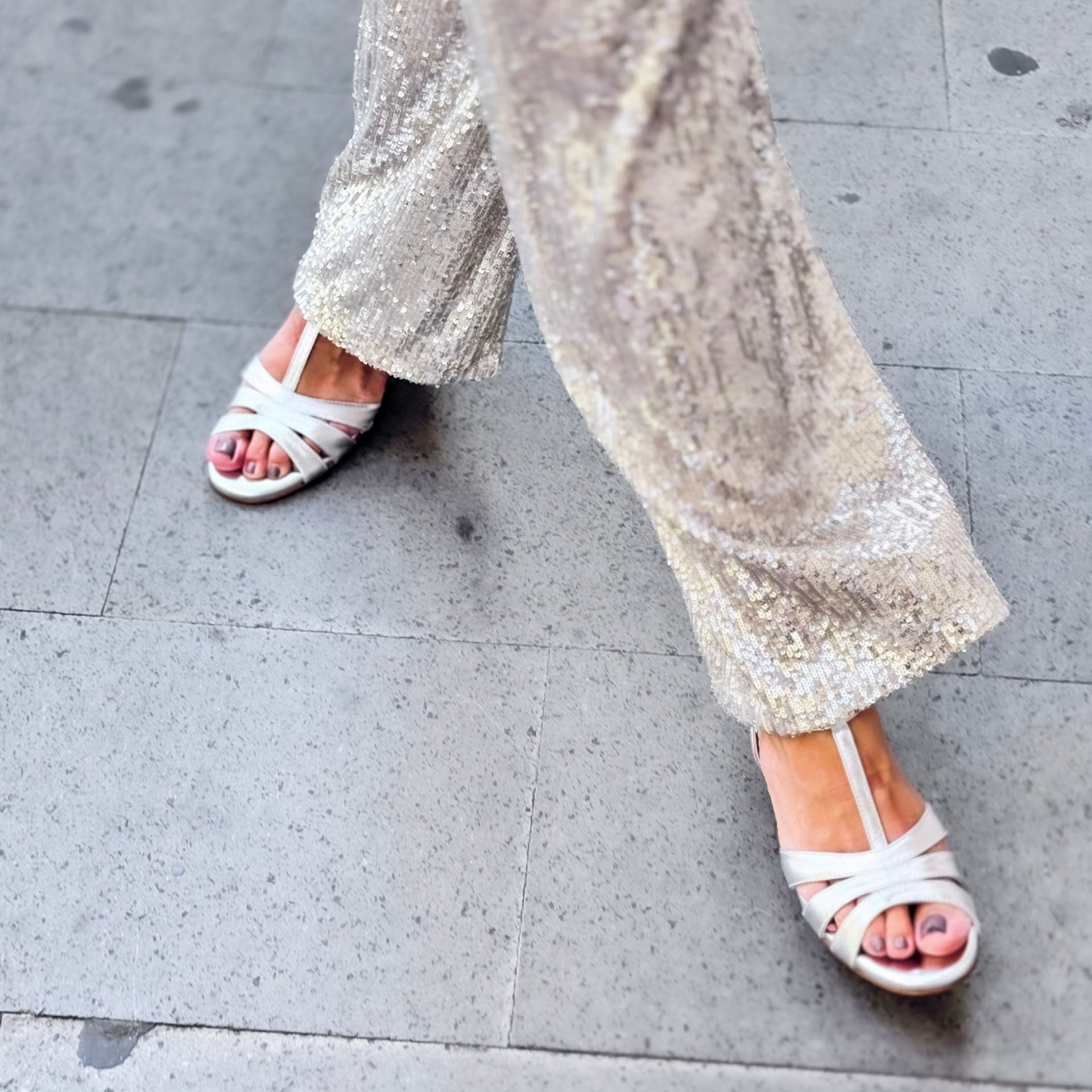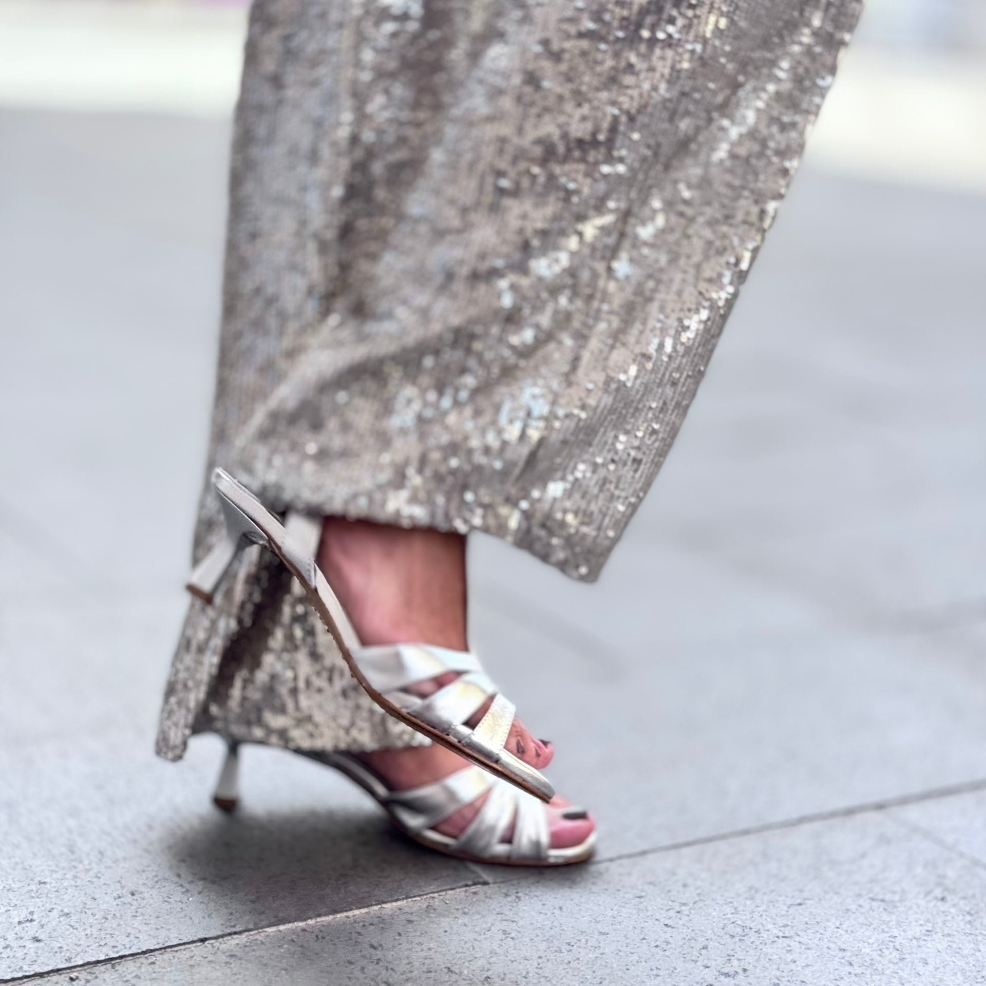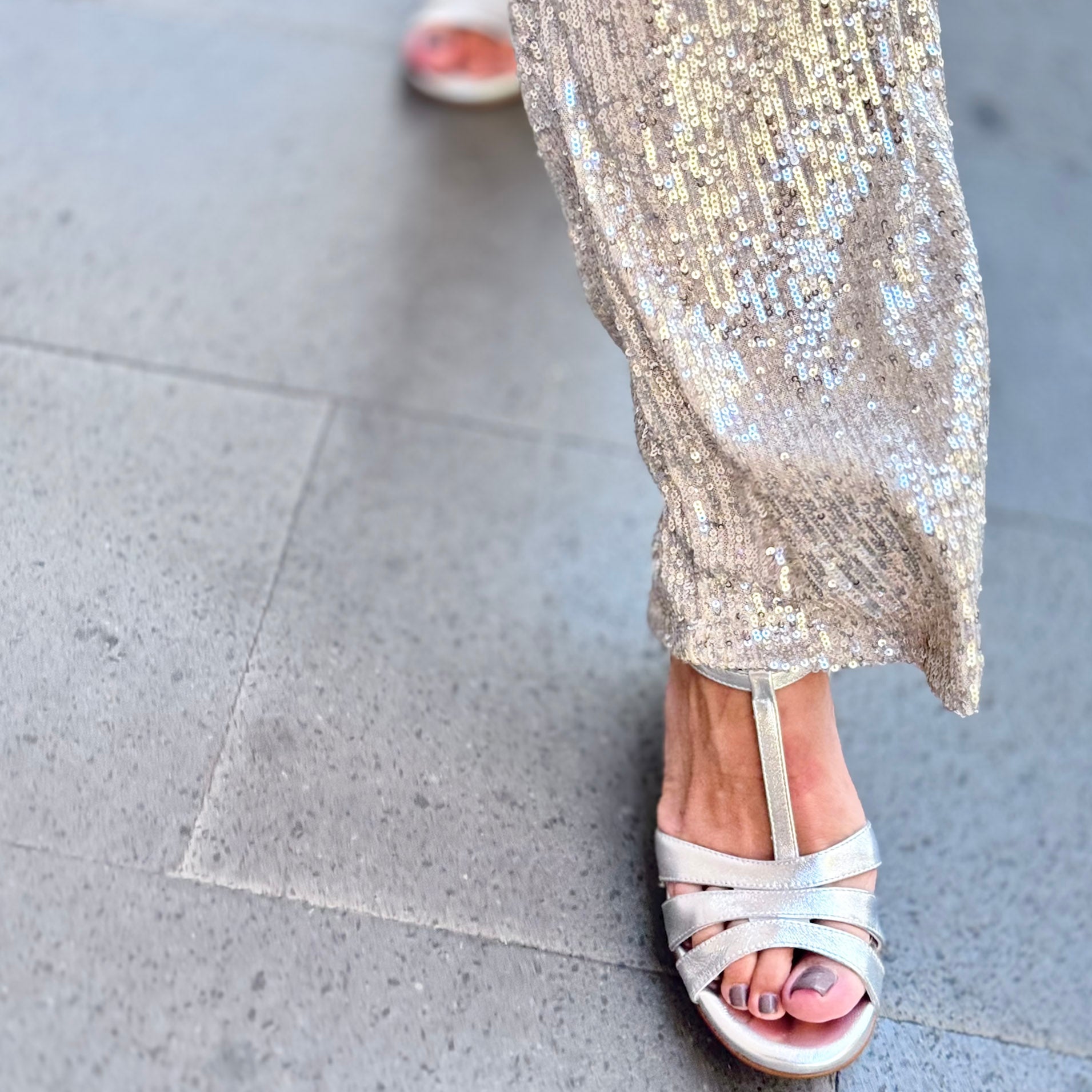 Sandalo in pelle laminata color argento, con T-strap e cinturino raccordato e regolabile alla caviglia. Tacco rivestito, alto 6 cm. Suola in vero cuoio ecologico, Made in Italy.
