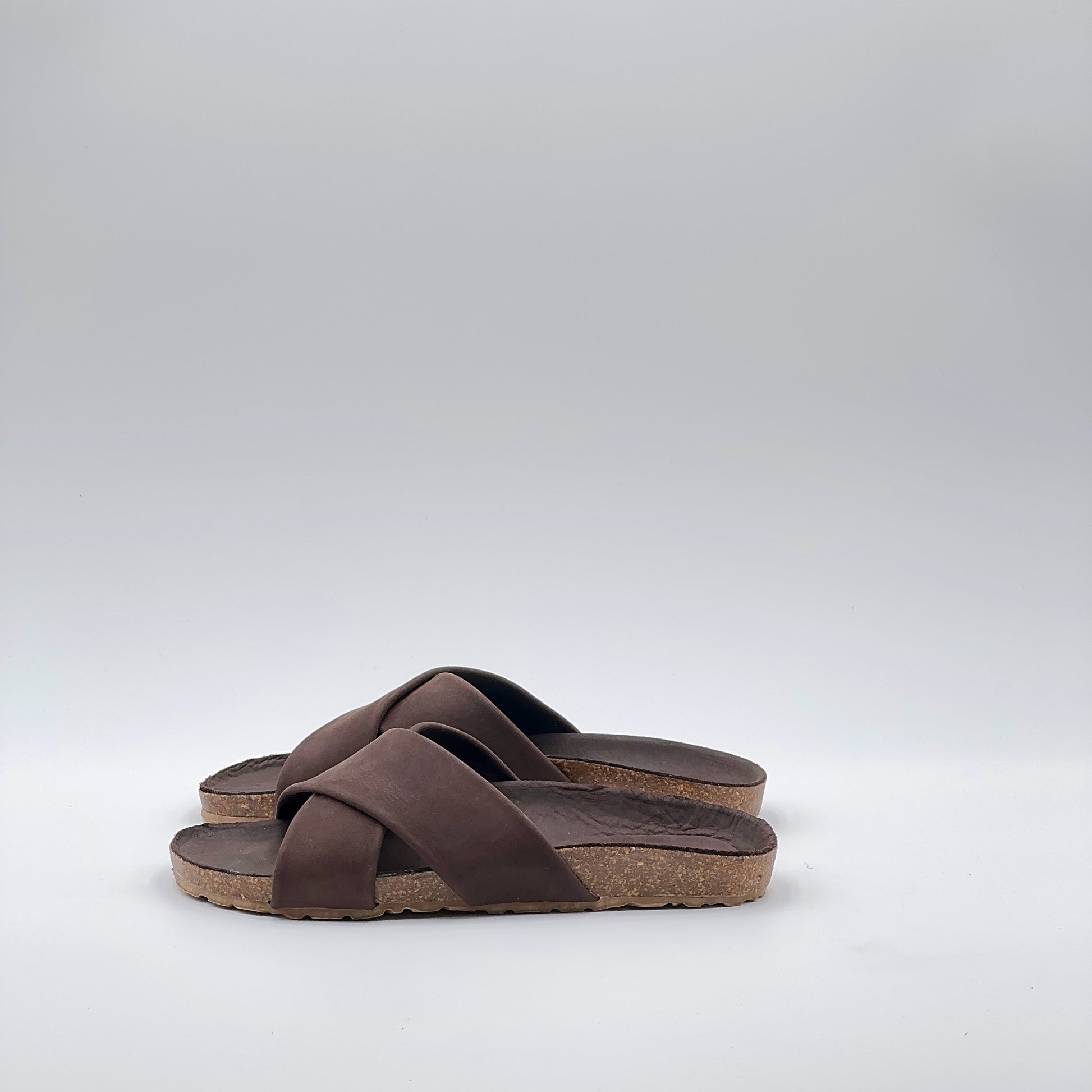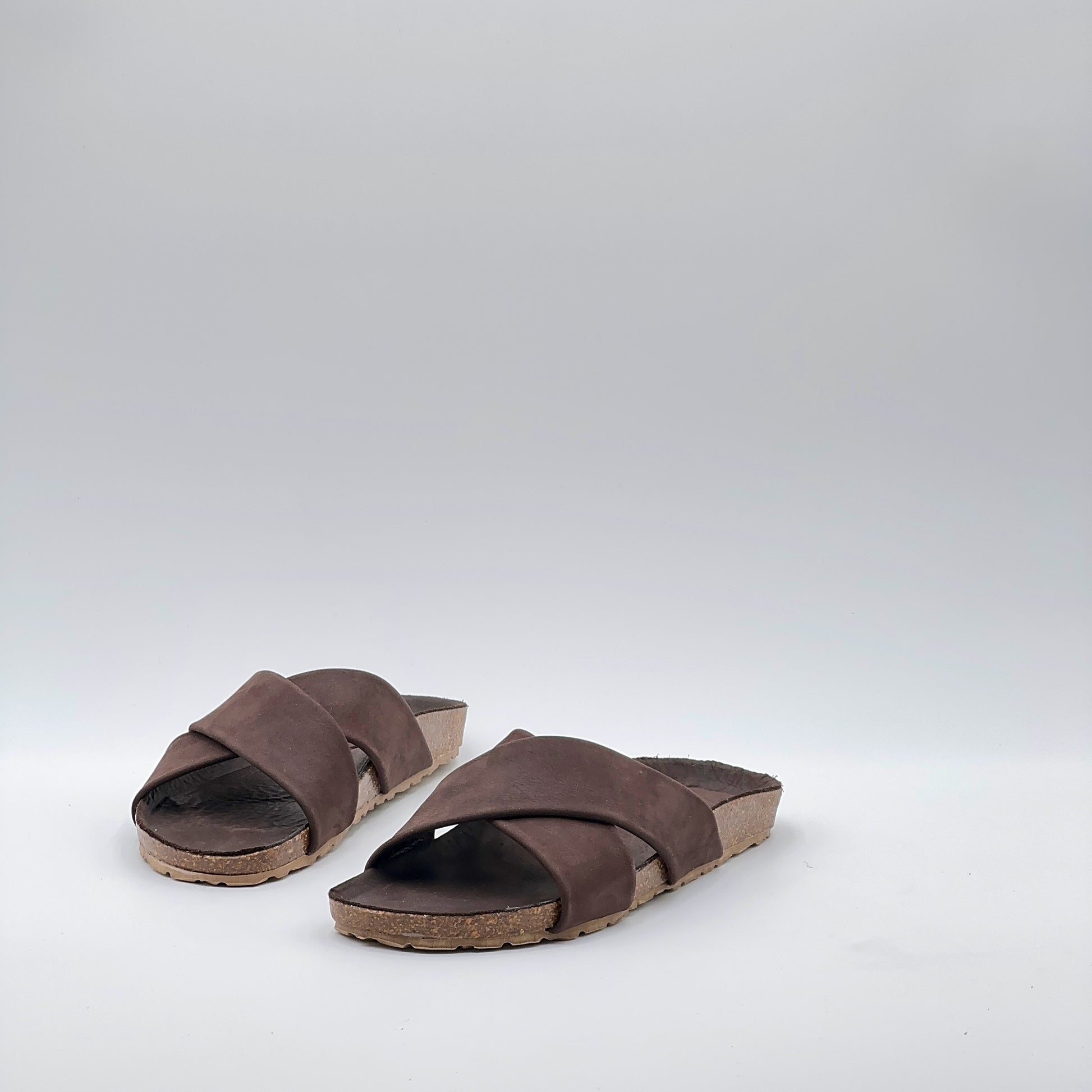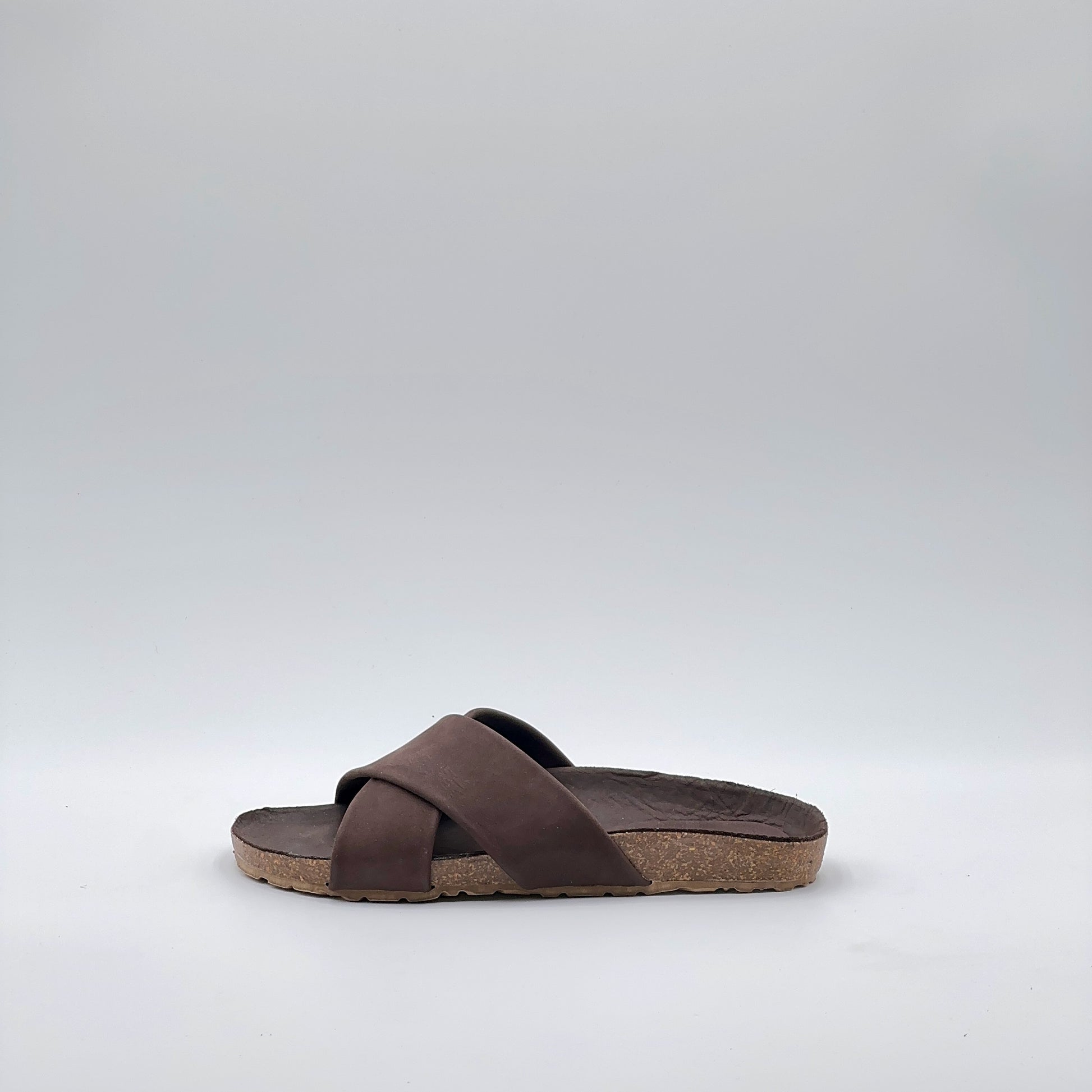 Sandalo flat con suola ergonomica rivestita in pelle Long Beach color testa di moro, come la tomaia. Le fasce incrociate dal design pulito abbracciano il piede con comfort naturale.