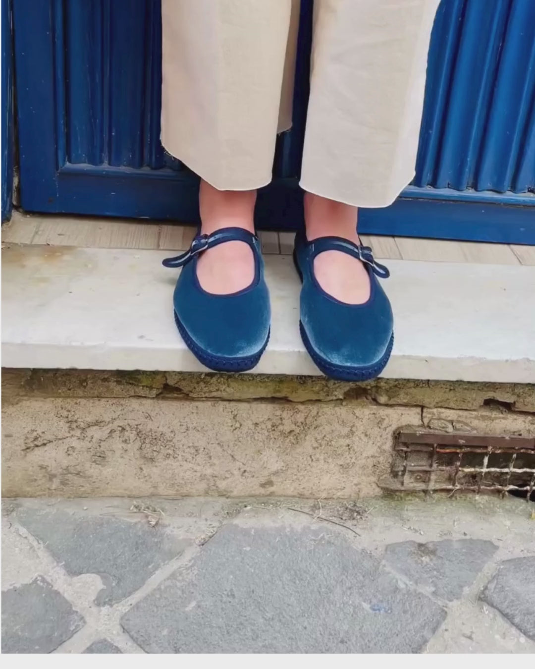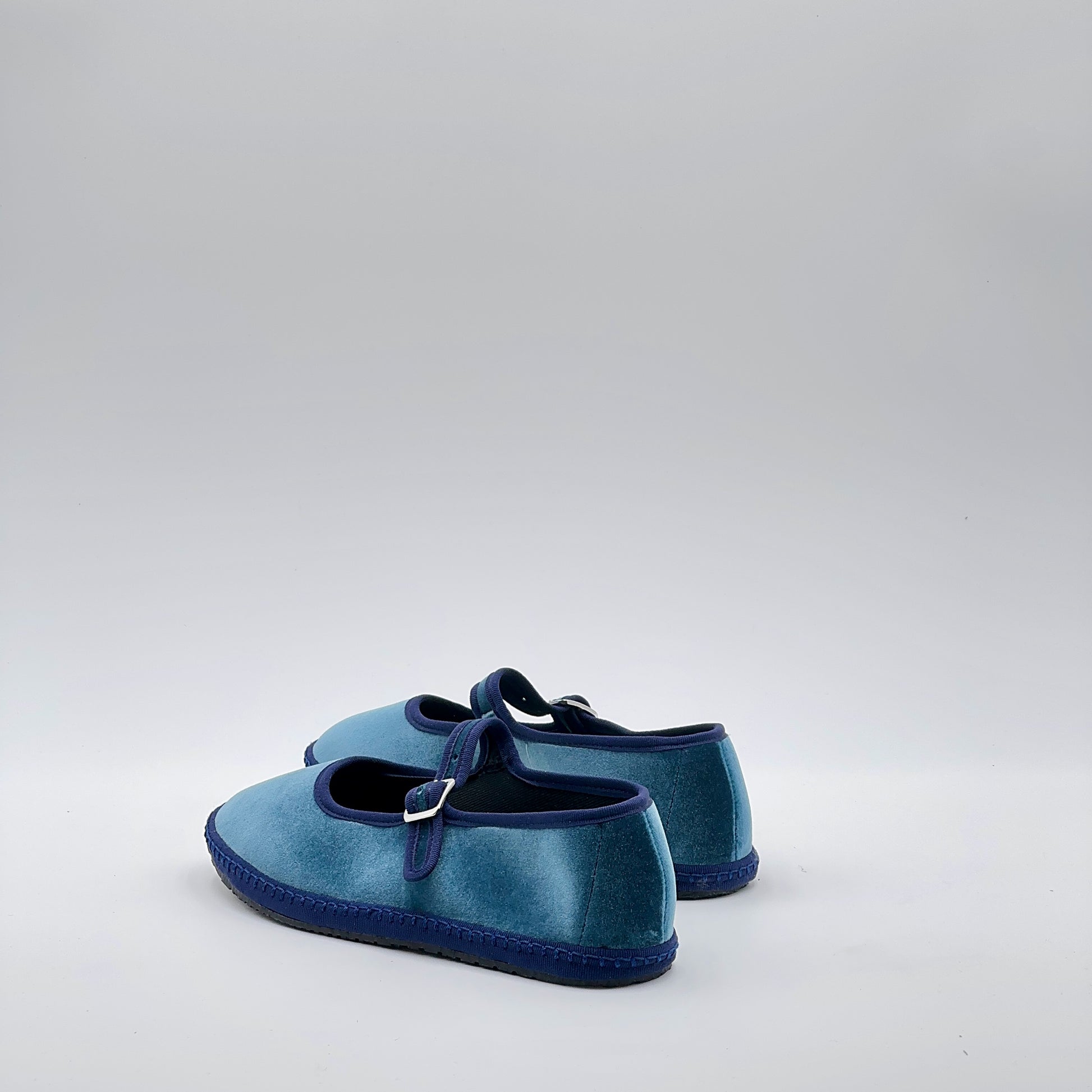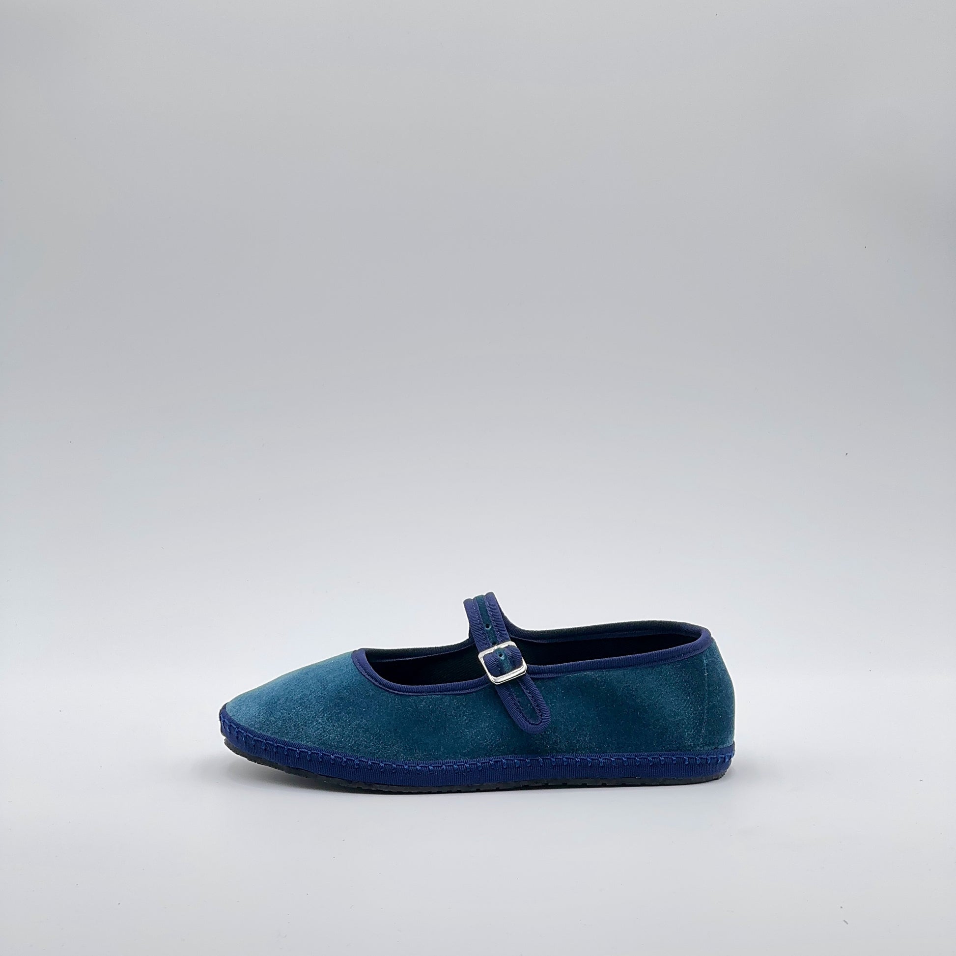 Friulana Mary Jane in velluto carta da zucchero, con interno in cotone nero e sottopiede in pelle. Suola in gomma cucita, chiusura con fibbia regolabile.