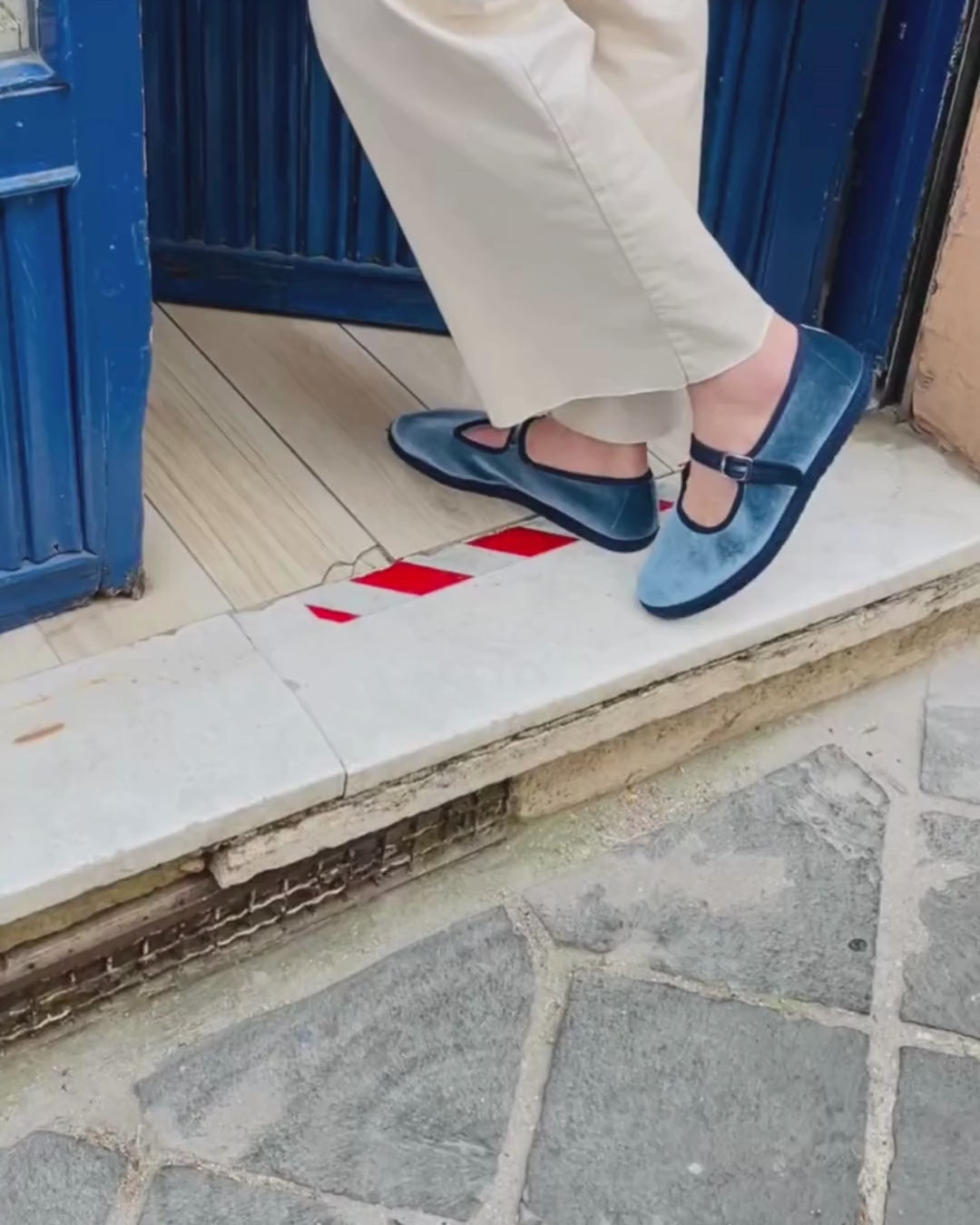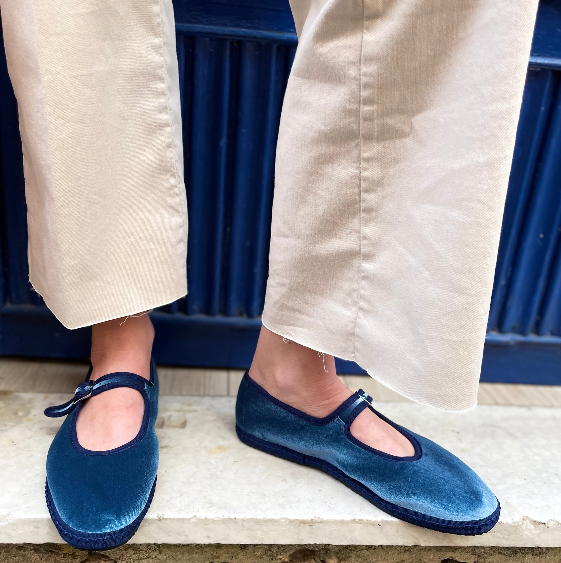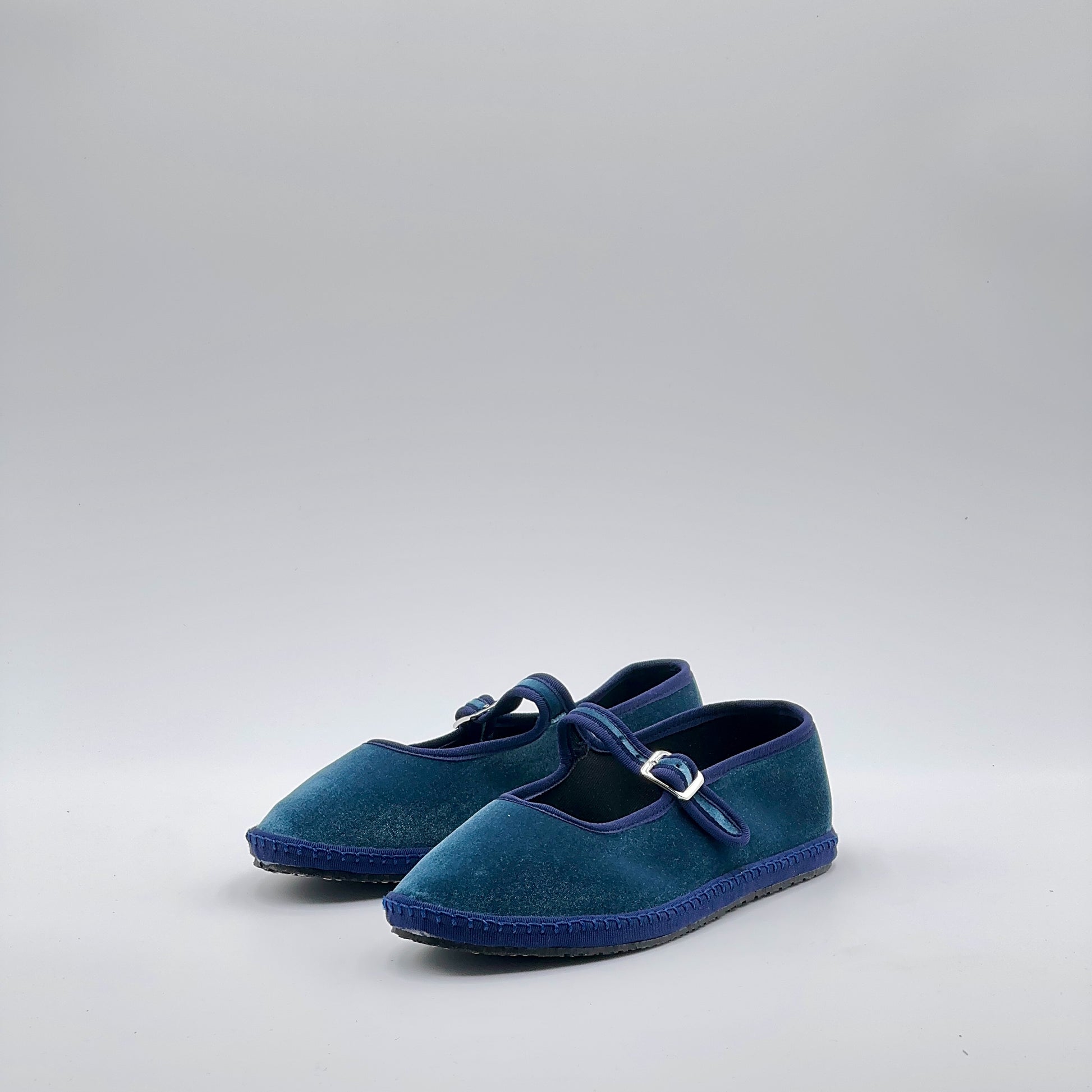 Friulana Mary Jane in velluto carta da zucchero, con interno in cotone nero e sottopiede in pelle. Suola in gomma cucita, chiusura con fibbia regolabile.