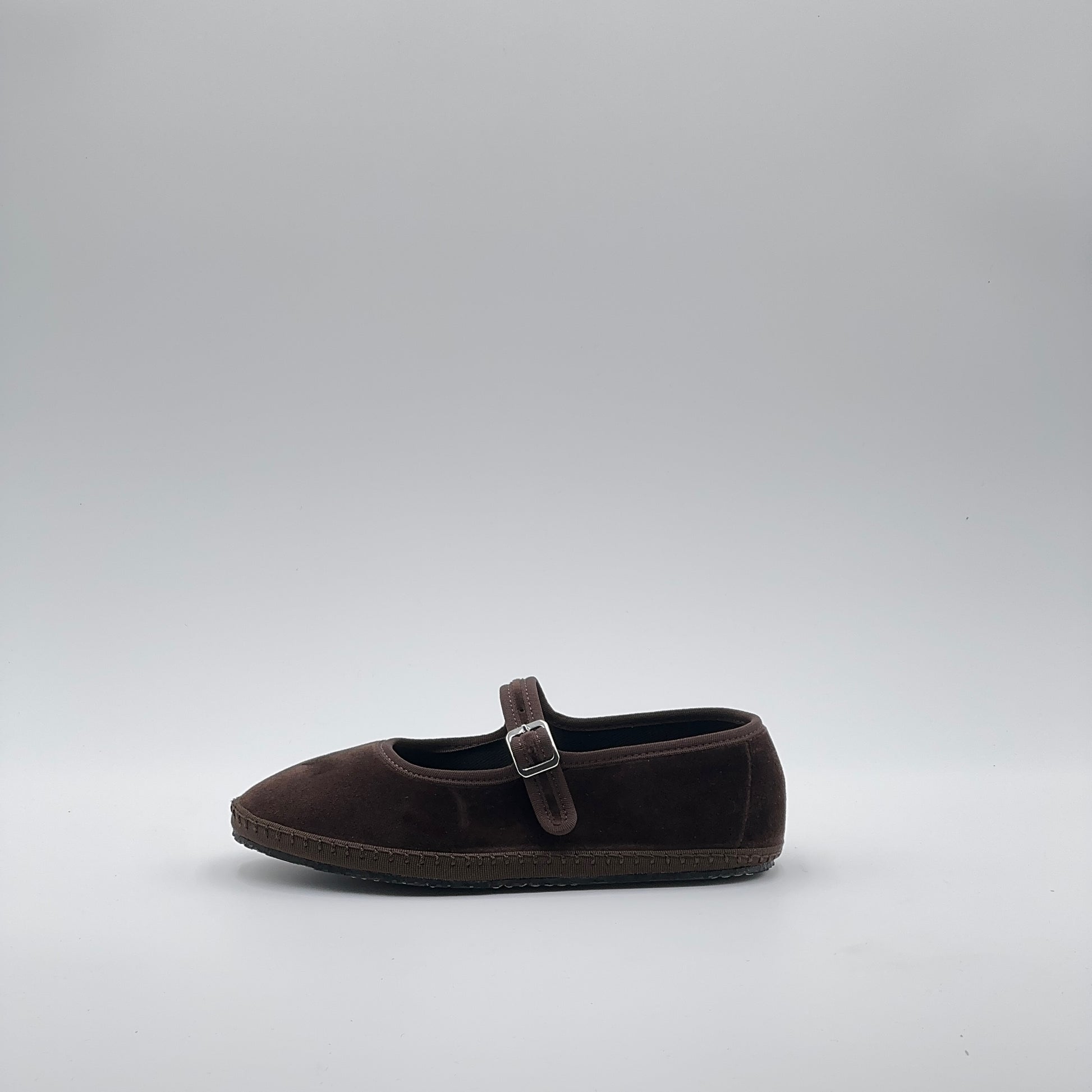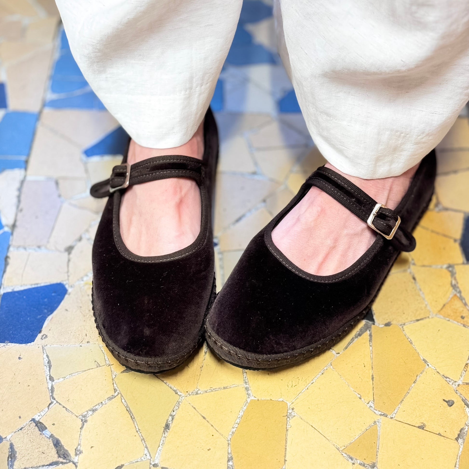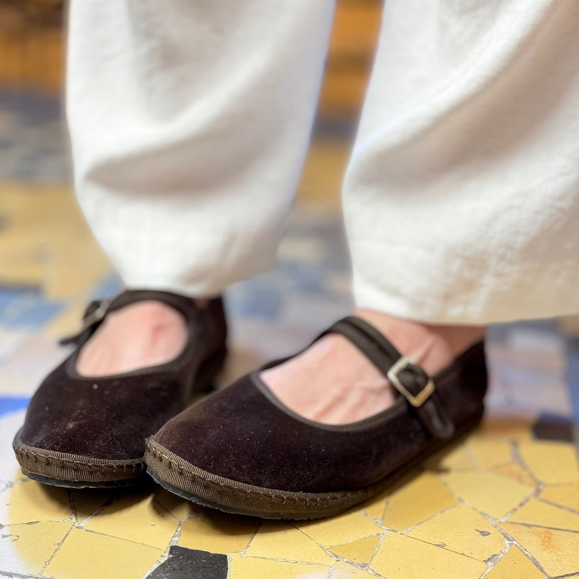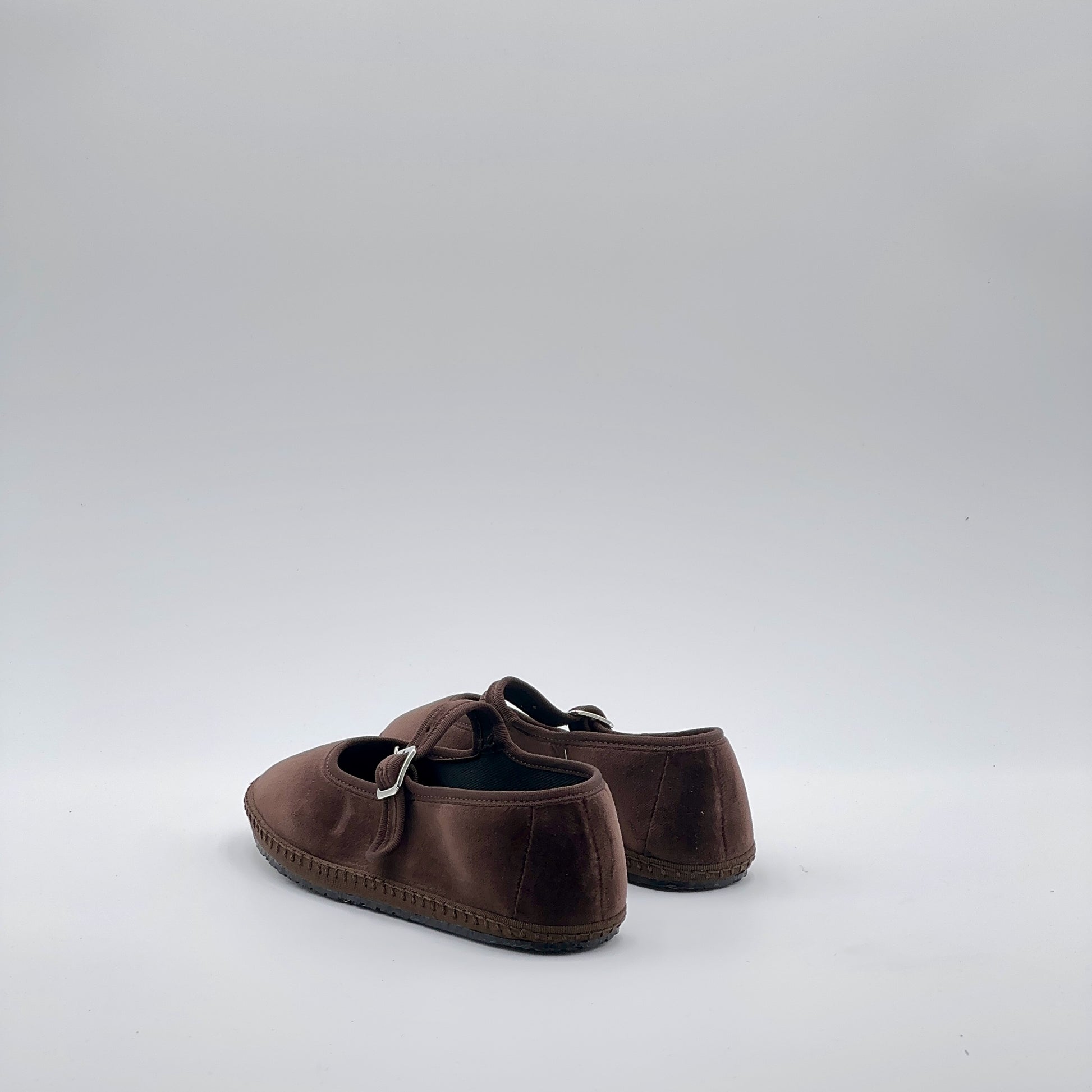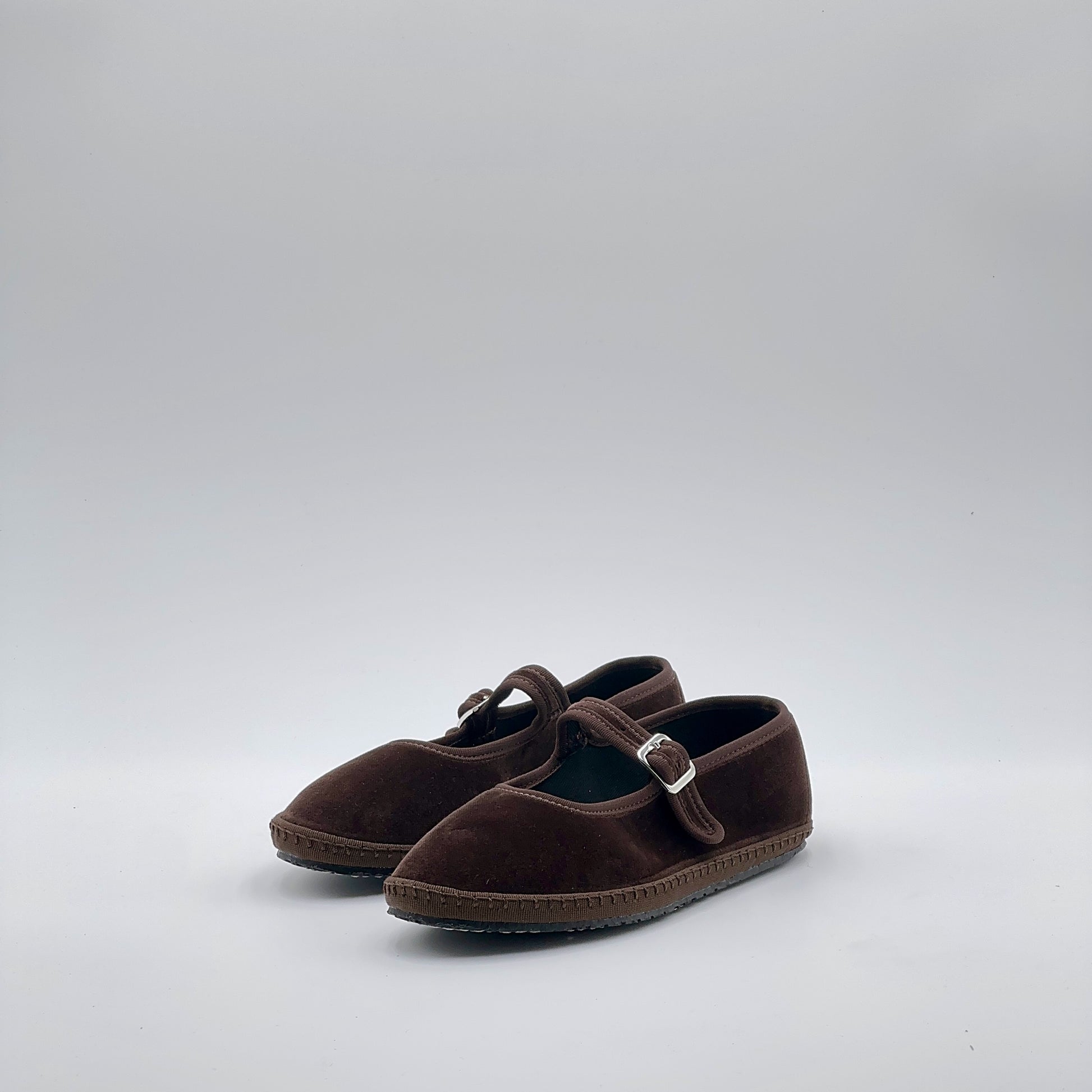 Friulana Mary Jane in velluto marrone, con interno in cotone nero e sottopiede in pelle. Chiusura con fibbia regolabile e suola in gomma cucita, comoda e resistente.