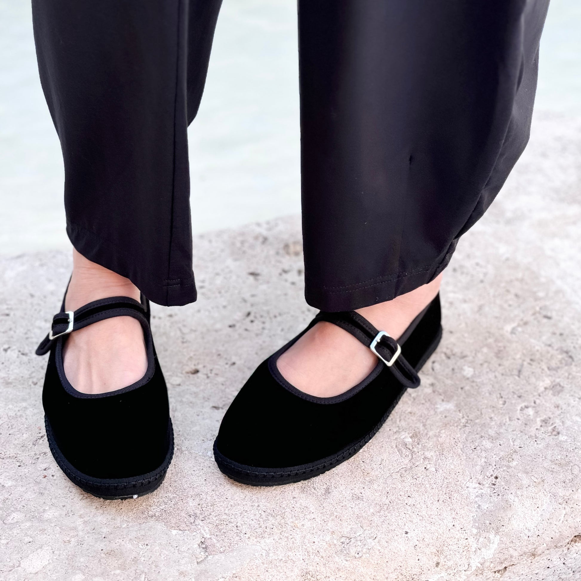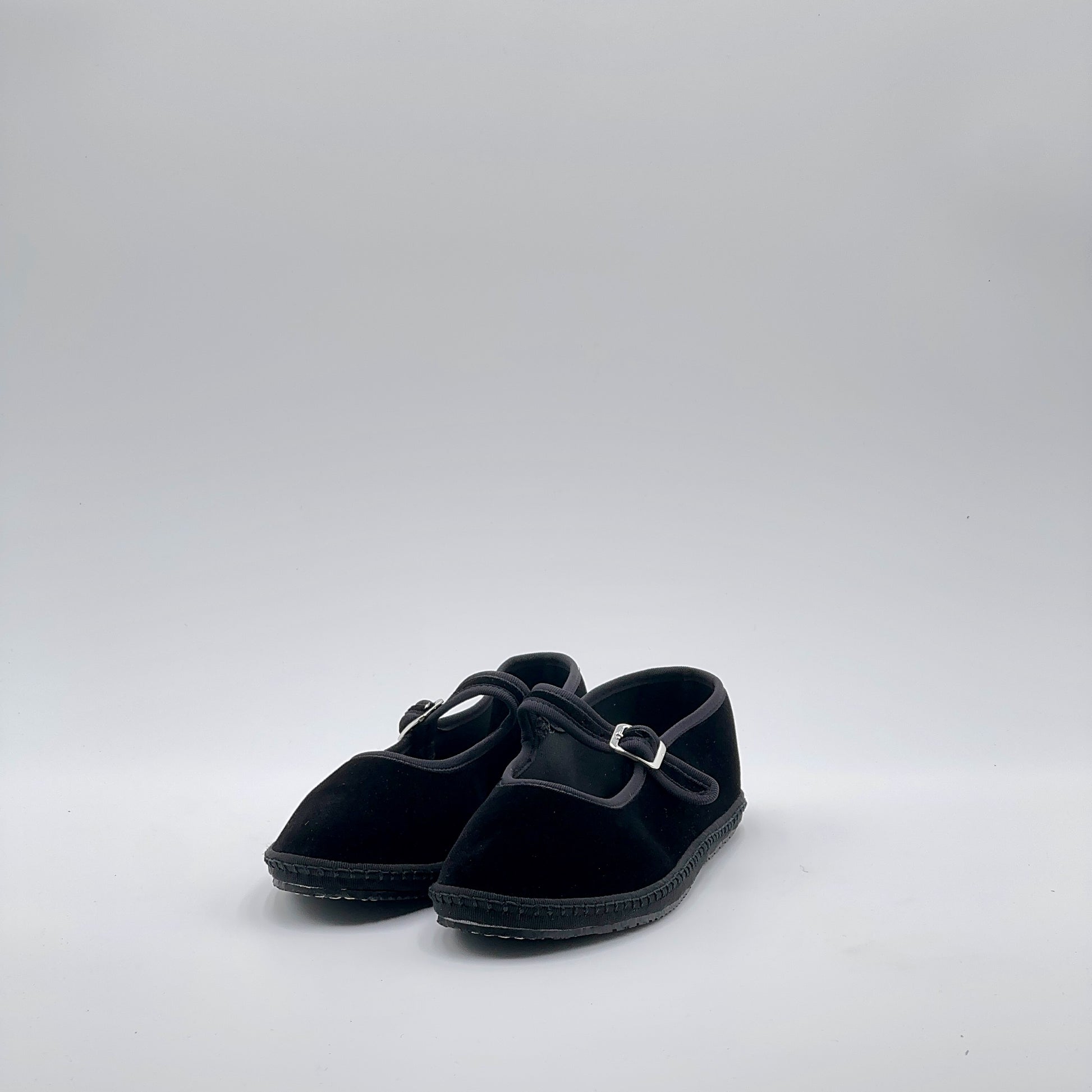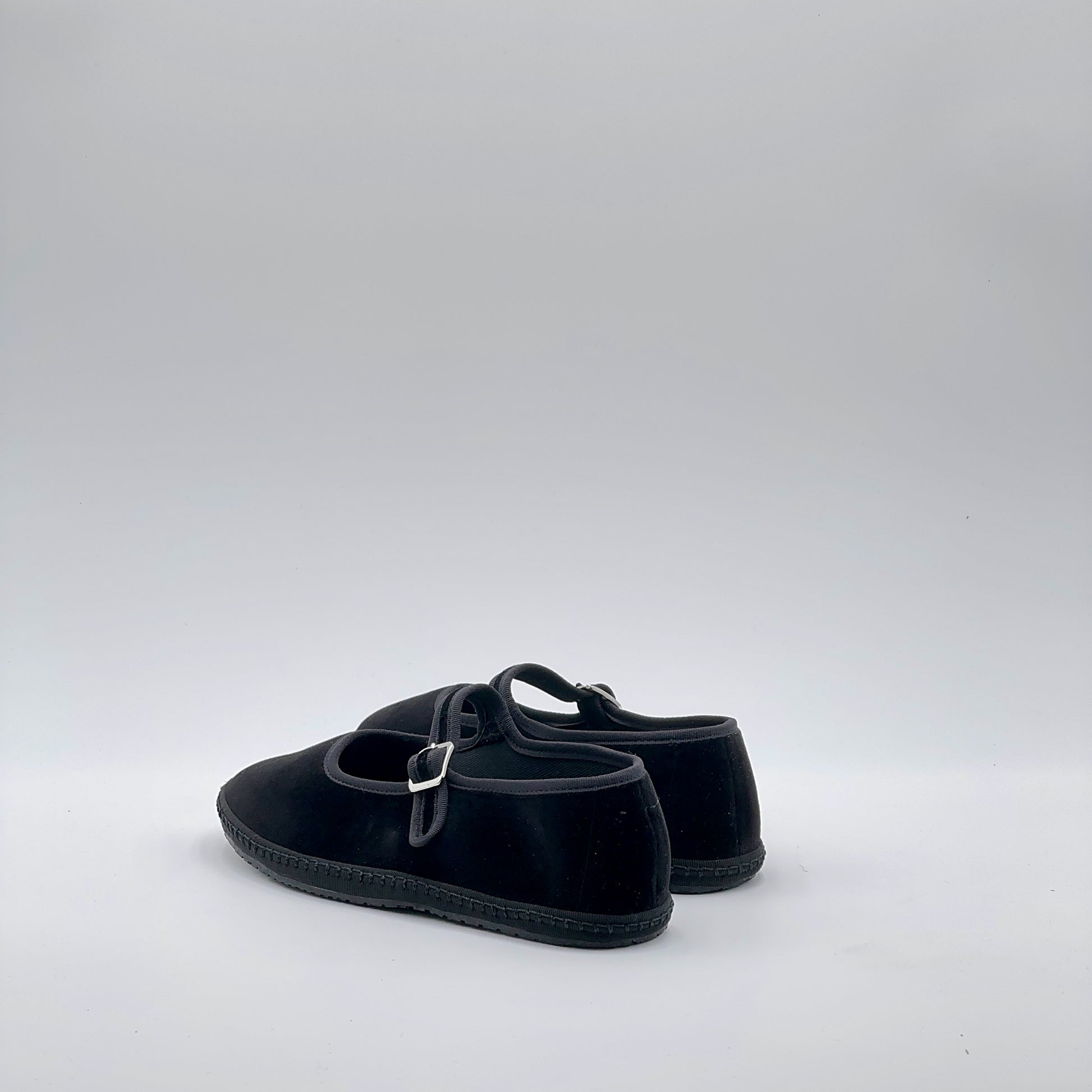 Friulana Mary Jane in velluto nero, con interno in cotone nero e sottopiede in pelle. Chiusura con fibbia regolabile e suola in gomma cucita.