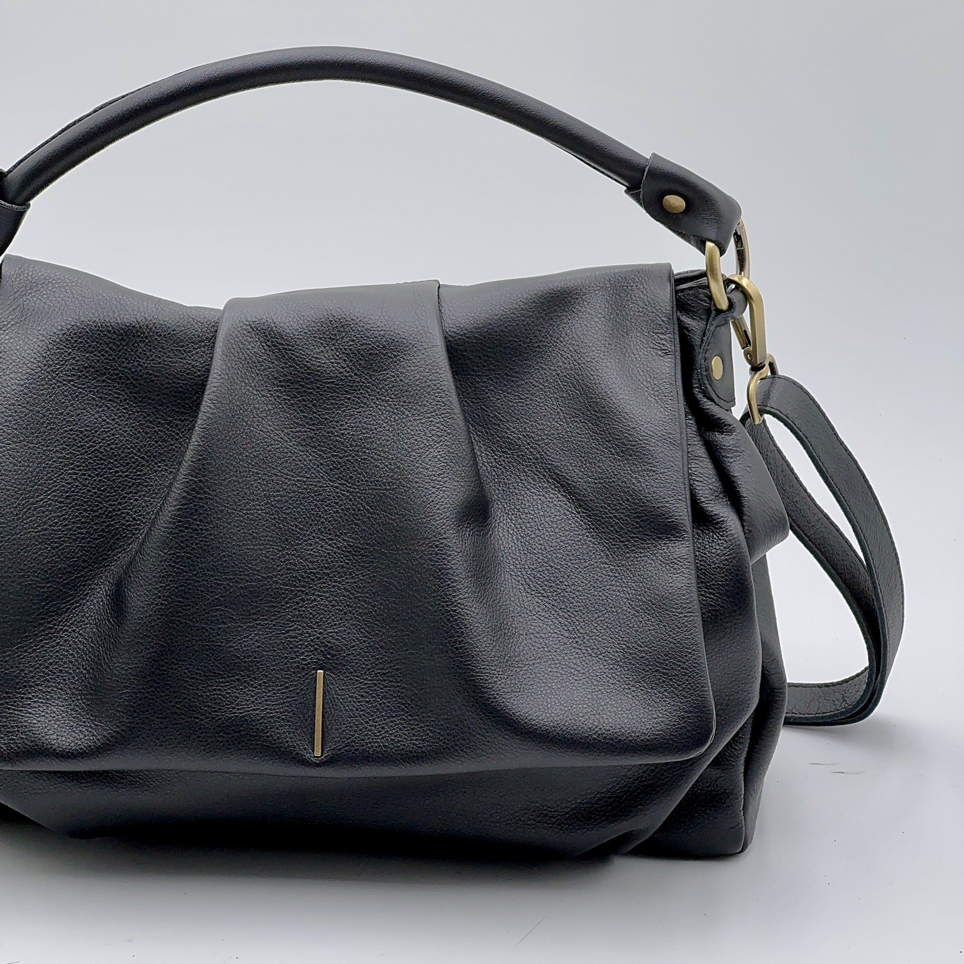 The slightly trapezoid shape is enhanced by the " pleat " motif on the flap.