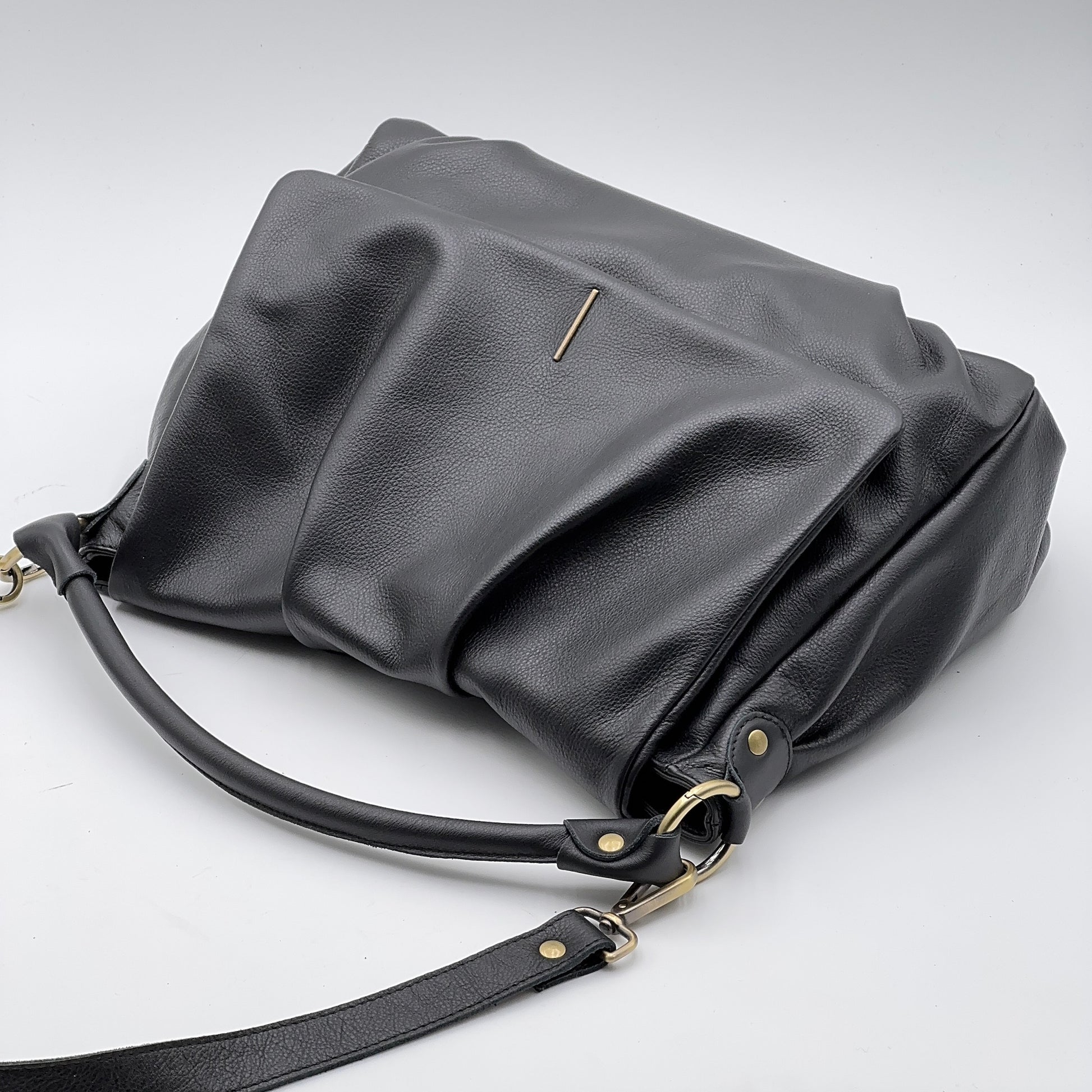 The sides instead have a bellows fold. The handle and shoulder strap are attached to a lobster clasp ring which allows them to be easily removed if necessary. The shoulder strap is adjustable and all accessories are in brushed brass . the handle is a soft tubular .