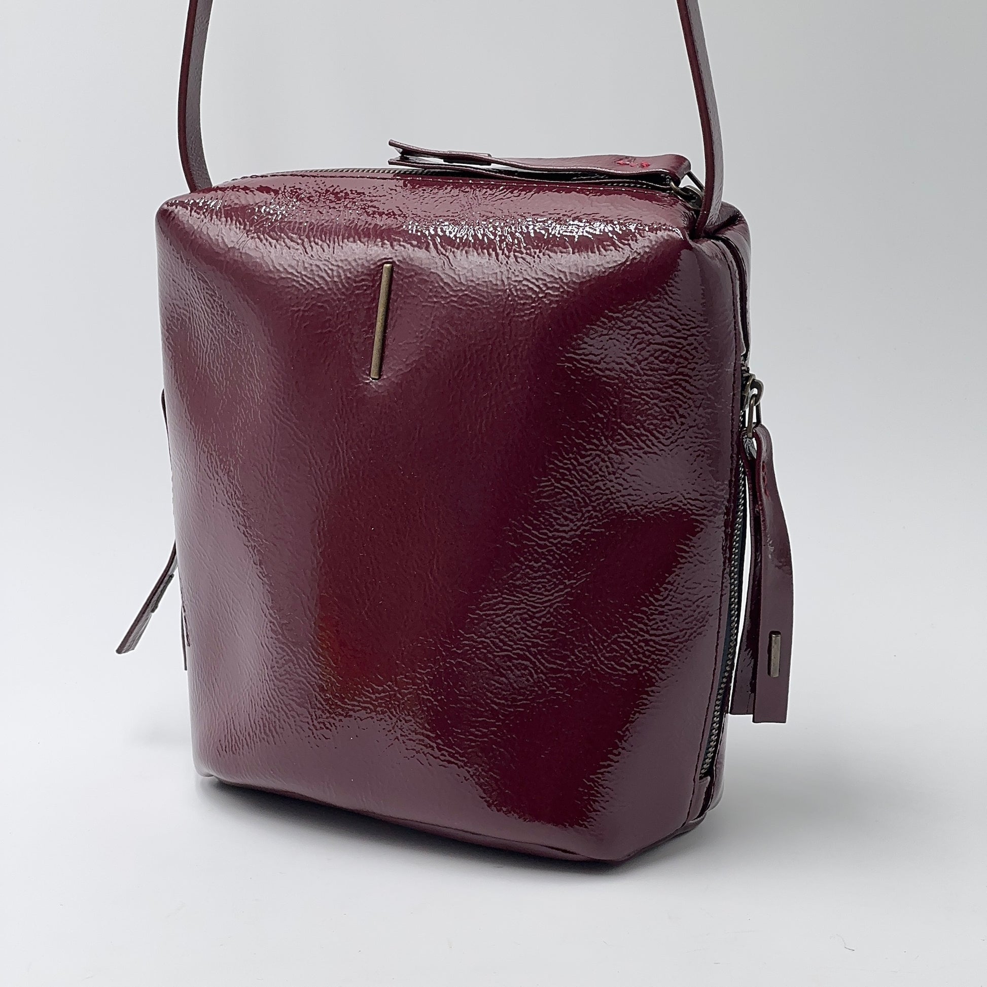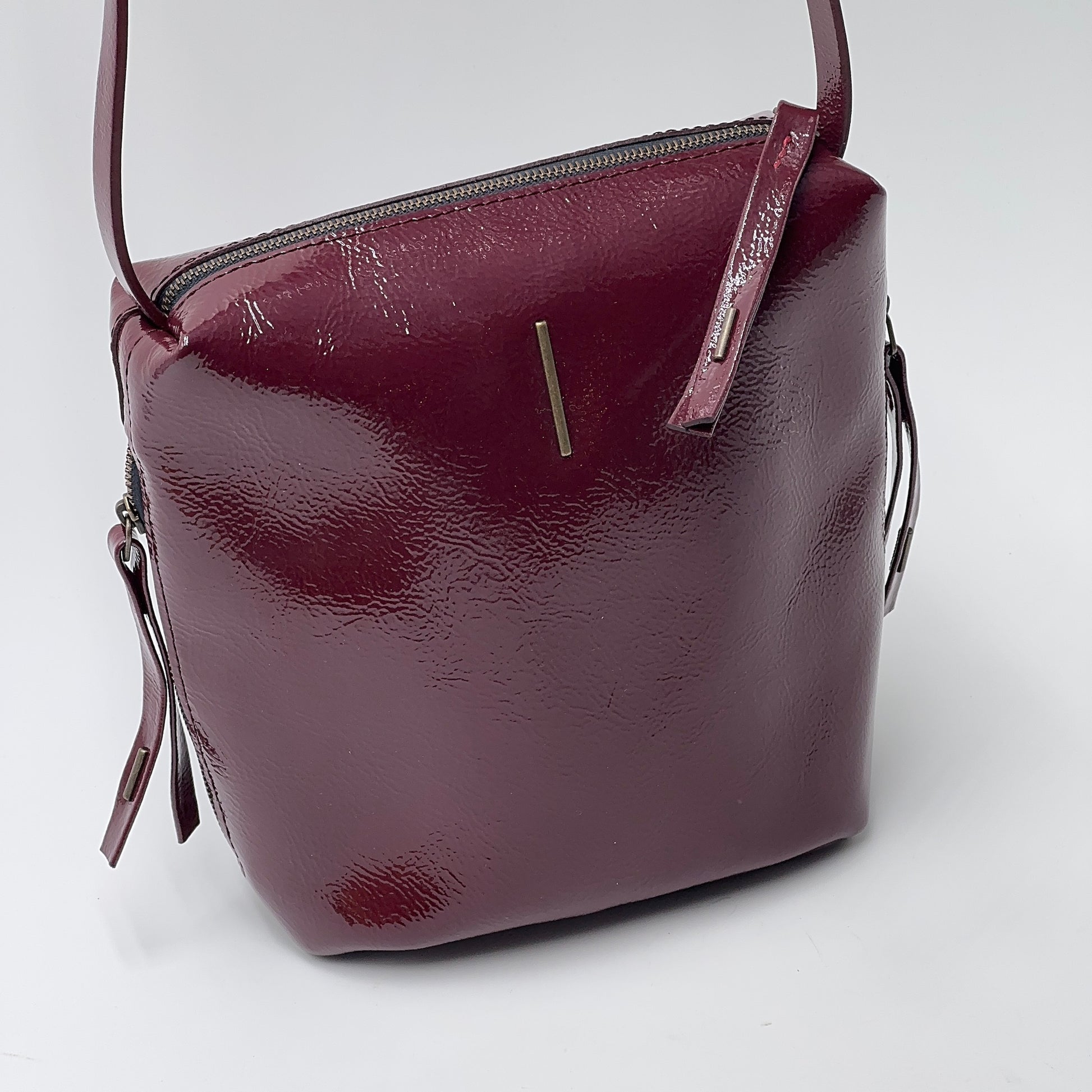 Chiusura con zip in ottone, e tasca interna con zip. Due tasche laterali, con zip, e tracolla regolabile per uso a spalla o crossbody. Fodera in microfibra.