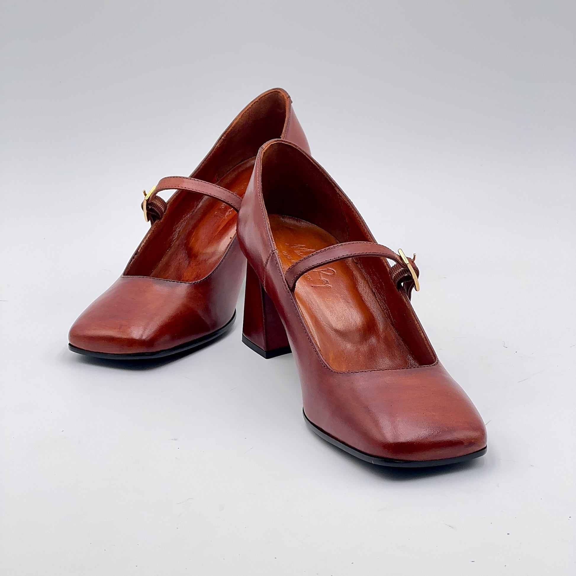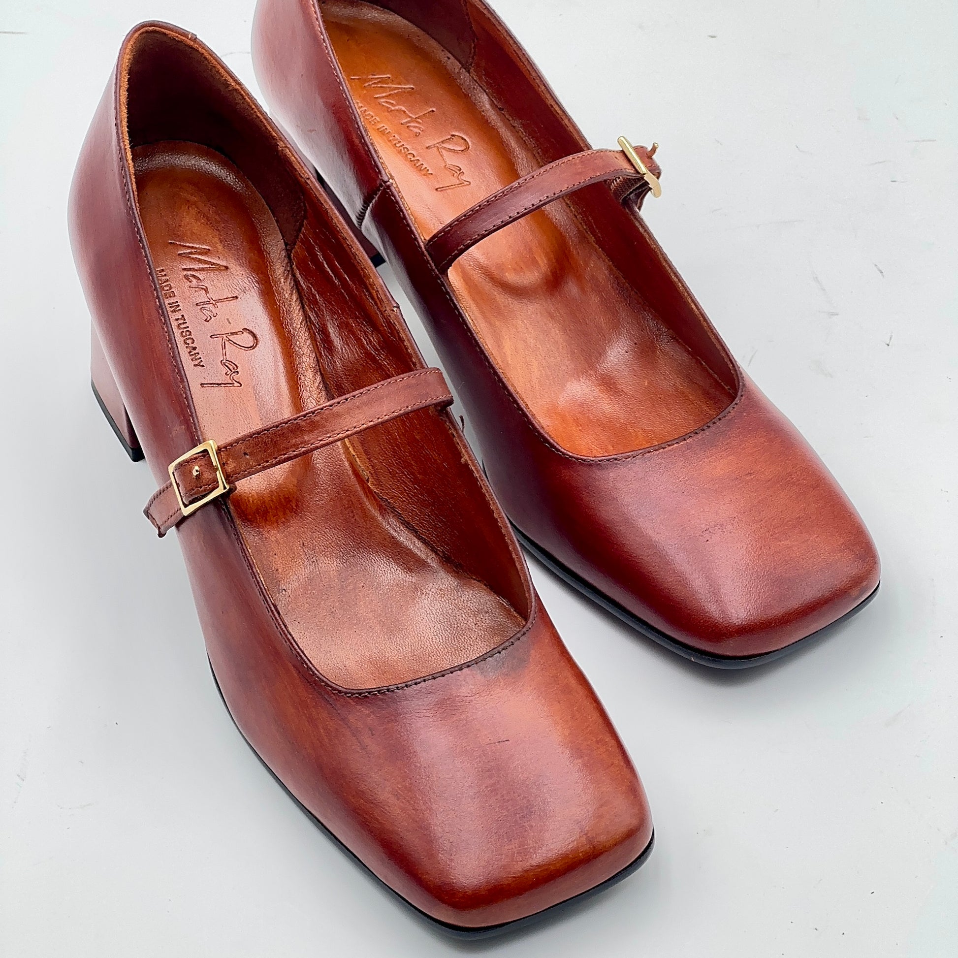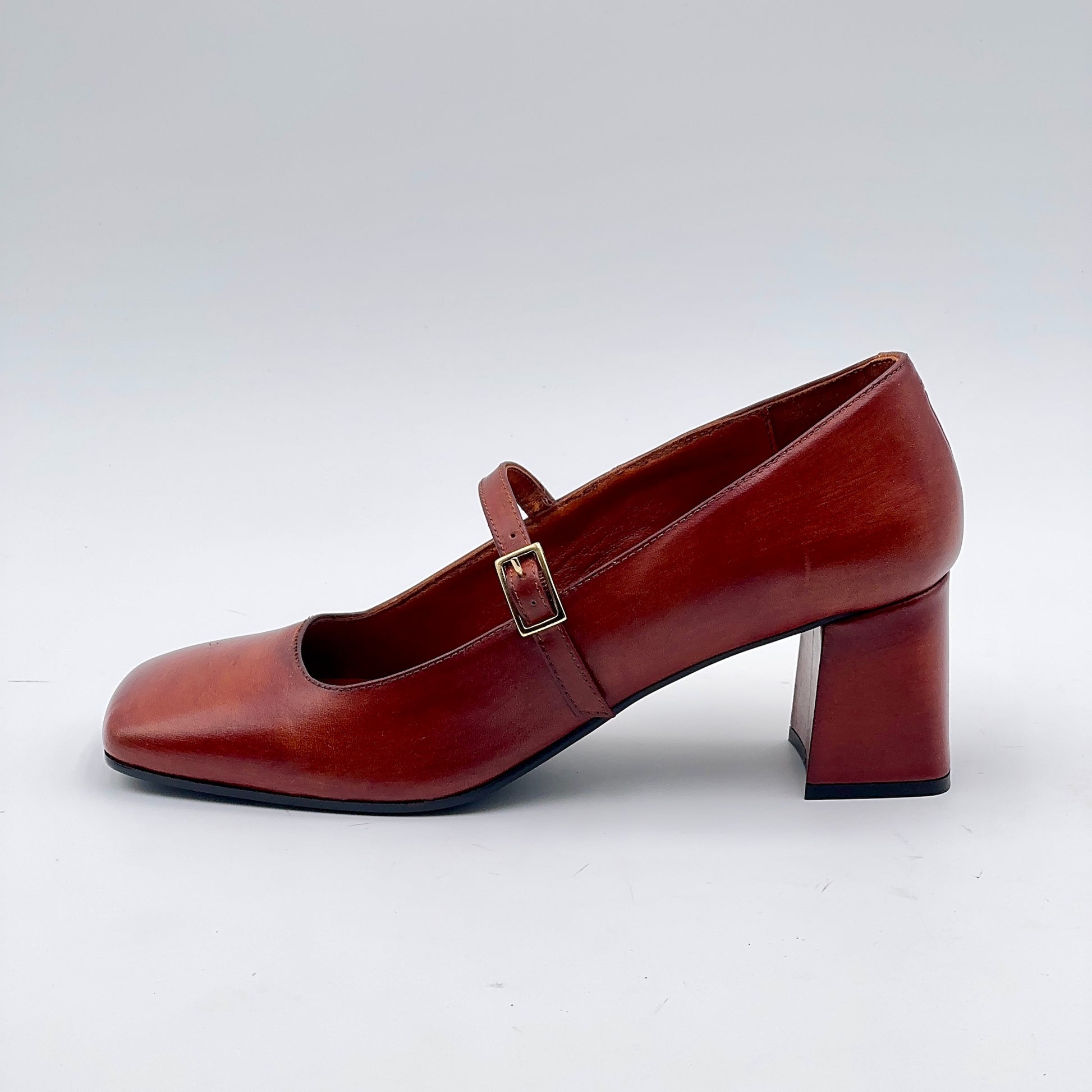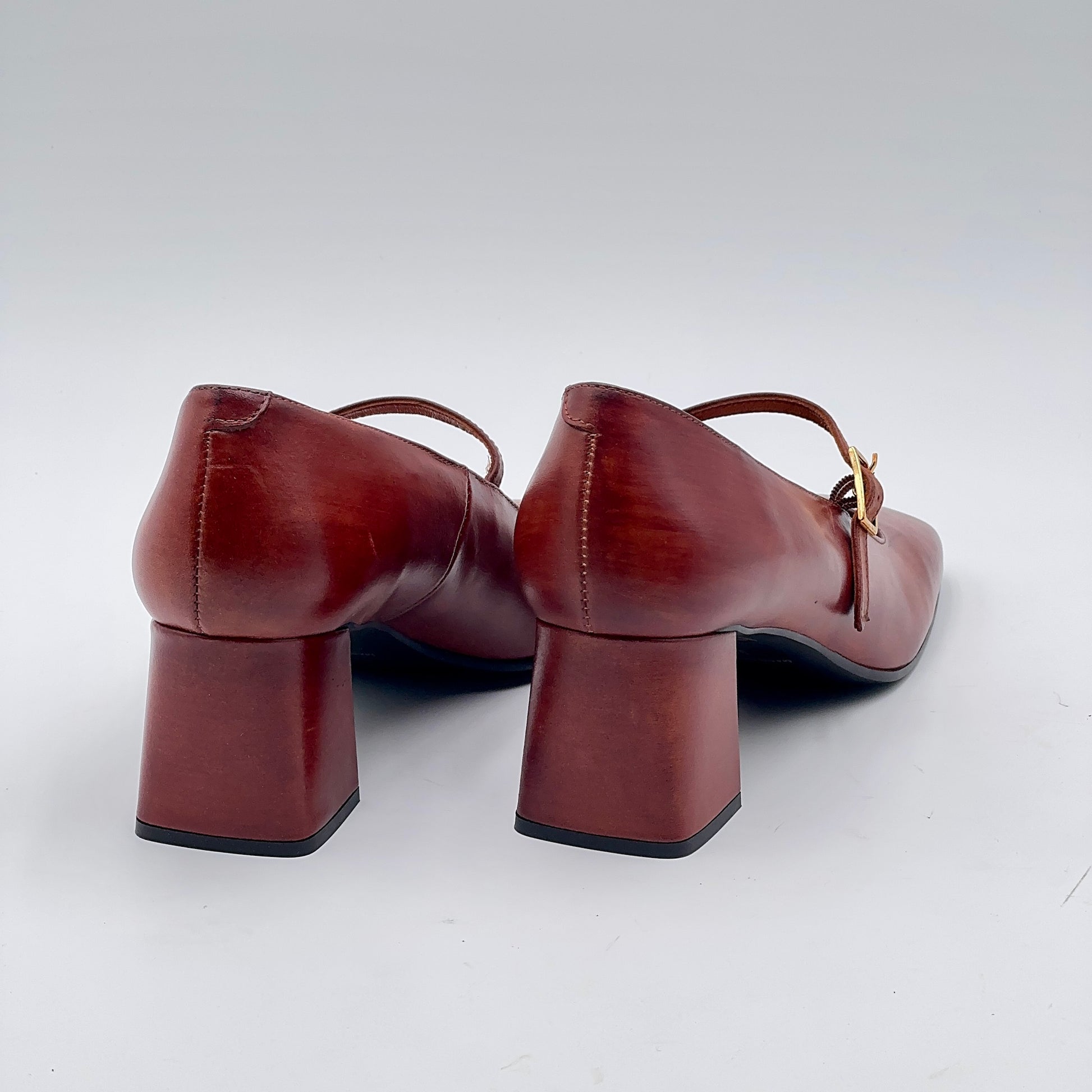 Una Mary Jane artigianale, con tacco e punta squadrata, dallo stile raffinato e senza tempo, realizzata in pelle morbida effetto invecchiato nella tonalità calda Corteccia, si distingue per il suo carattere naturale e autentico, capace di valorizzare qualsiasi look con discreta eleganza.