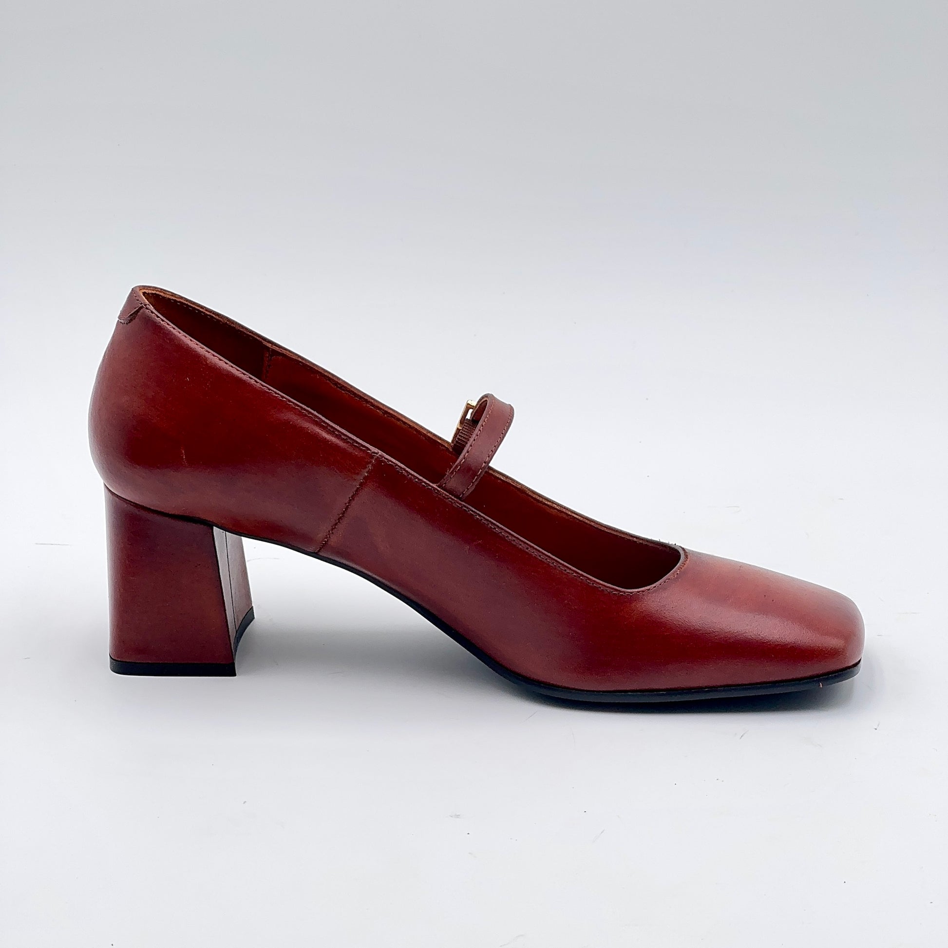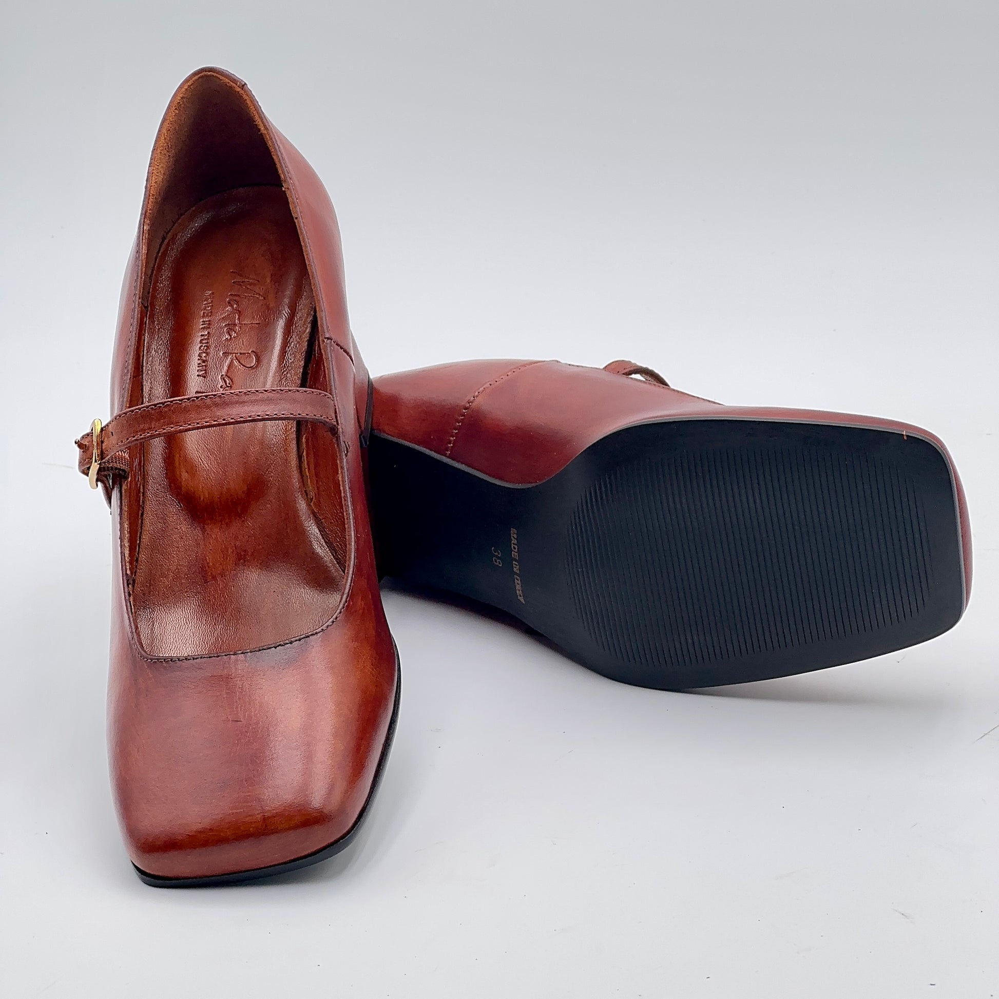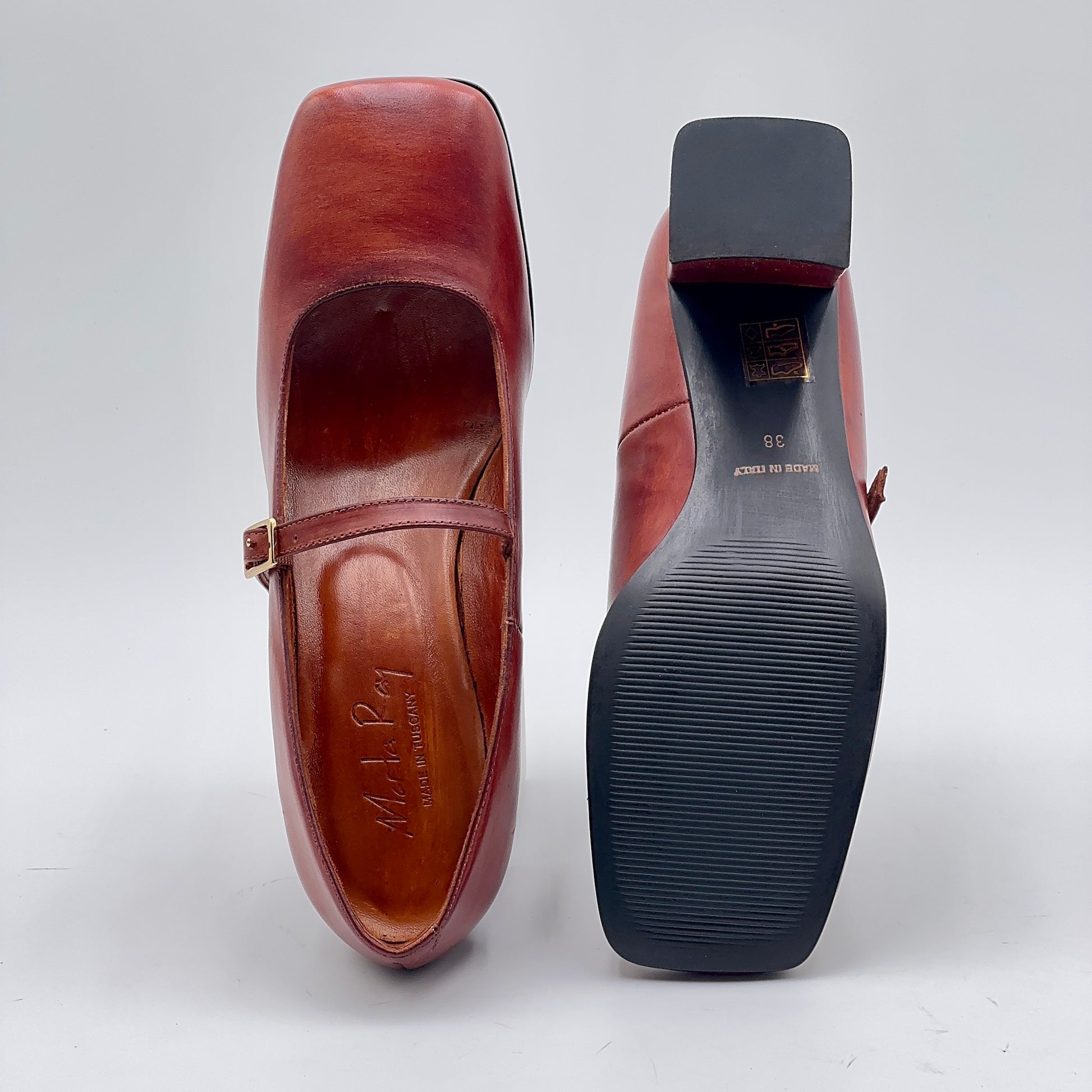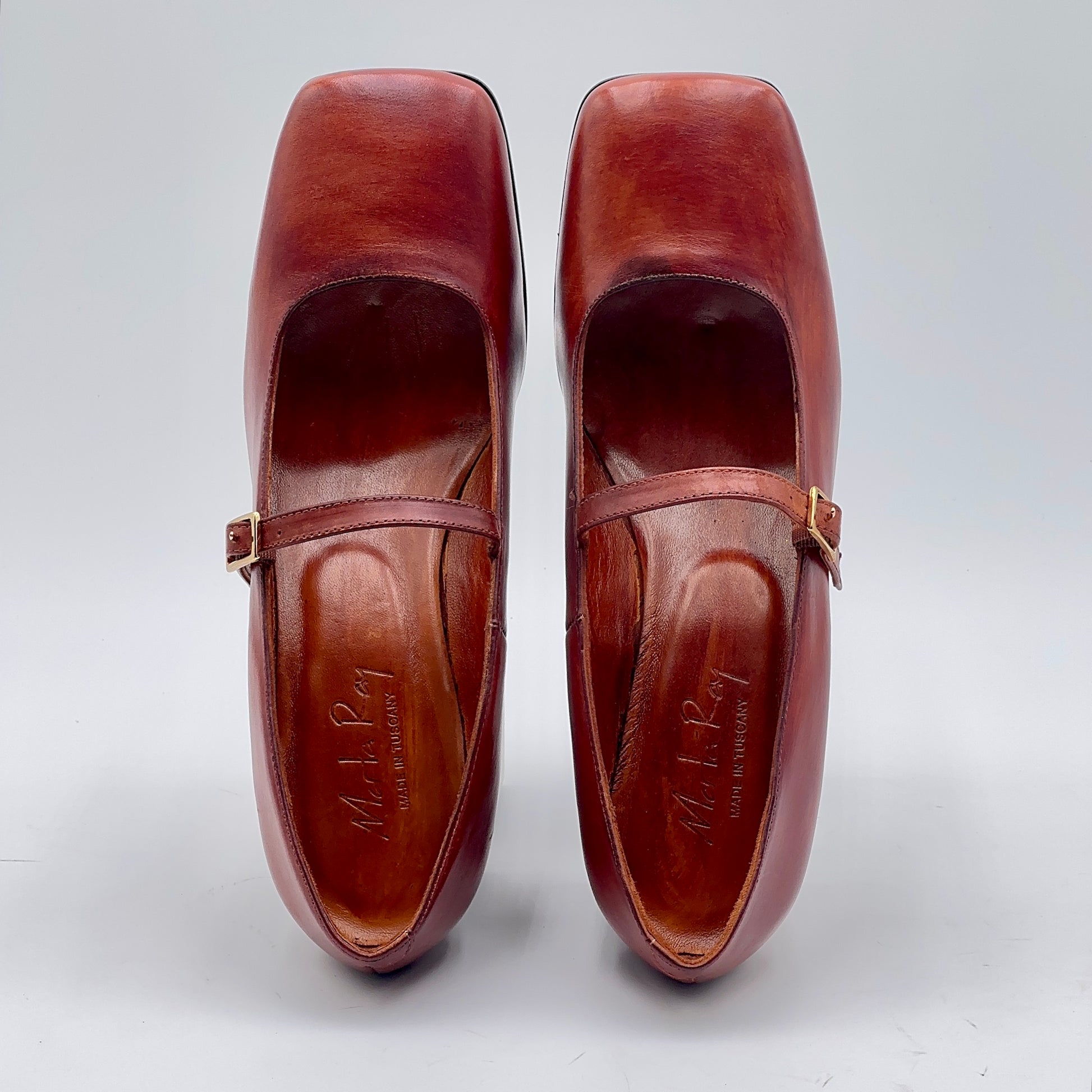 Una Mary Jane artigianale, con tacco e punta squadrata, dallo stile raffinato e senza tempo, realizzata in pelle morbida effetto invecchiato nella tonalità calda Corteccia, si distingue per il suo carattere naturale e autentico, capace di valorizzare qualsiasi look con discreta eleganza.