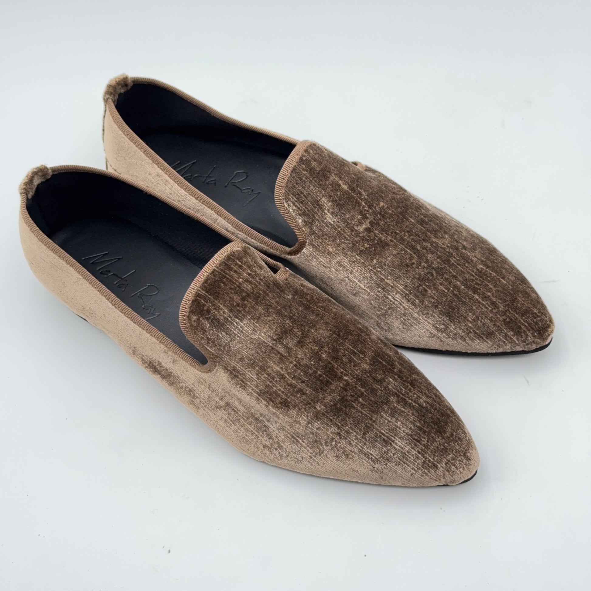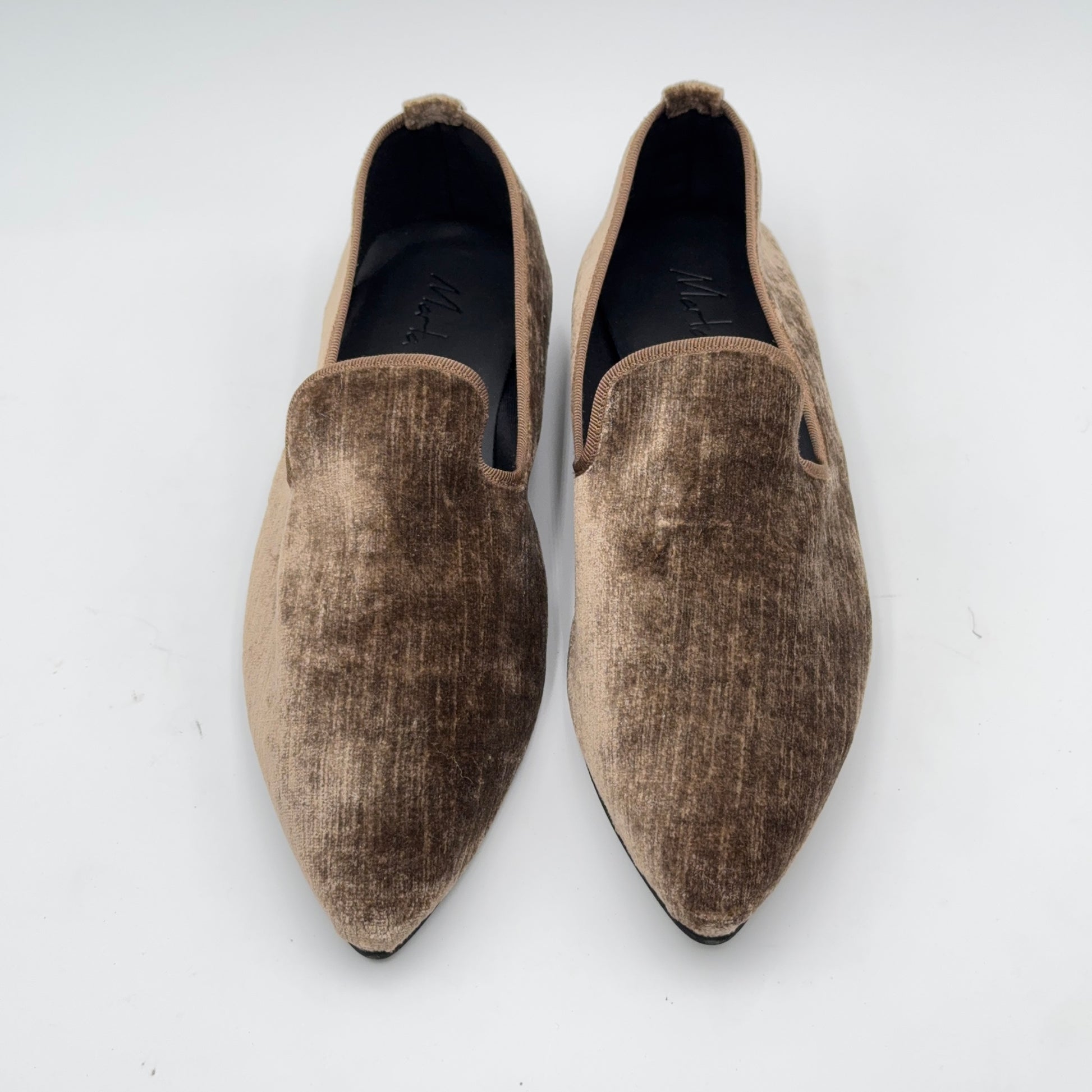 Pantofola a punta realizzata in morbido velluto brillante colore visone. Il velluto ben si abbina a questo modello ed esalta la morbida tonalità del colore.