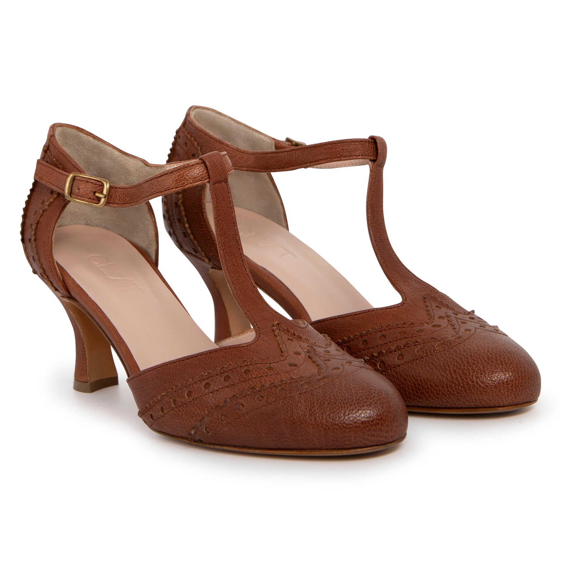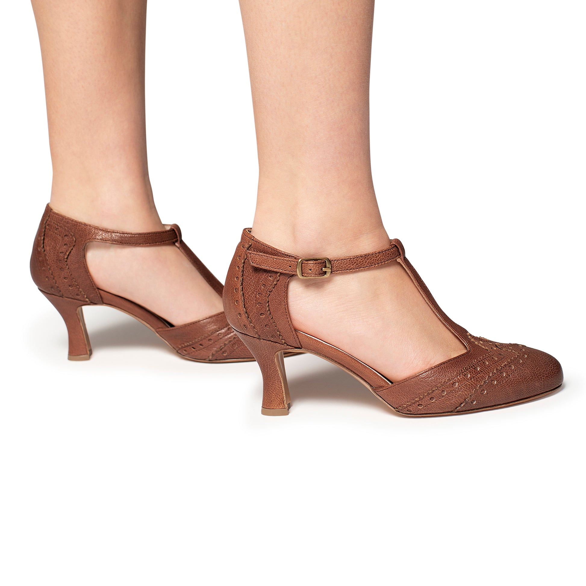 Scarpa in pelle a punta tonda con T-strap e cinturino raccordato e regolabile alla caviglia.