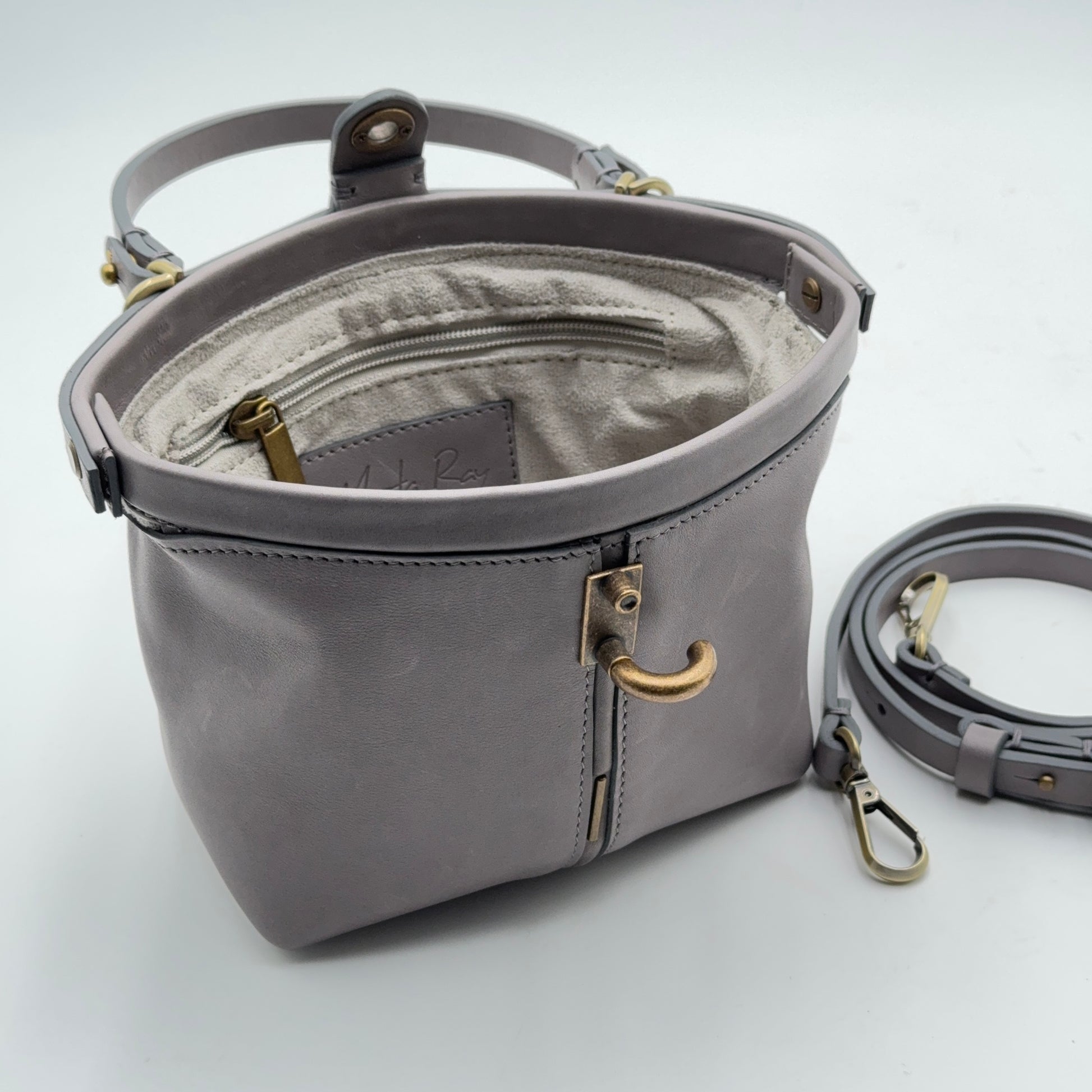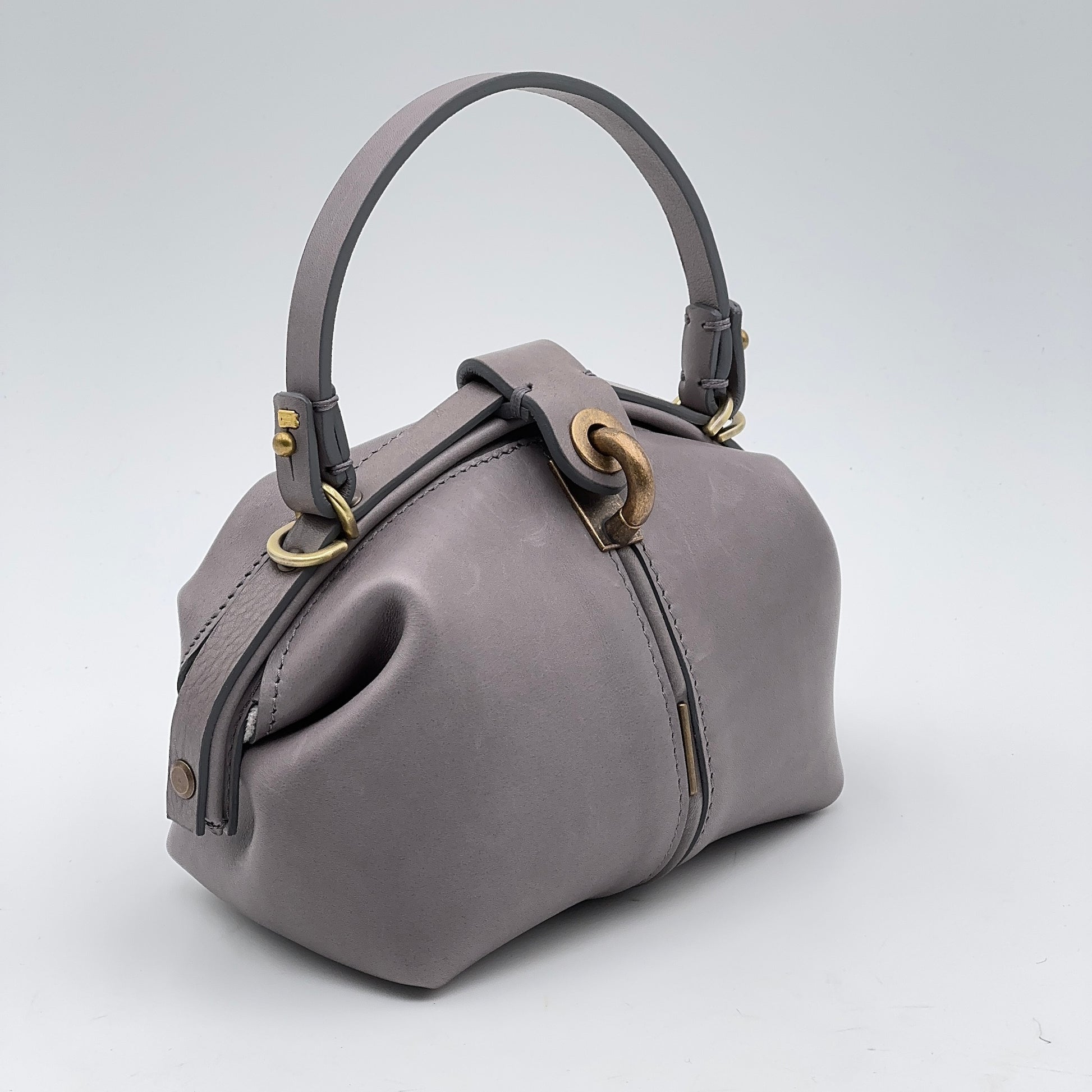 La Pouf Small in pelle con effetto ingrassato color grigio – una tonalità calda e il pellame corposo – conserva il carattere della nostra borsa a mezza luna, ma in una versione più leggera e maneggevole. Si apre ampiamente come una classica doctor bag e si chiude con un perno a scatto, mentre la linguetta coordinata aggiunge un tocco di eleganza.