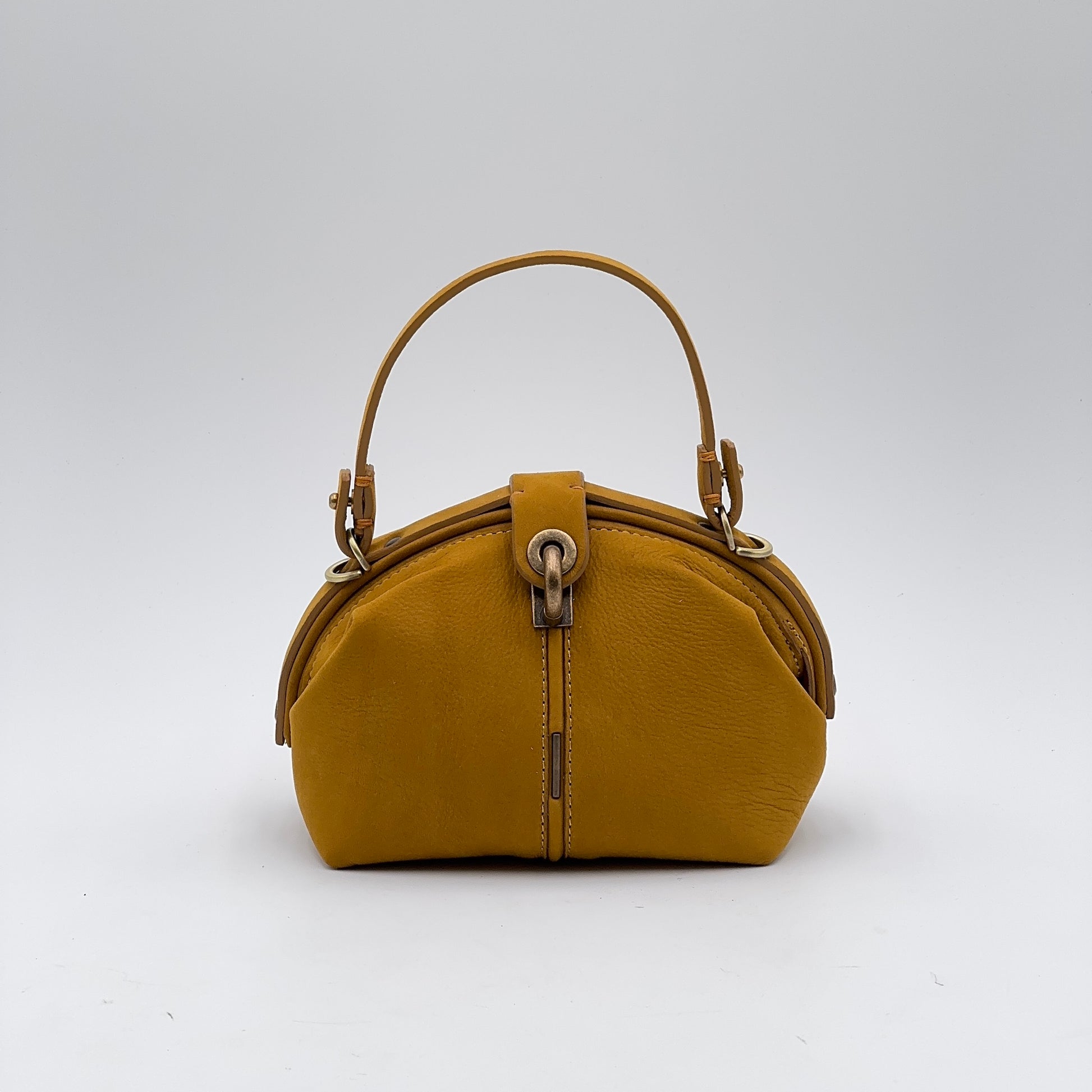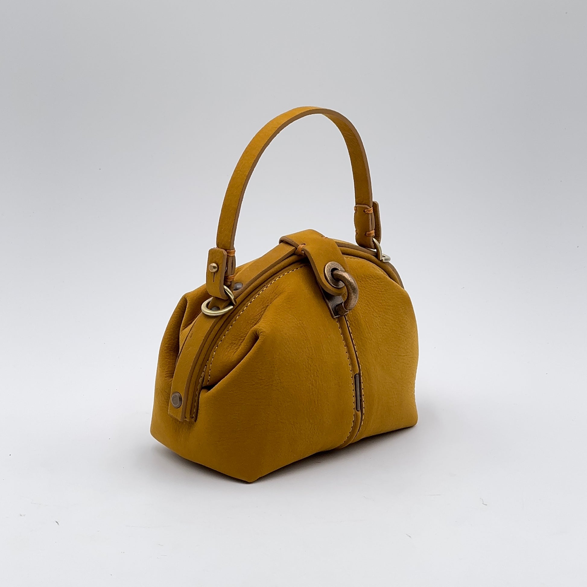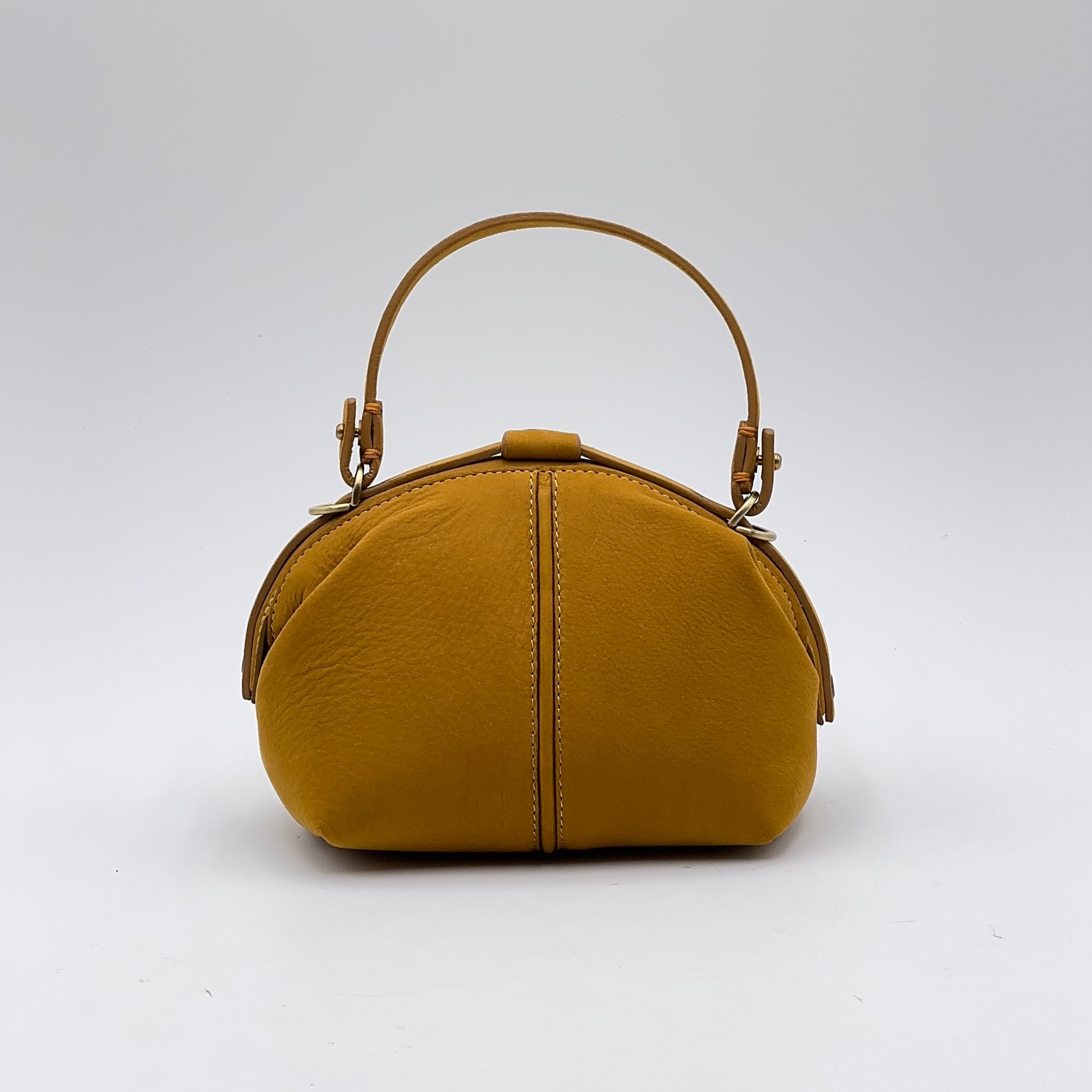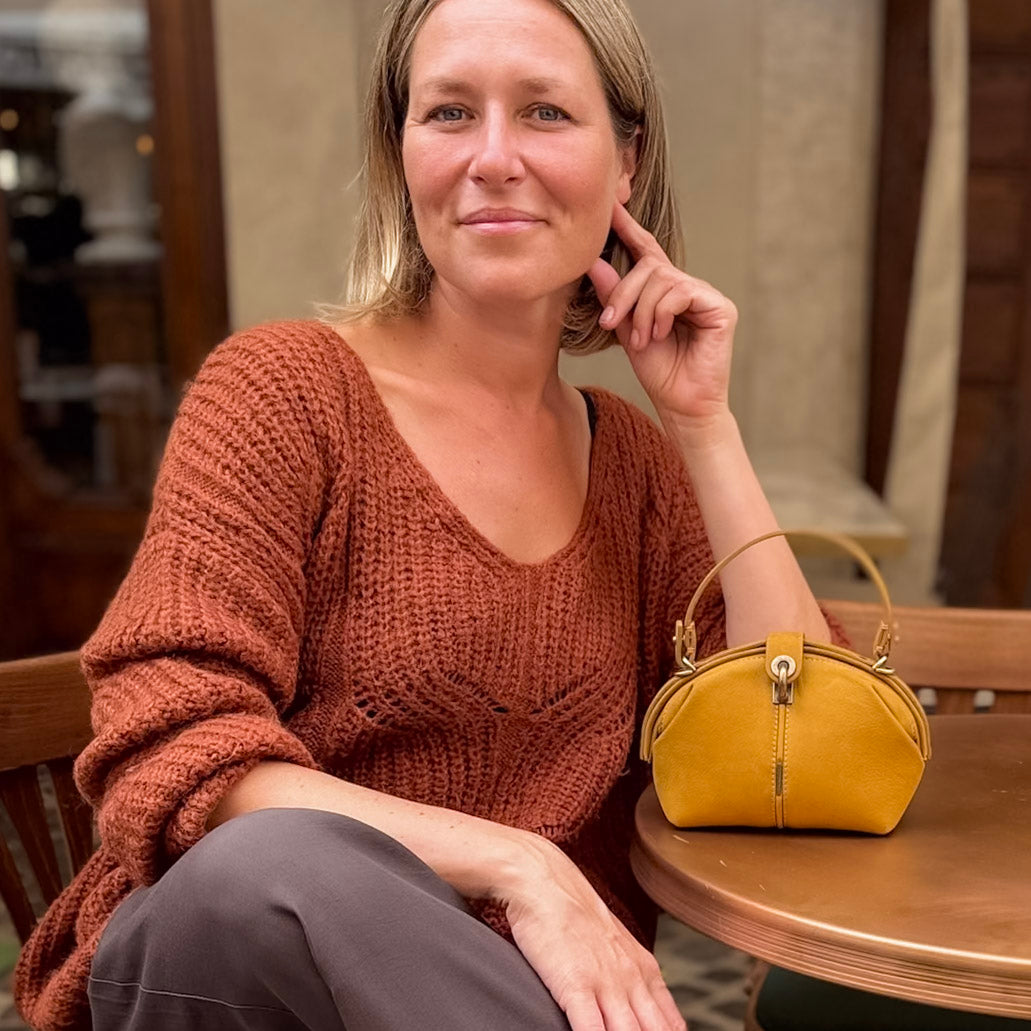 La Pouf Small in pelle Long Beach color ambra – una tonalità calda e luminosa – conserva il carattere della nostra borsa a mezza luna, ma in una versione più leggera e maneggevole. Si apre ampiamente come una classica doctor bag e si chiude con un perno a scatto, mentre la linguetta coordinata aggiunge un tocco di eleganza.