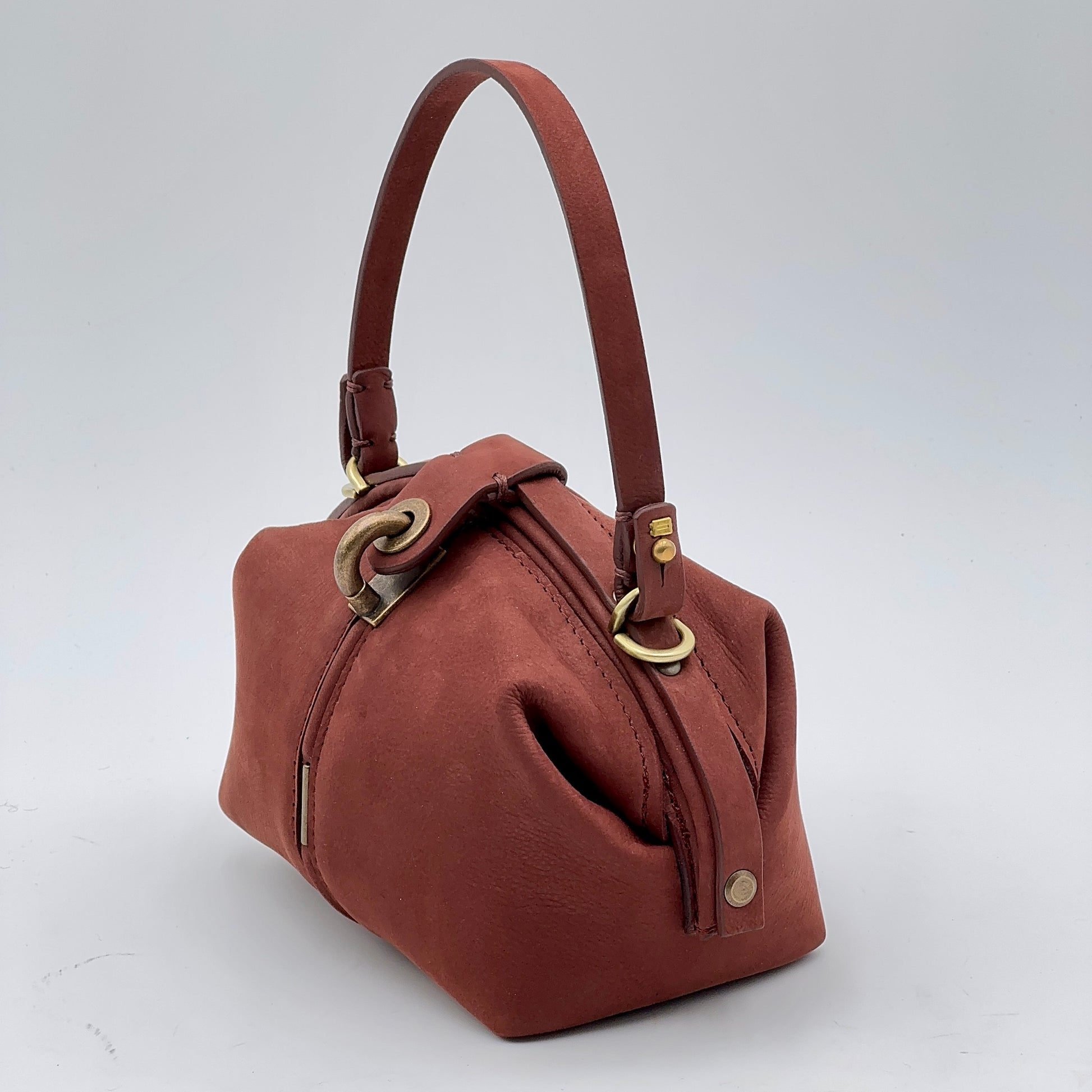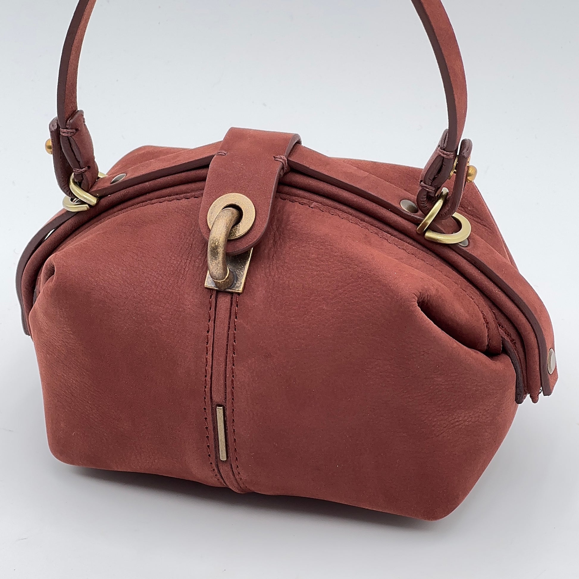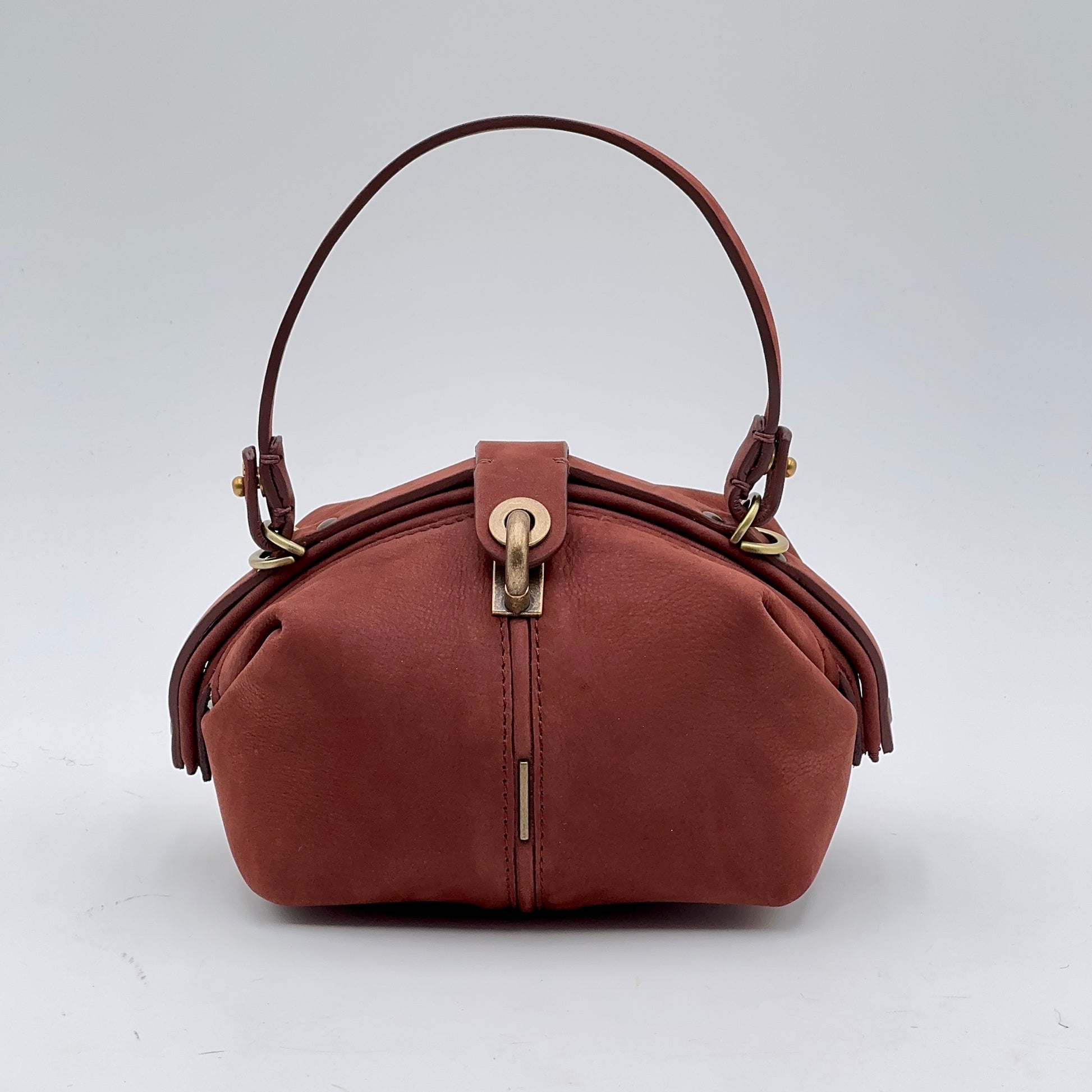 La Pouf Small in pelle Long Beach color britanic – una tonalità calda e luminosa del marrone– conserva il carattere della nostra borsa a mezza luna, ma in una versione più leggera e maneggevole. Si apre ampiamente come una classica doctor bag e si chiude con un perno a scatto, mentre la linguetta coordinata aggiunge un tocco di eleganza.