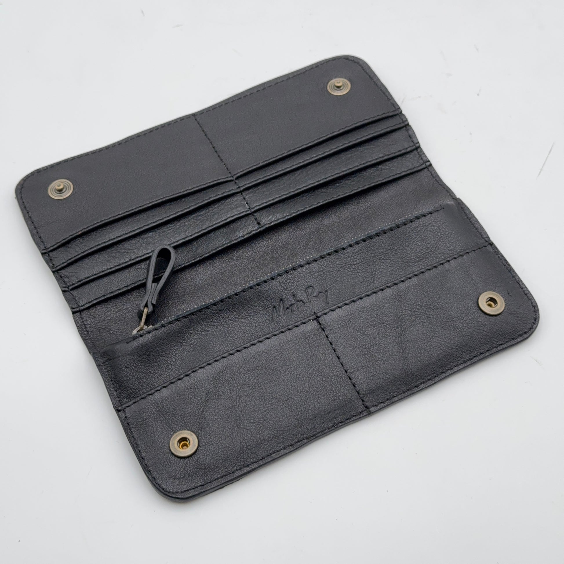 Portafoglio in pelle con i bordi rifiniti con la tintura a mano. Dispone di otto scomparti per le carte su un lato, sotto i quali troverai un'ampia tasca doppia. Sull'altro lato, è presente una tasca con zip, e sotto di essa troverai uno spazio dedicato per carte di credito e/o contanti.