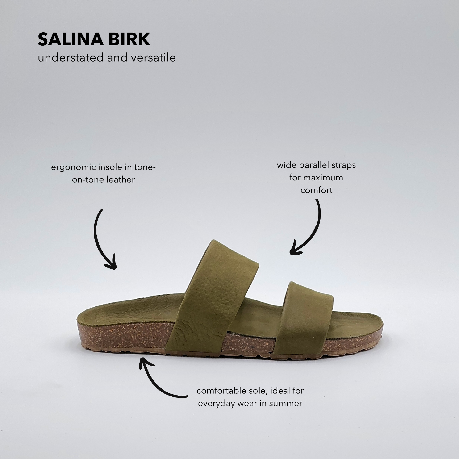 Sandalo flat in pelle Long Beach color carciofo con suola ergonomica rivestita nello stesso materiale. Due fasce parallele ampie avvolgono il piede con naturalezza.