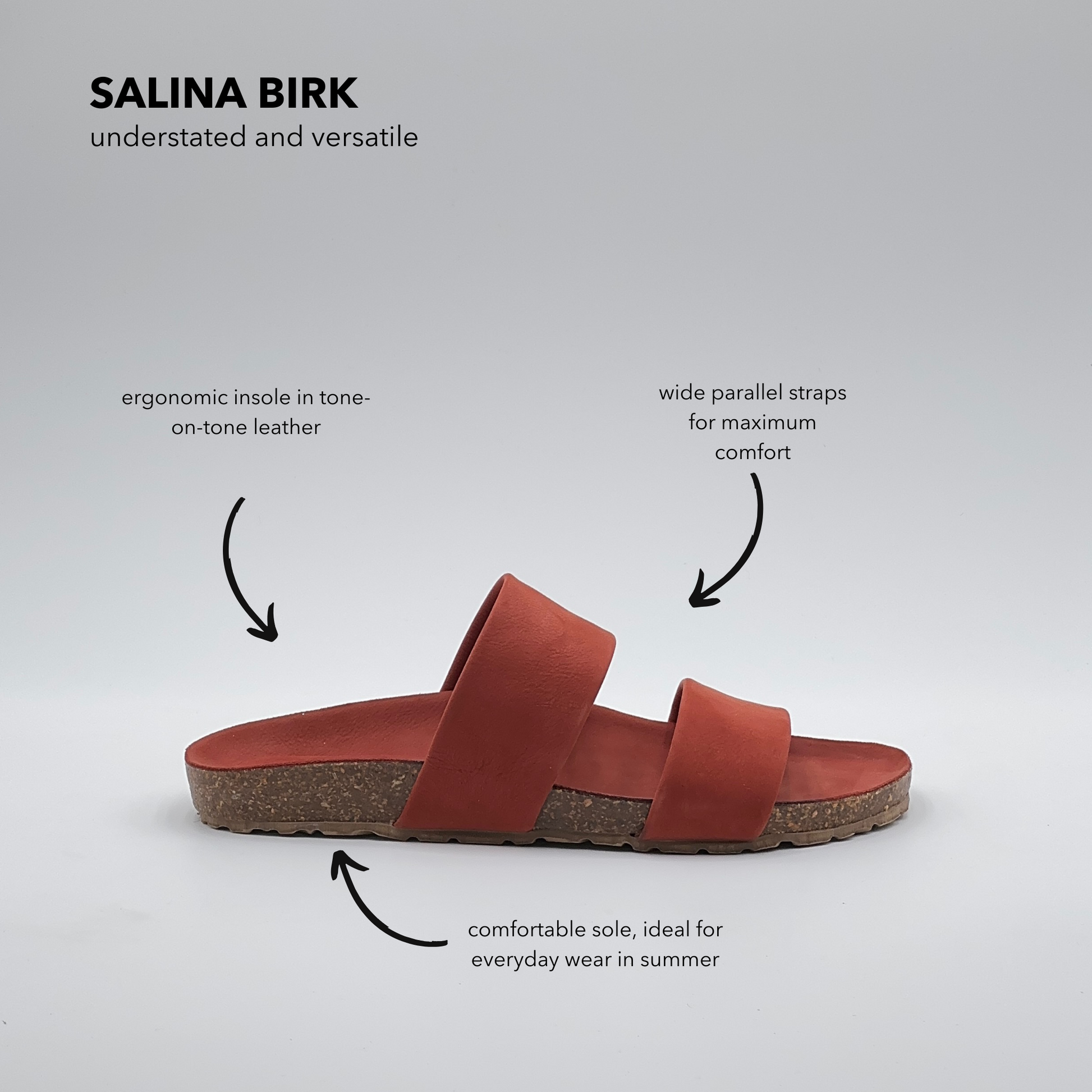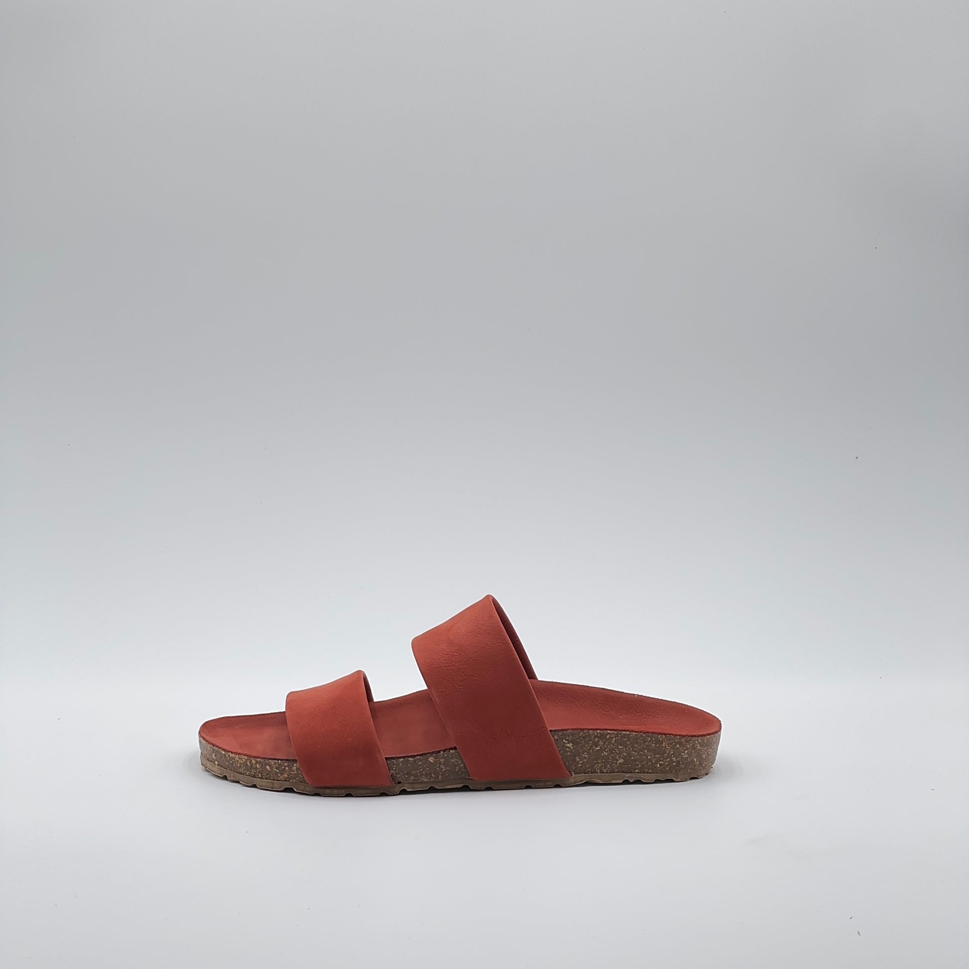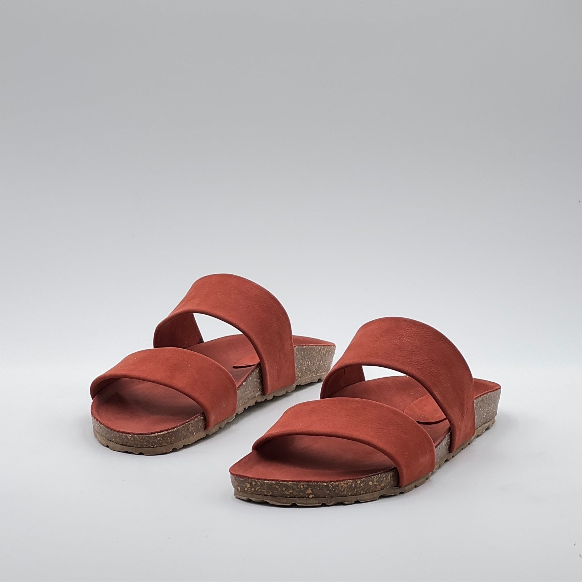 Sandalo flat in pelle Long Beach color cuoio inglese con suola ergonomica rivestita nello stesso materiale. Due fasce larghe e parallele accolgono il piede con eleganza e comfort.