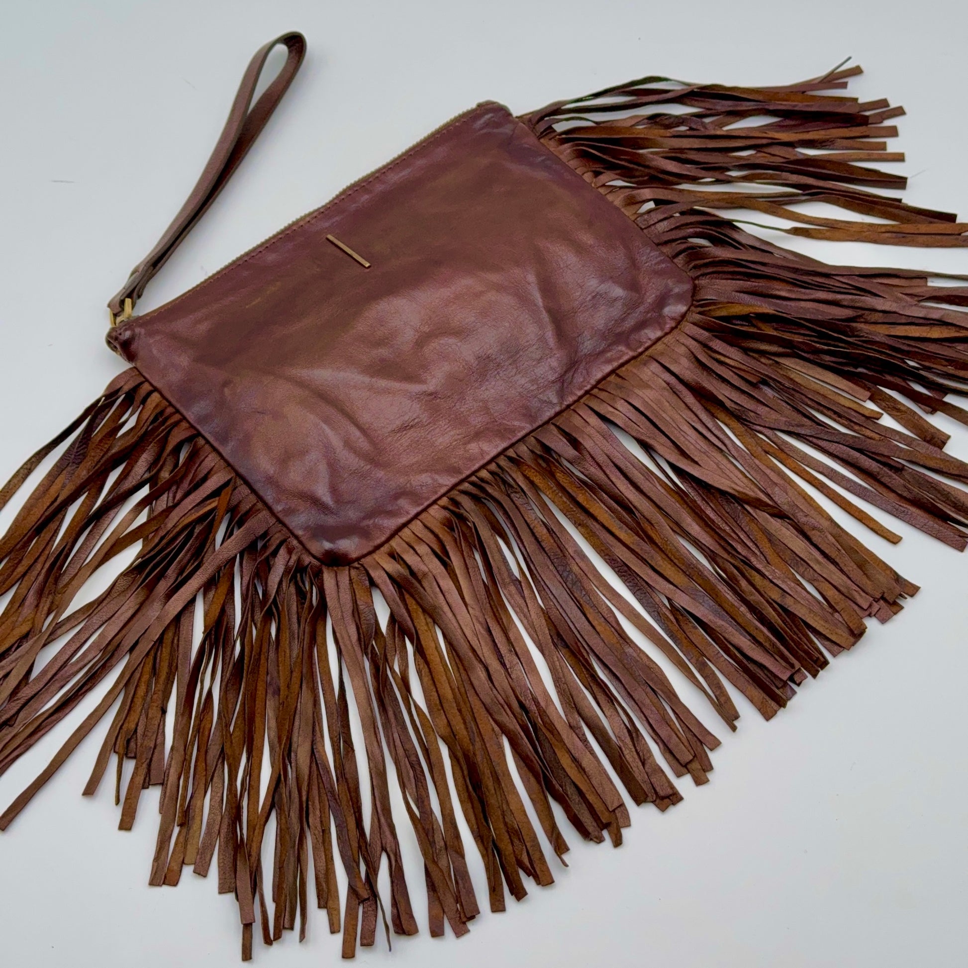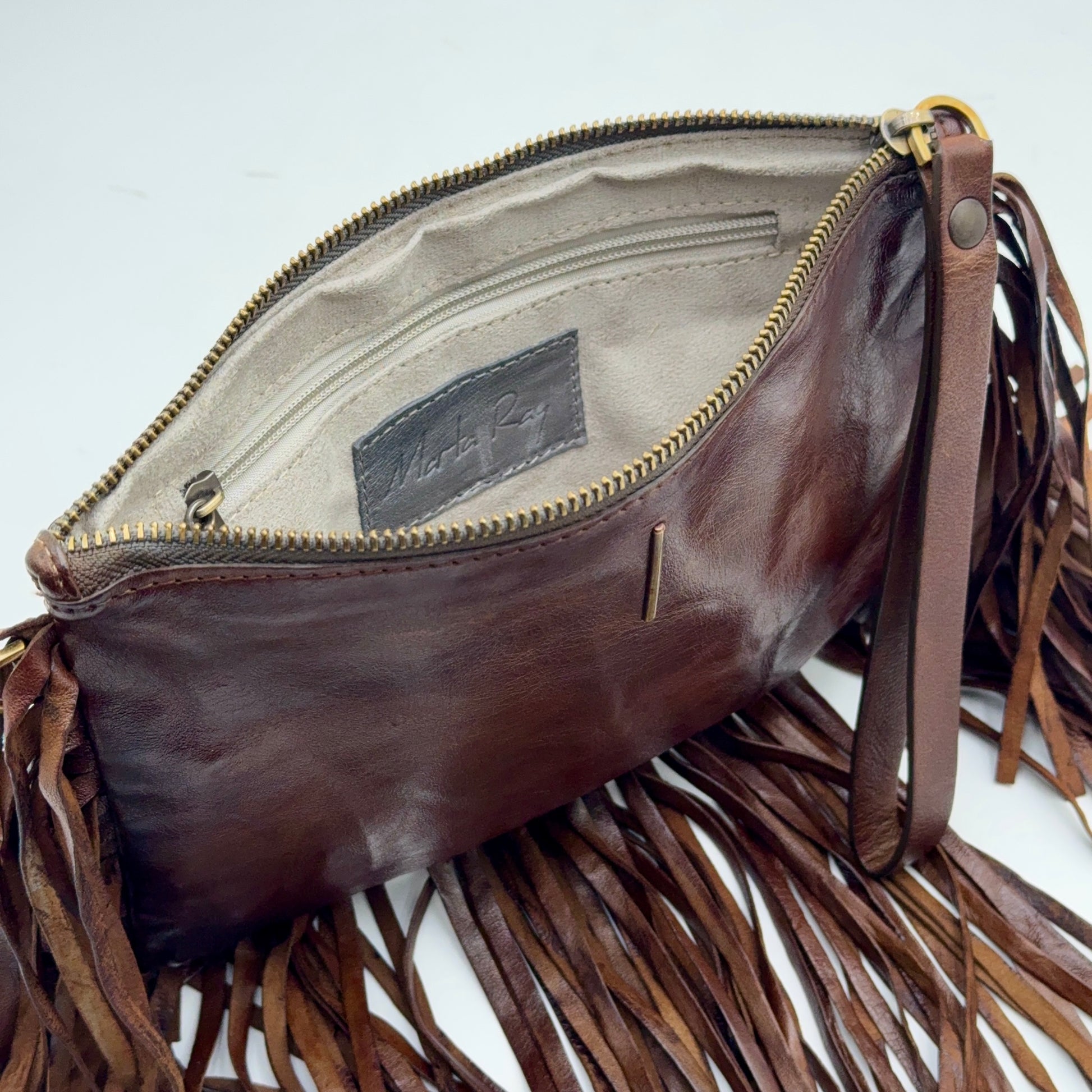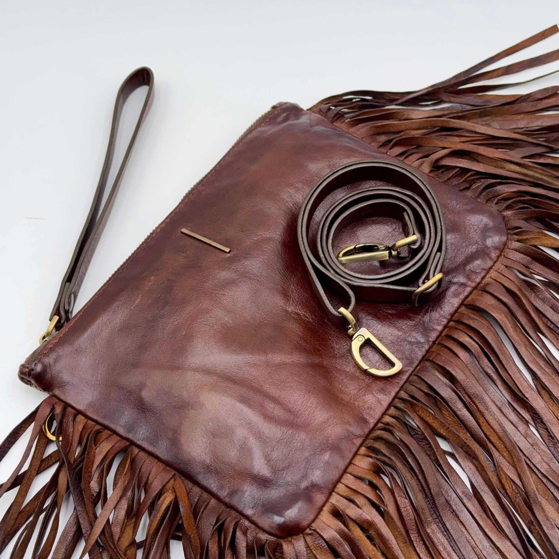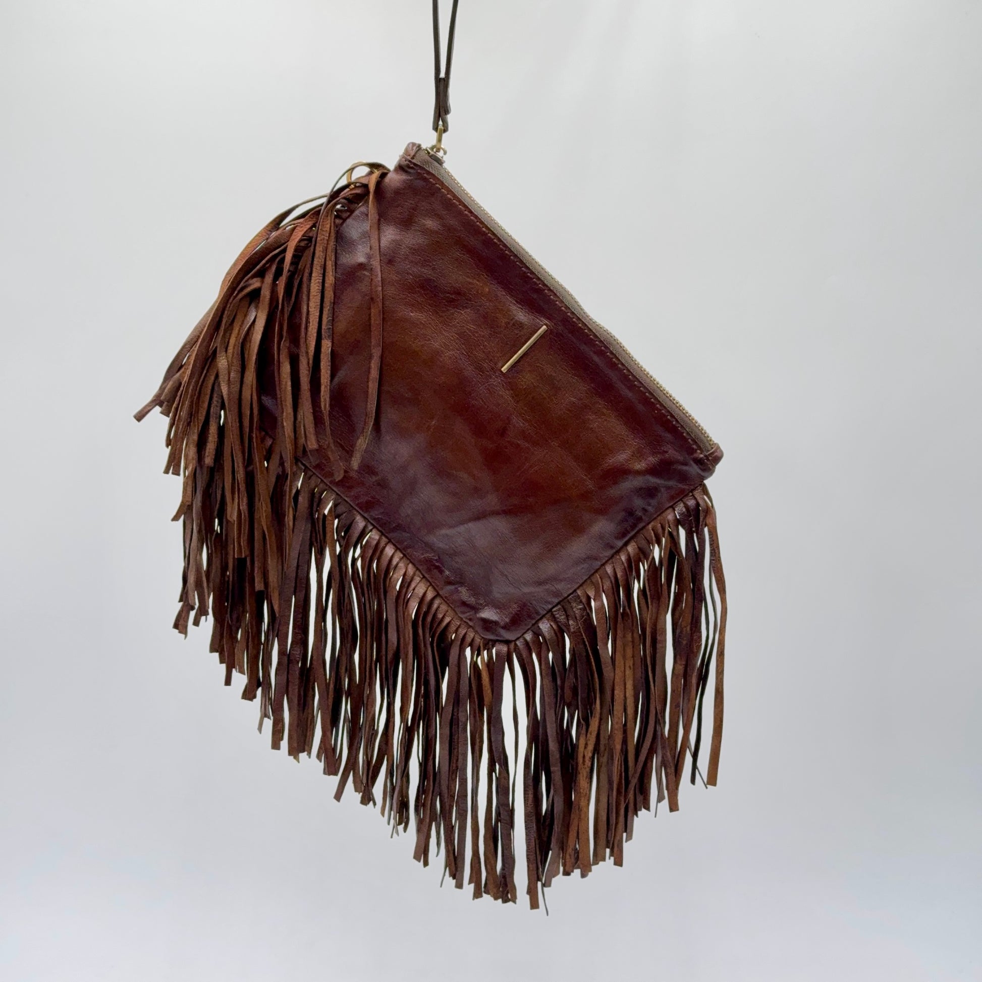 Pochette a bustina con polsiera e tracolla staccabile. Il motivo evergreen delle frange che la circondano su 3 lati la rende frizzante e decisamente 'boho'. La pelle morbida e leggera garantisce alla Sissy un fluttuare che accompagnerà la tua 'joie de vivre'. Questa versione della Sissy è stata tinta e spazzolata per ottenere un effetto unico di color corteccia.