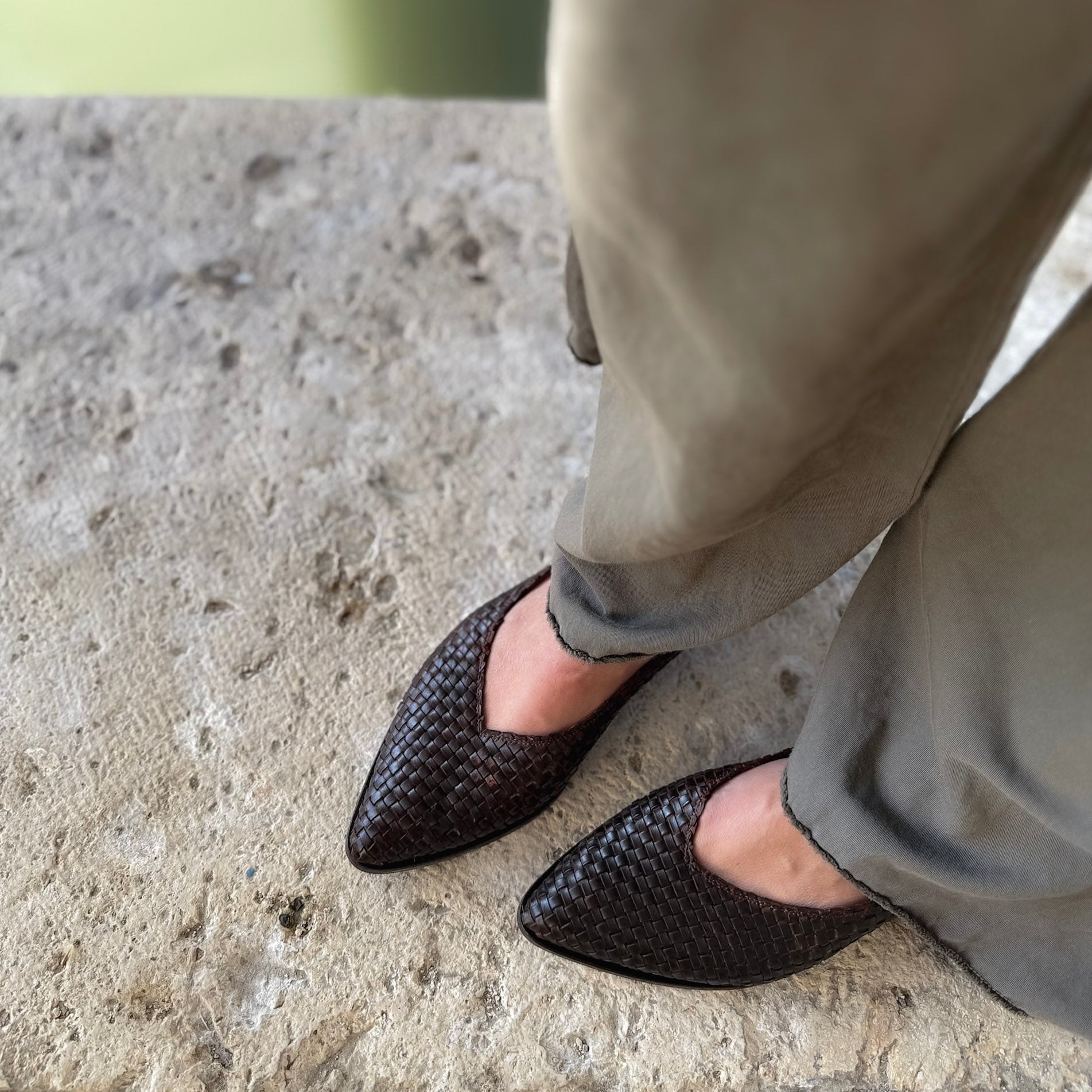 Pointed ballerina flats entirely hand -woven with a mat effect and completely hand-dyed . This process is carried out using ancient artisan methods , only in this way does each shoe take on nuances that make it unique .