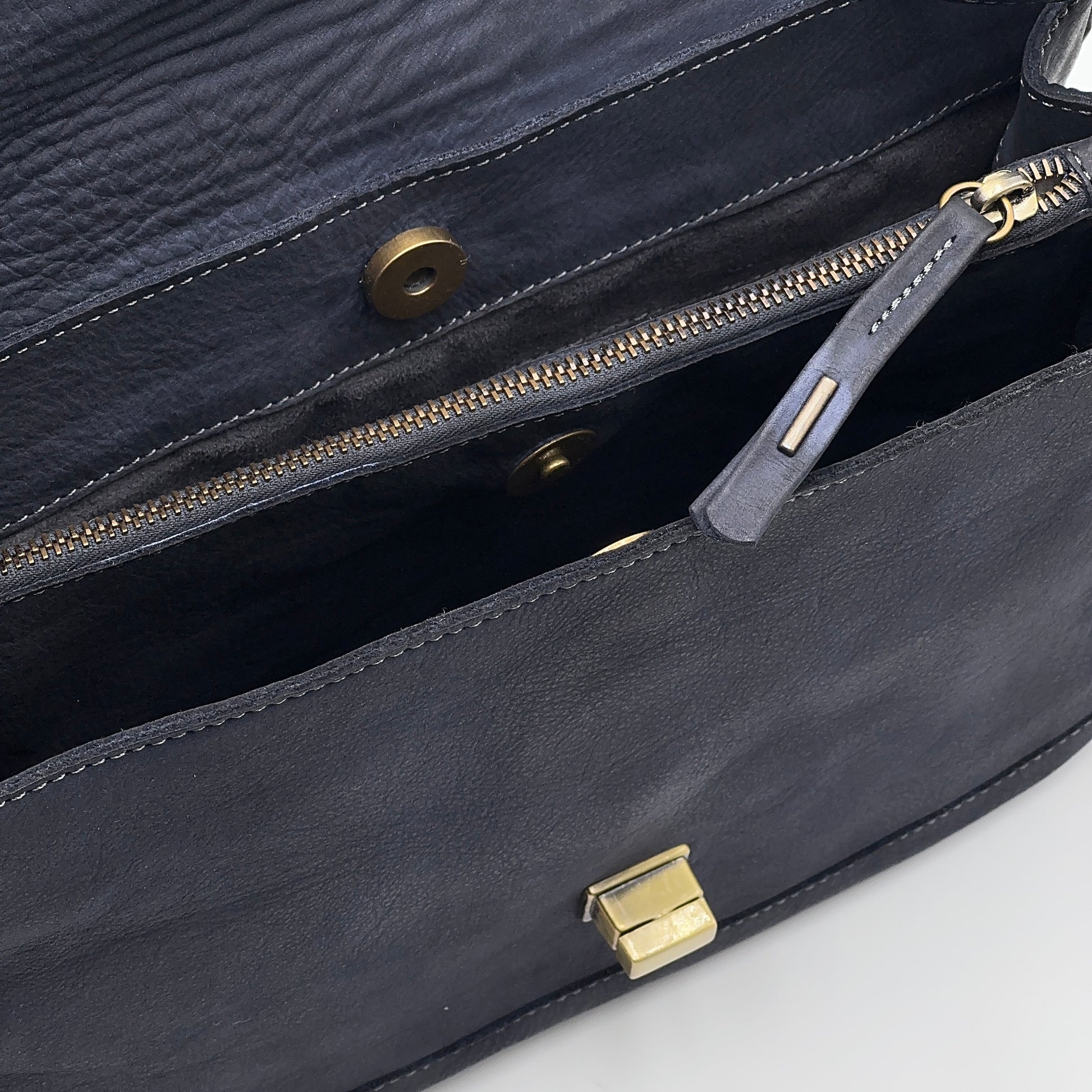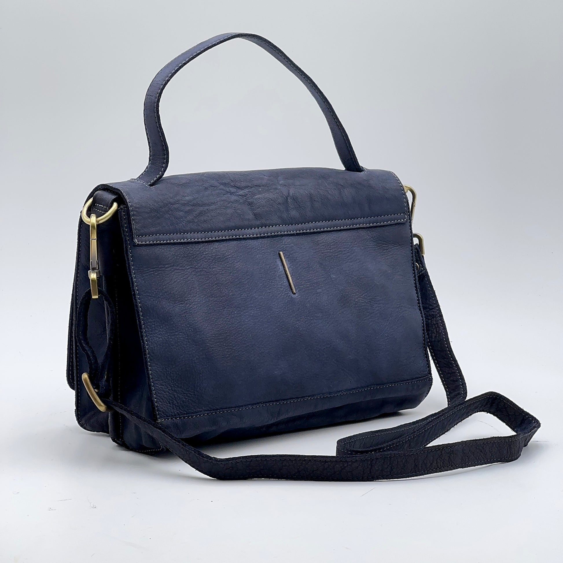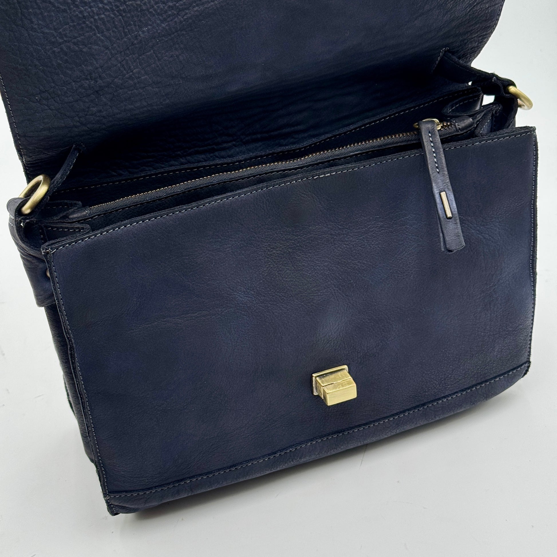 Yulia è una borsa elegante e versatile, blu scuro, tinto in capo. La patta con chiusura a tornello in ottone spazzolato protegge l’interno organizzato in tre scomparti, mantenendo ordine e praticità. La tracolla regolabile e rimovibile permette di indossarla comodamente anche a spalla o come postina, mentre il manico la rende raffinata da portare a mano. L’interno, foderato in microfibra, ospita due tasche, di cui una con zip, per riporre con sicurezza gli oggetti essenziali.