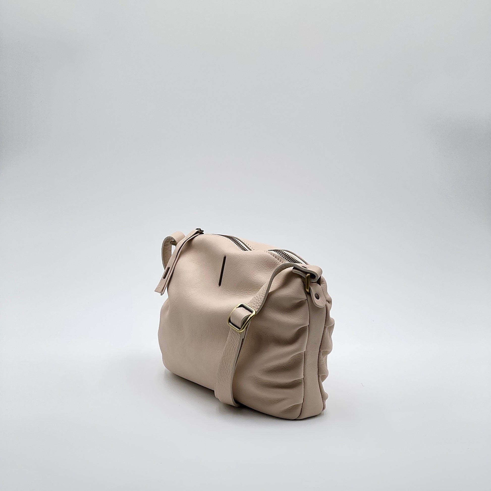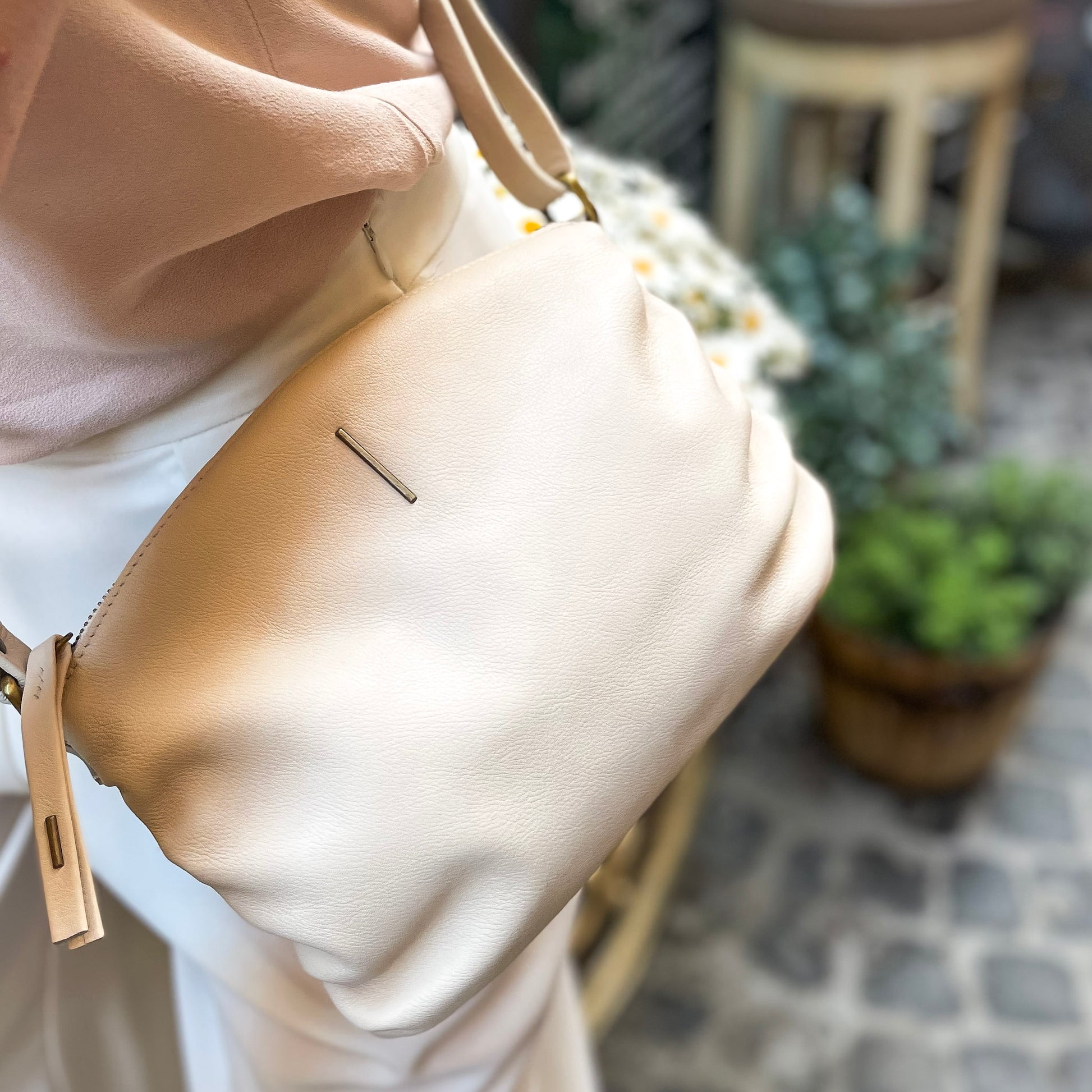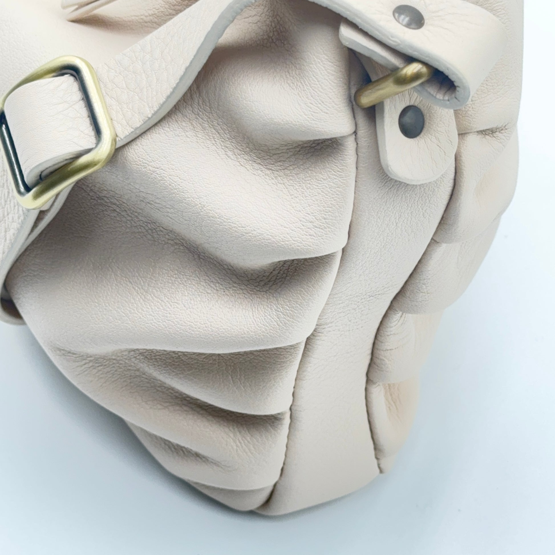 Borsa piccola ma capiente in pelle pieno fiore Mousse color latte macchiato, con pieghe a soffietto che le donano una forma a palloncino.