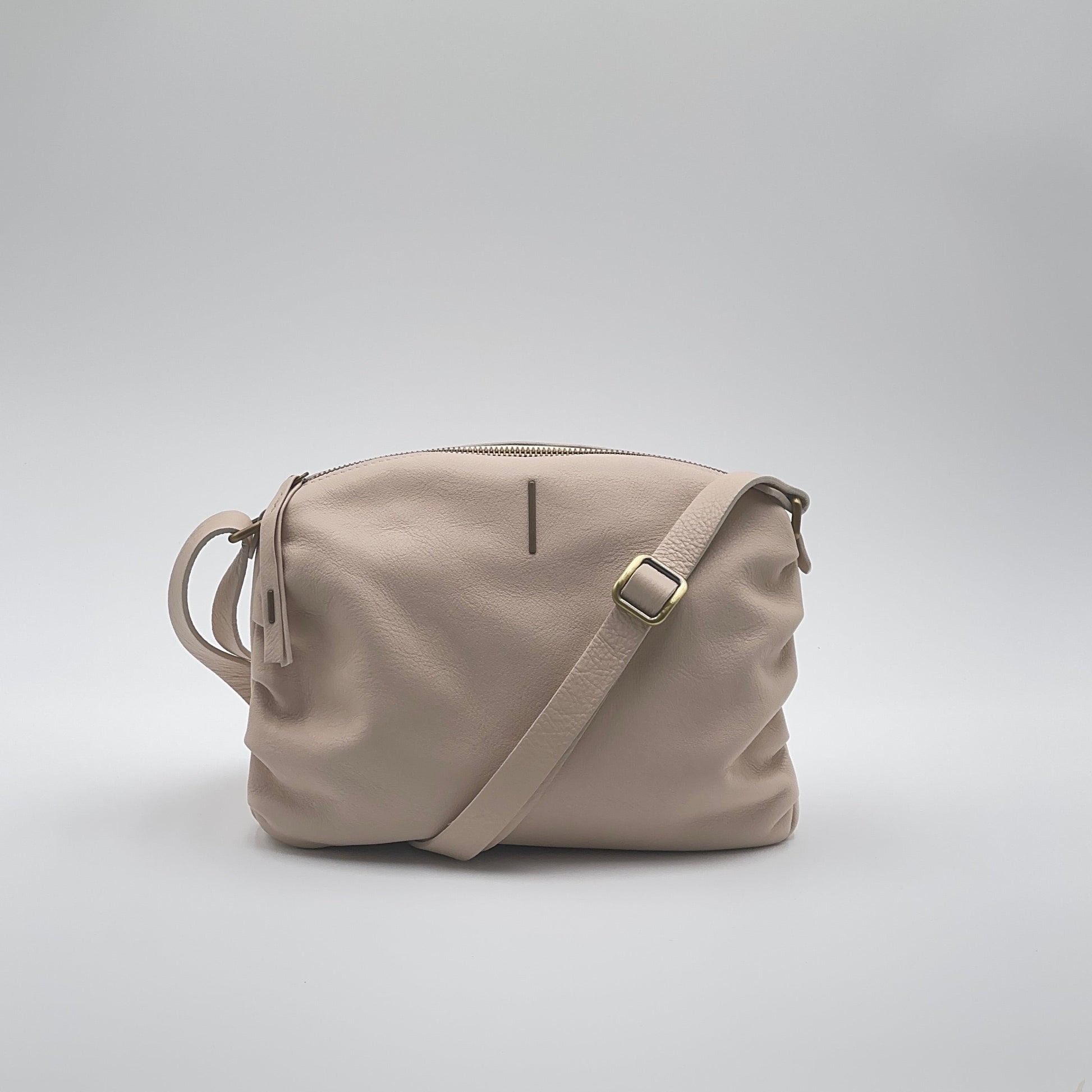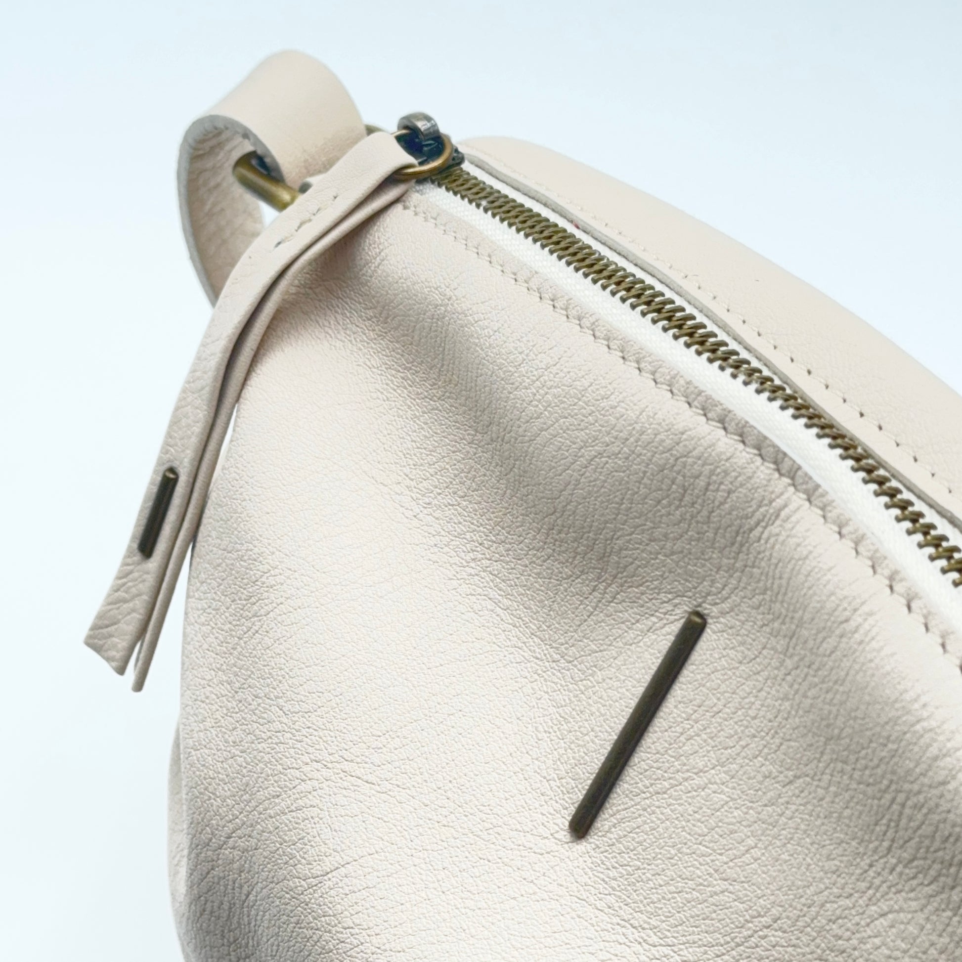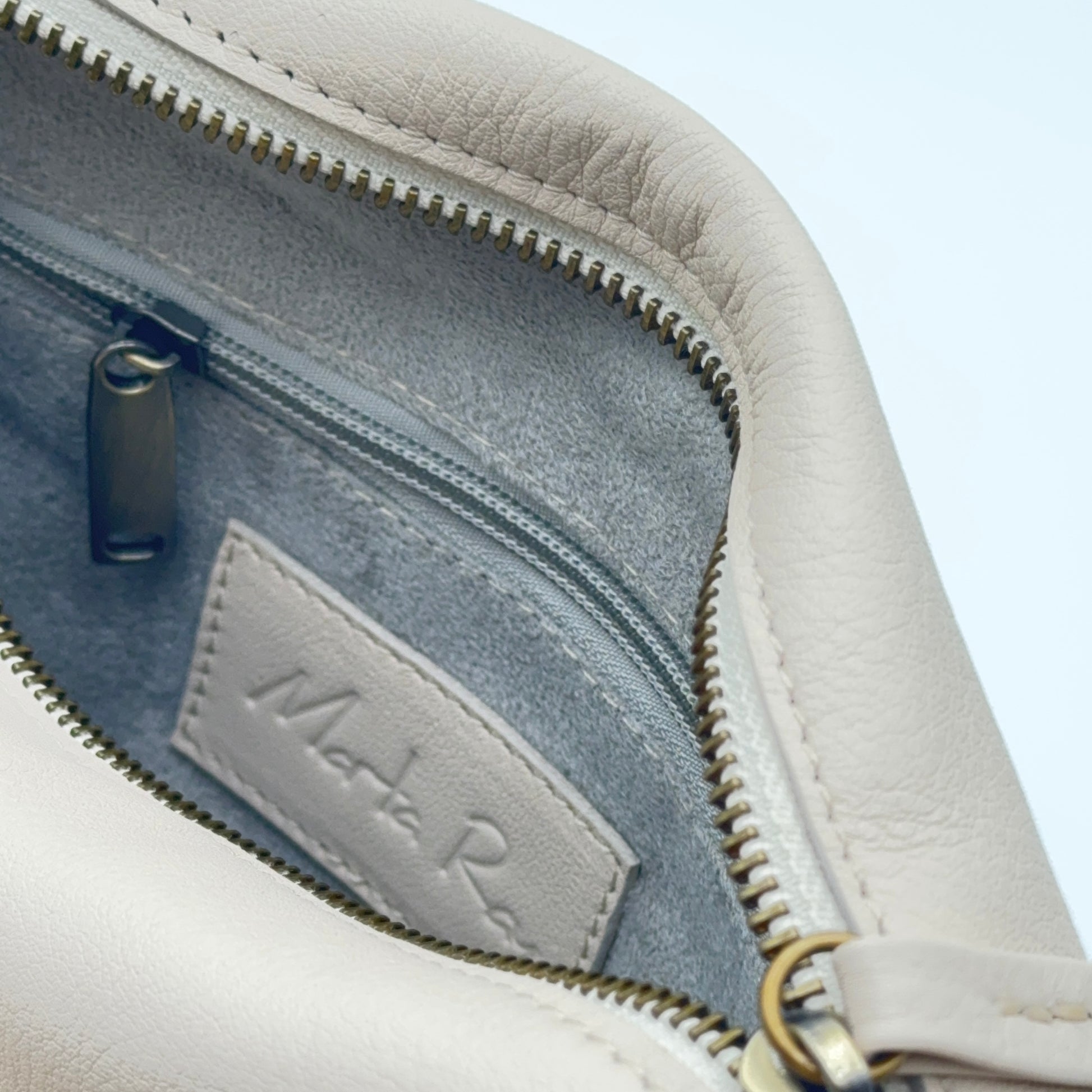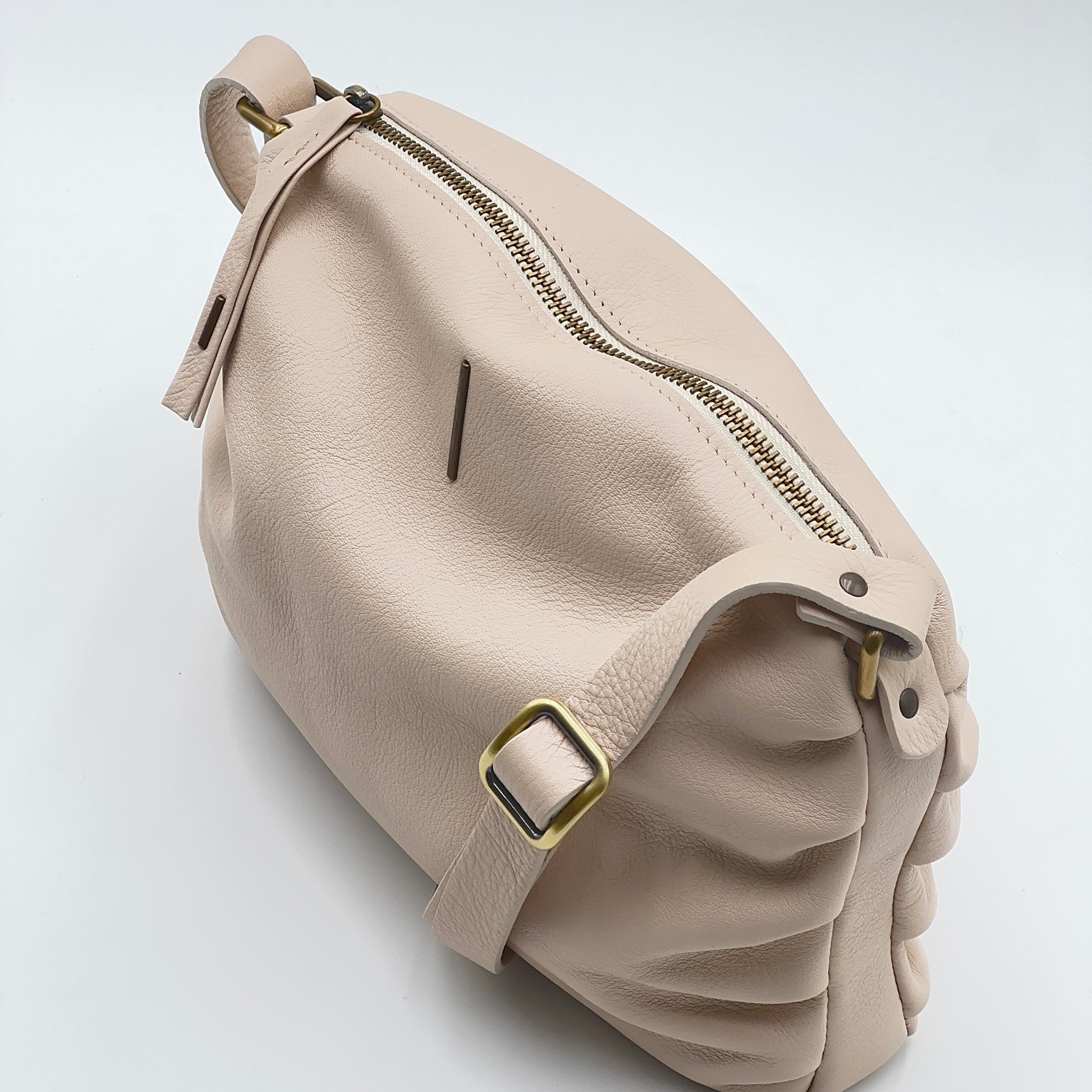 Borsa piccola ma capiente in pelle pieno fiore Mousse color latte macchiato, con pieghe a soffietto che le donano una forma a palloncino.