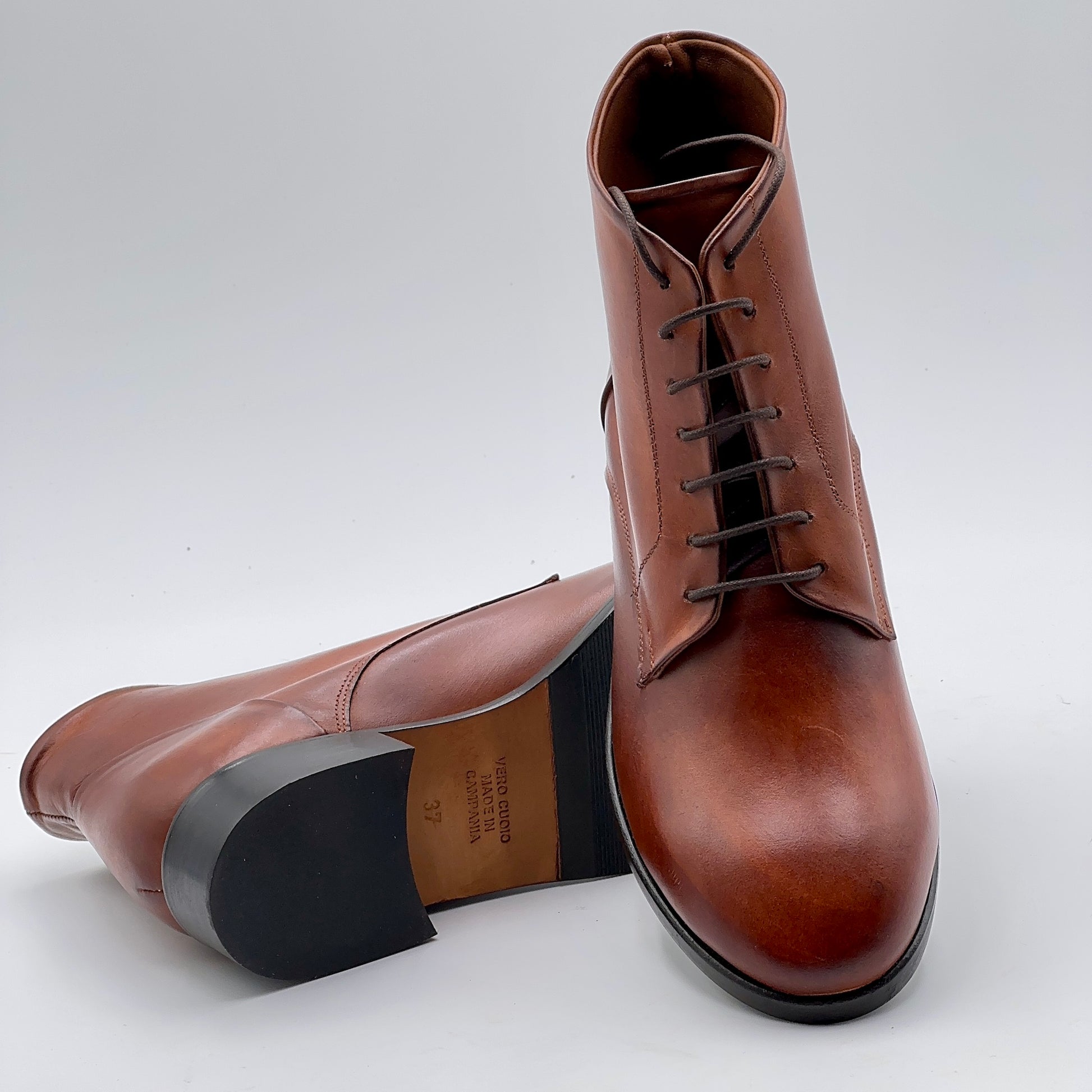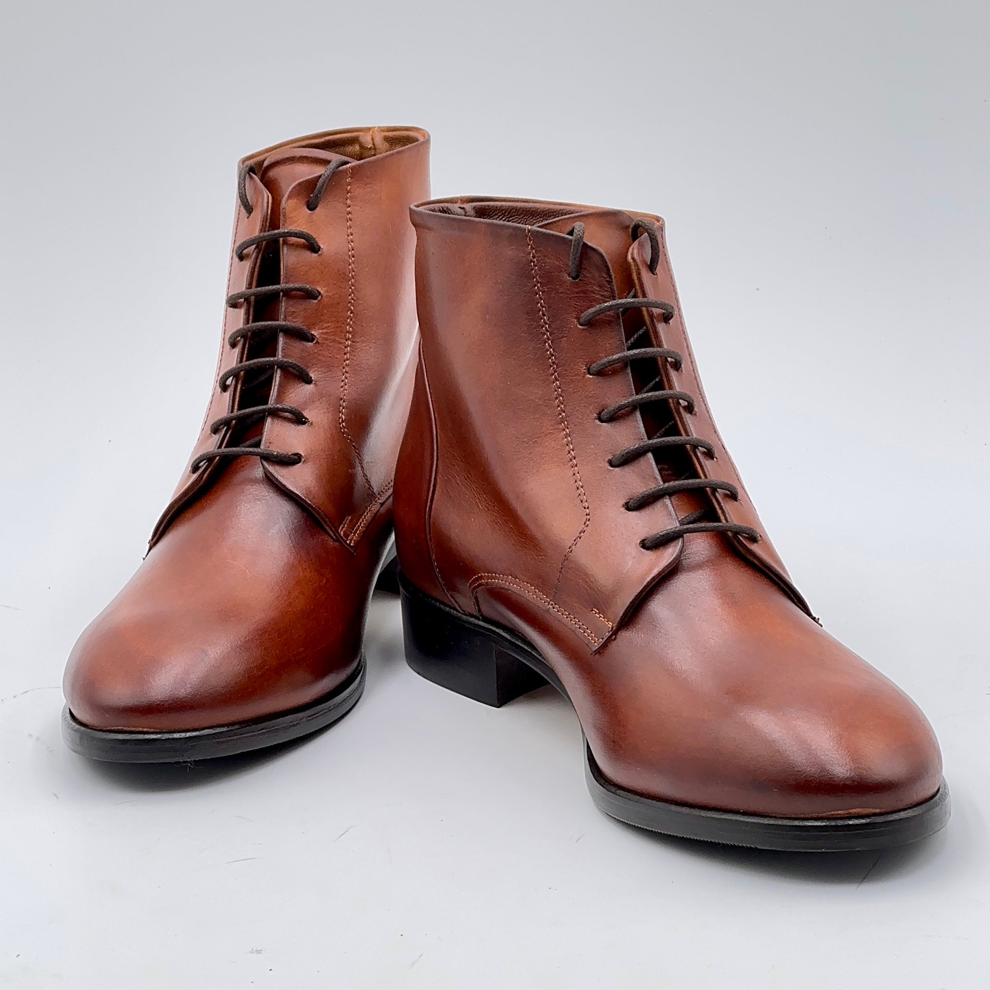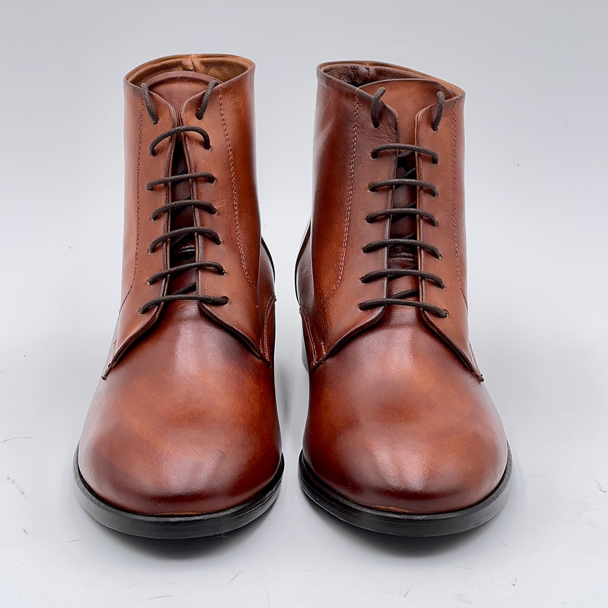 Stivaletto artigianale in morbida pelle tinta a mano, color corteccia, dal design essenziale e raffinato. La linea affusolata e la chiusura frontale con lacci richiamano lo stile classico delle calzature tradizionali, reinterpretato in chiave contemporanea con la tipica eleganza Marta Ray.