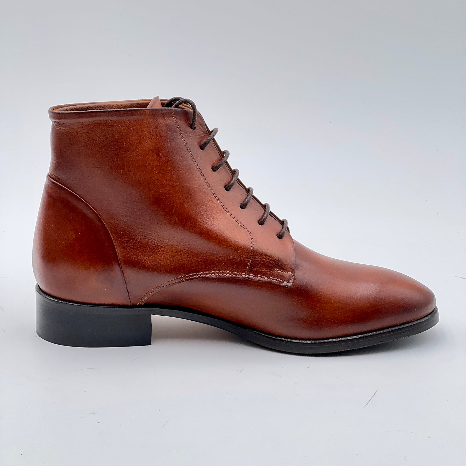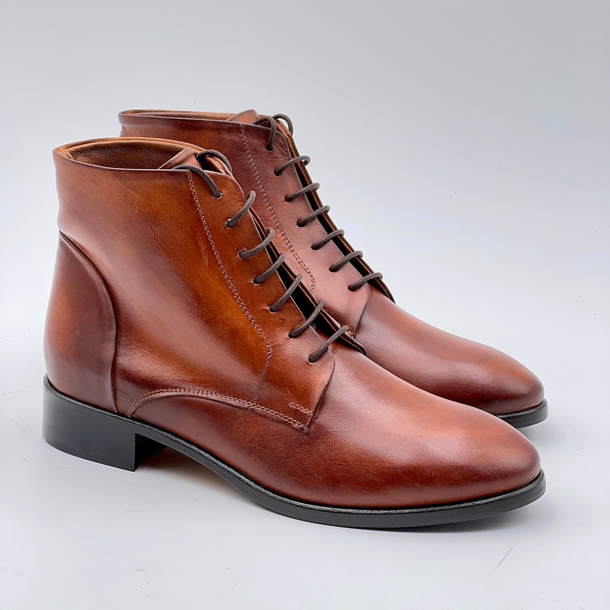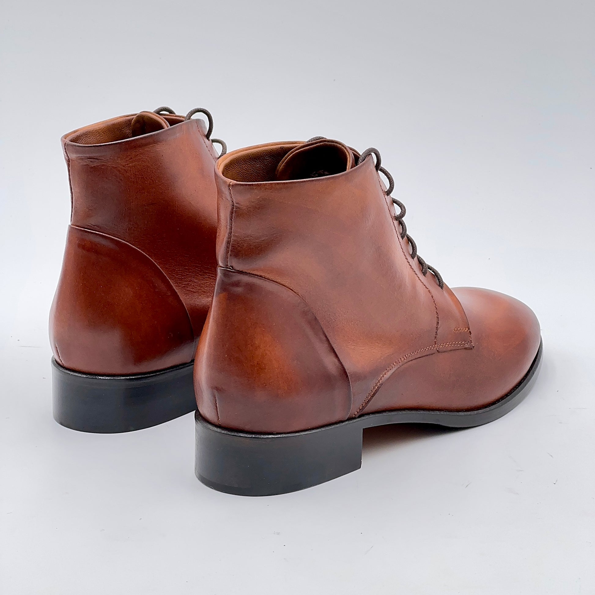 Stivaletto artigianale in morbida pelle tinta a mano, color corteccia, dal design essenziale e raffinato. La linea affusolata e la chiusura frontale con lacci richiamano lo stile classico delle calzature tradizionali, reinterpretato in chiave contemporanea con la tipica eleganza Marta Ray.