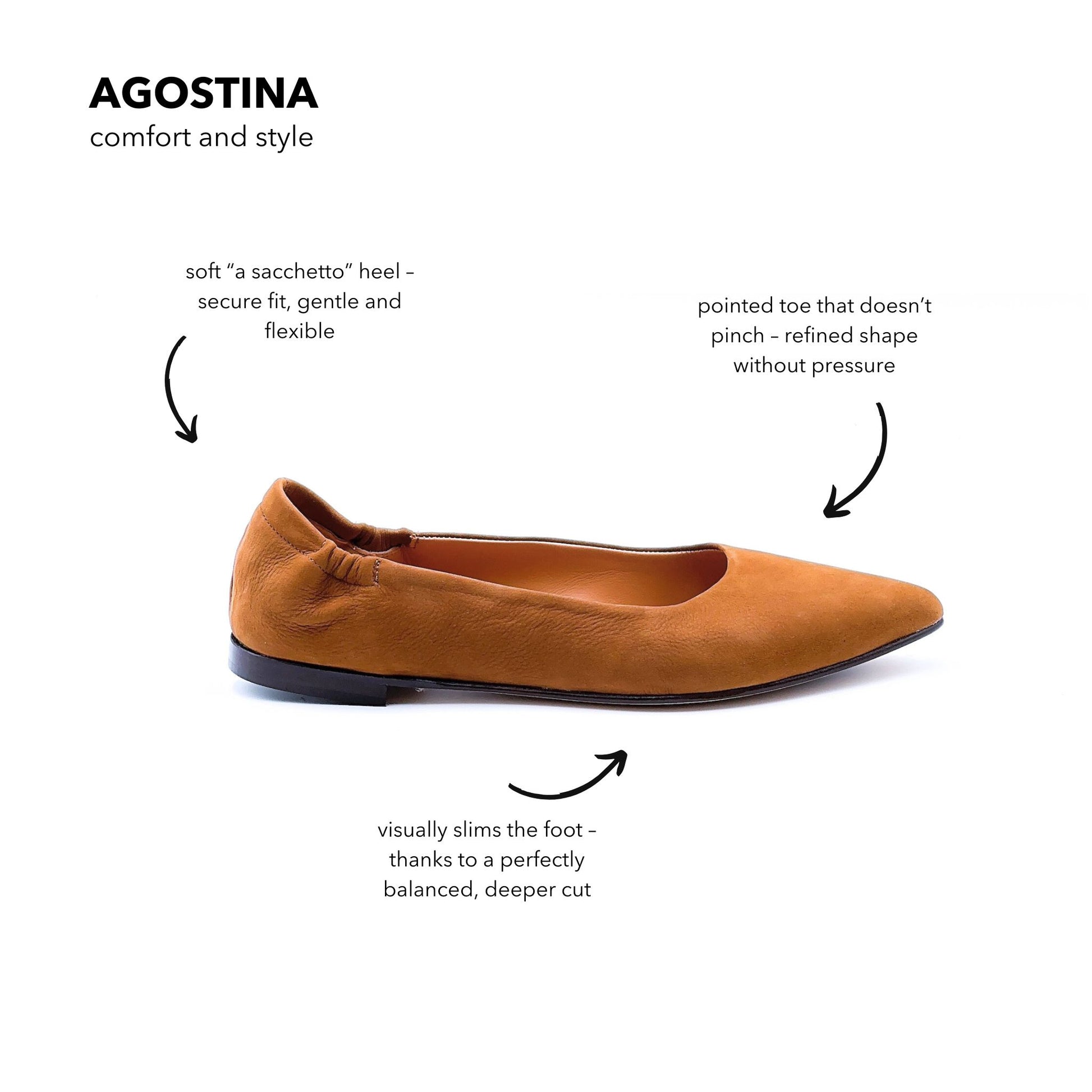 Ballerina a punta gentile in pelle Long Beach color caramello, realizzata a mano con costruzione a sacchetto per garantire flessibilità e comfort. L’elastico al tallone assicura stabilità nella calzata.