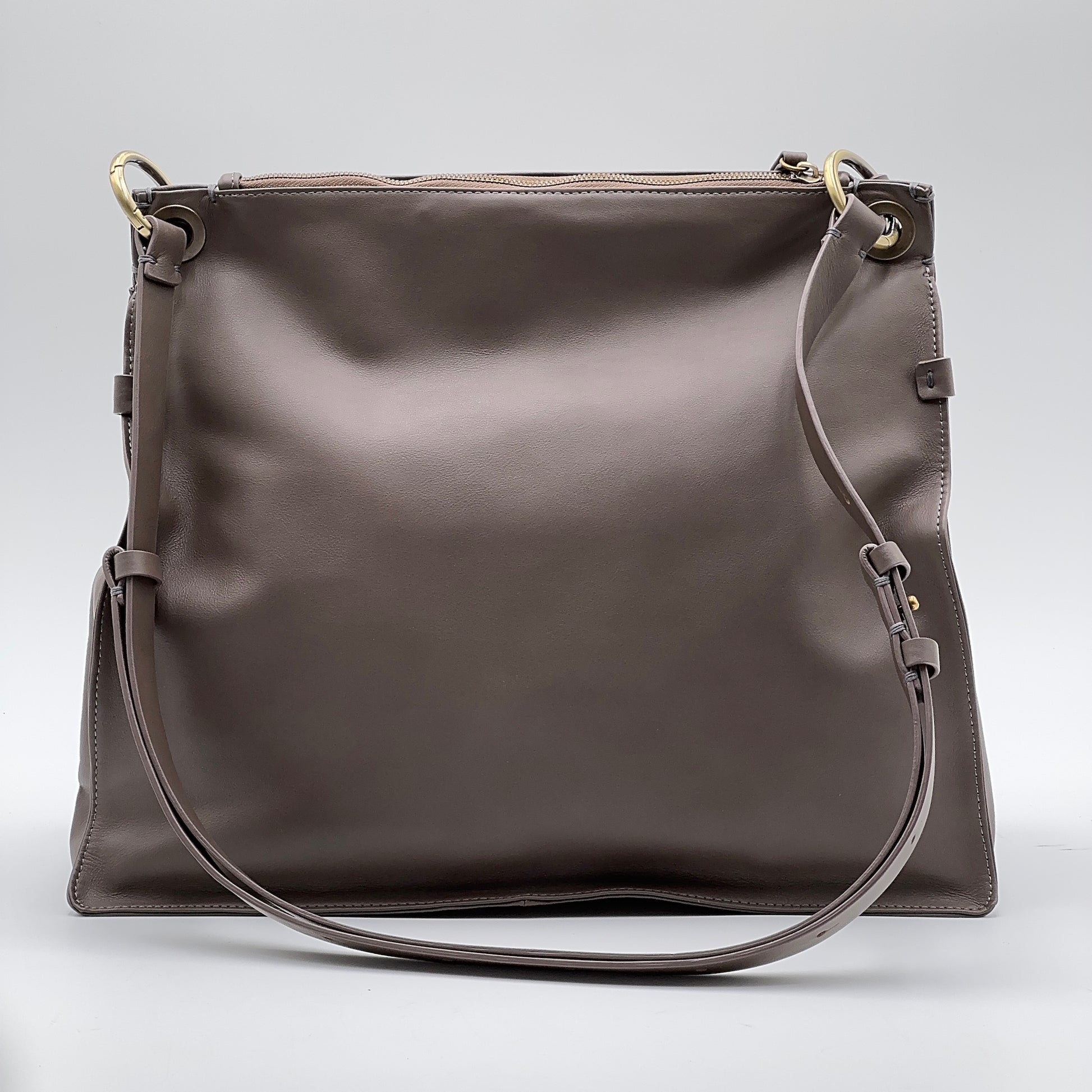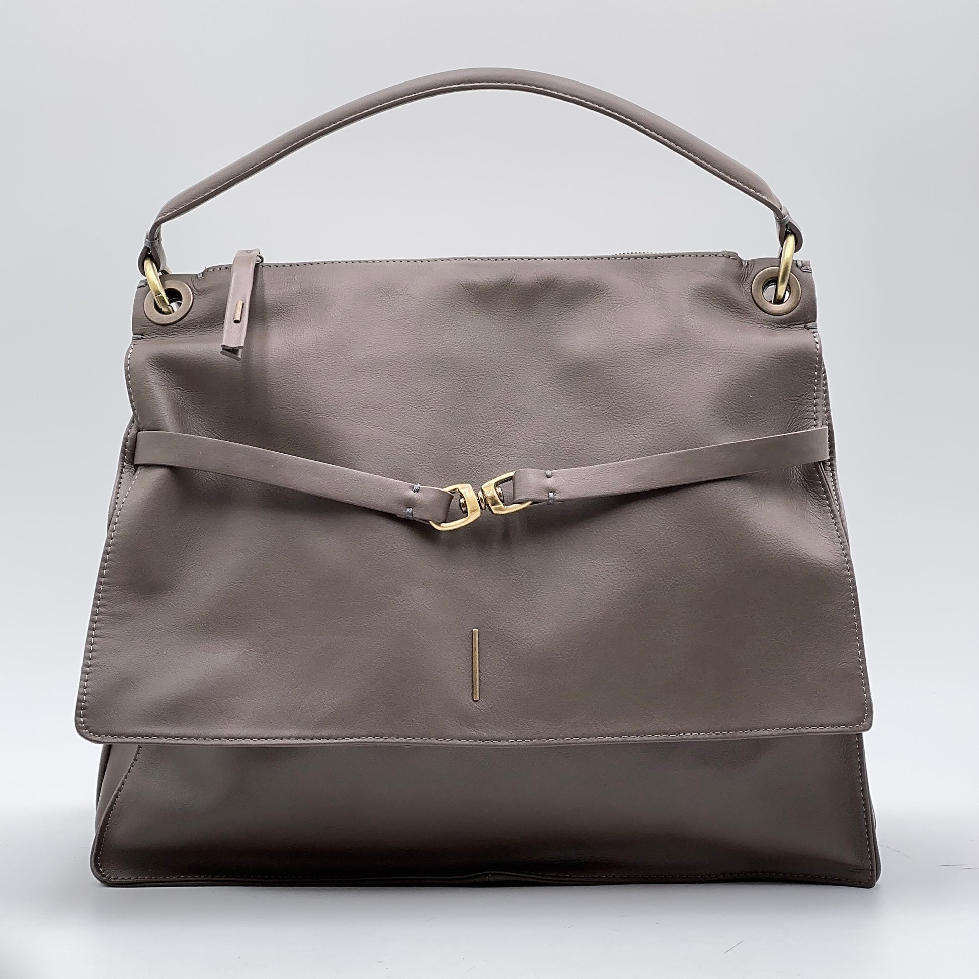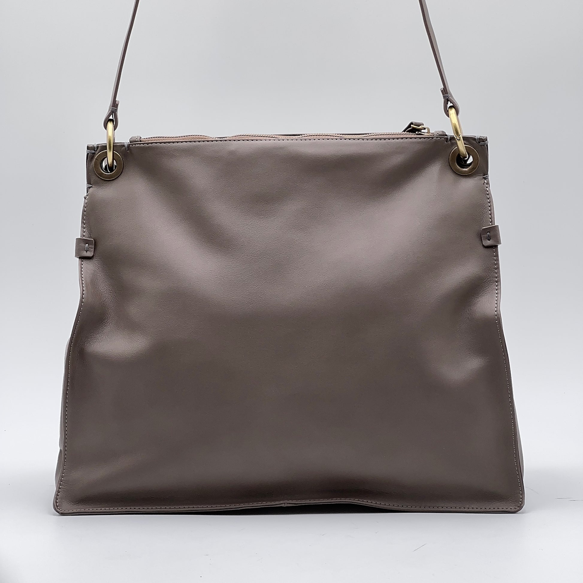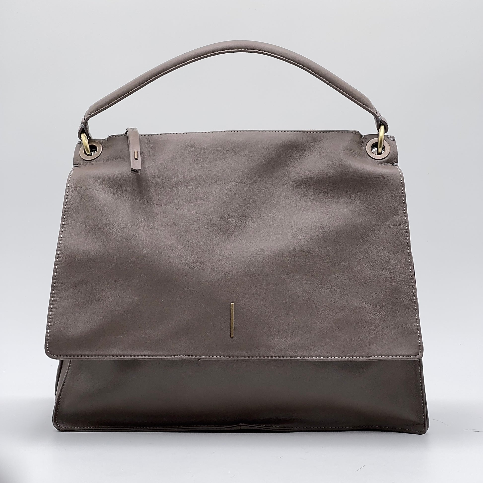 Tracolla rimovibile e regolabile, manico leggermente imbottito, foderata in micro fibra chiara. Accessori in ottone spazzolato.