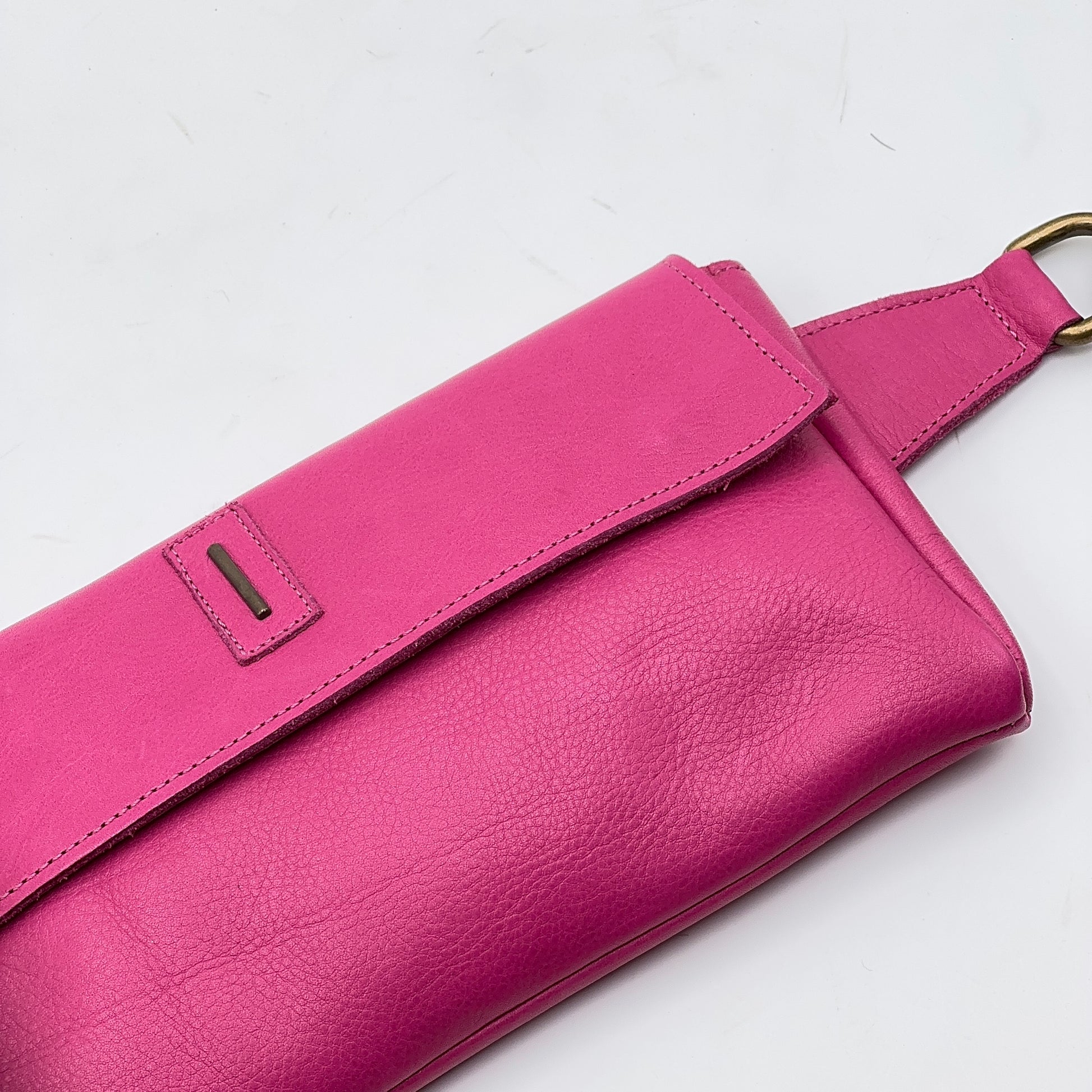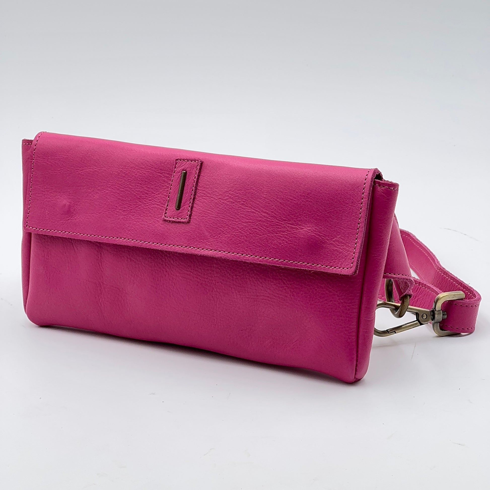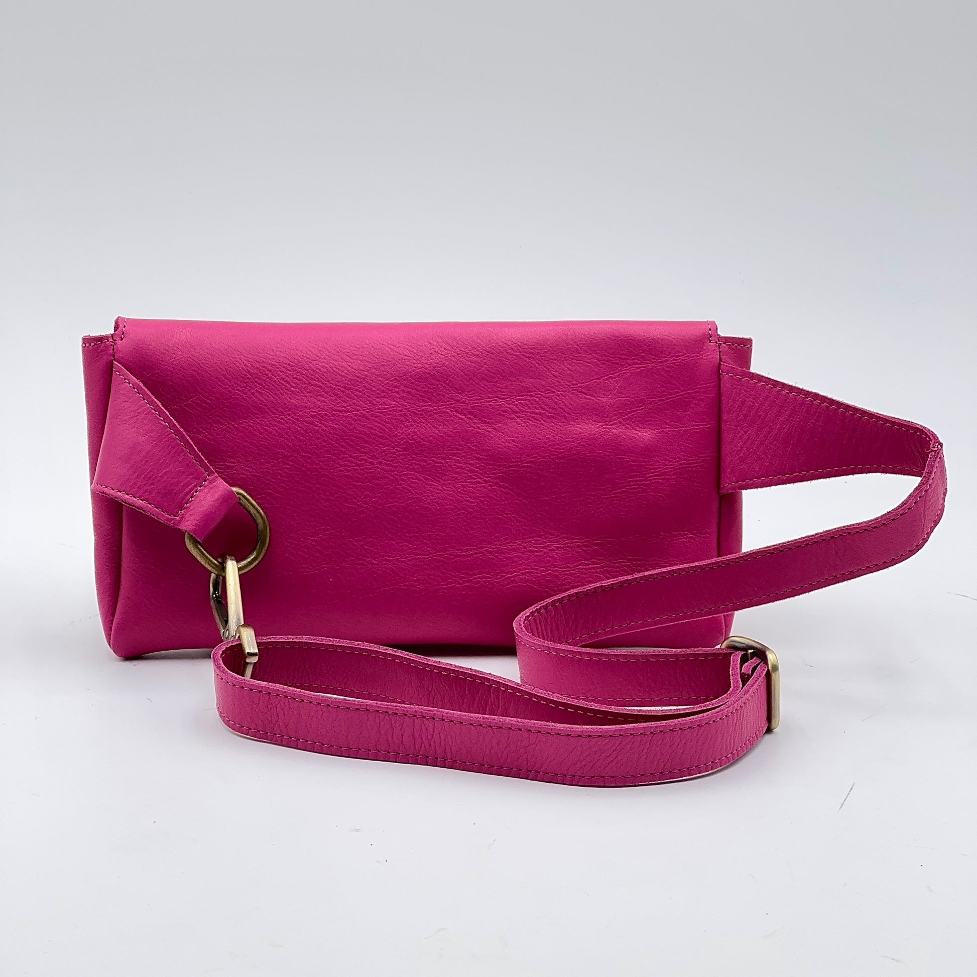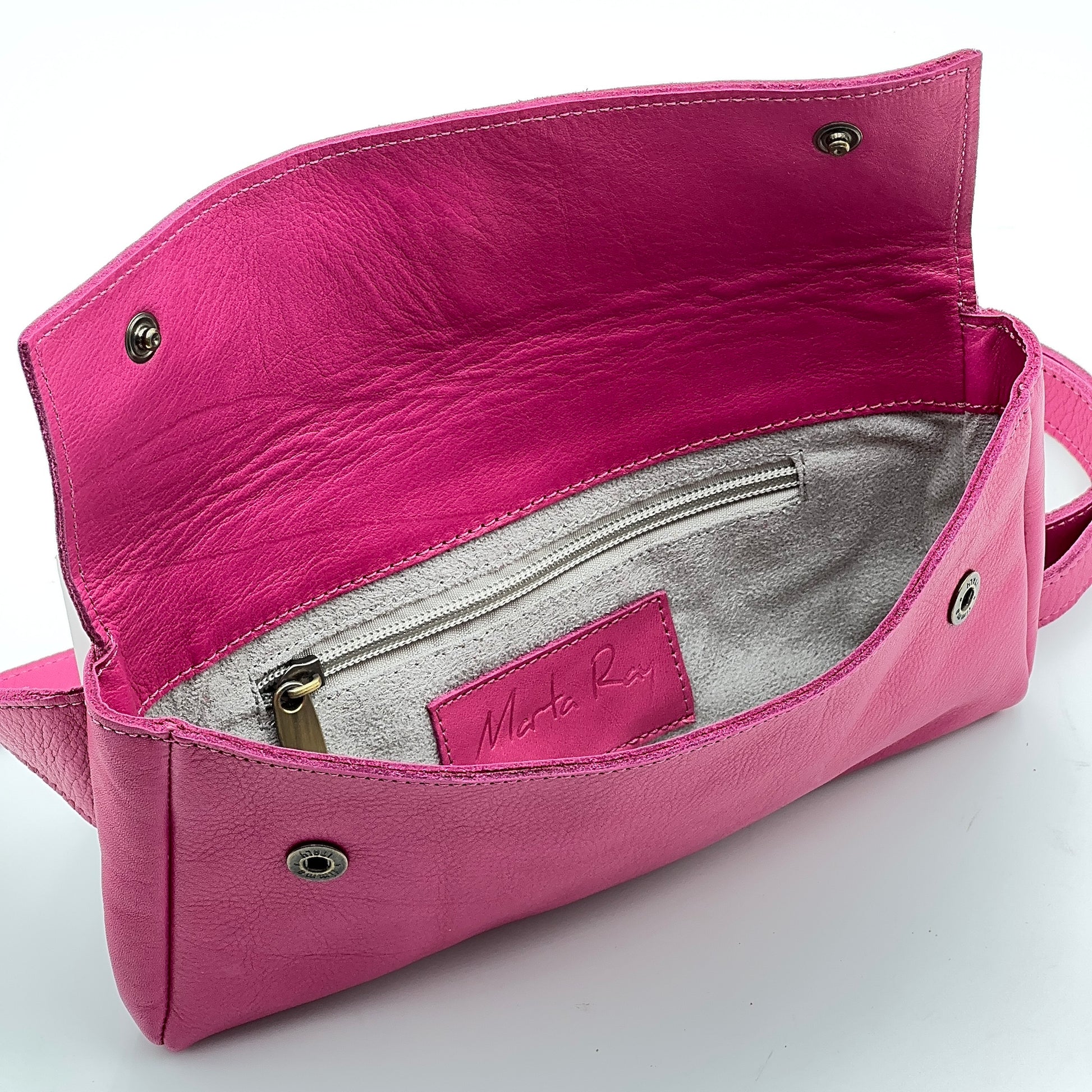 Marsupio in pelle mousse fuxia. Foderato e tasca interna con la zip. Chiusura con bottoni magnetici.