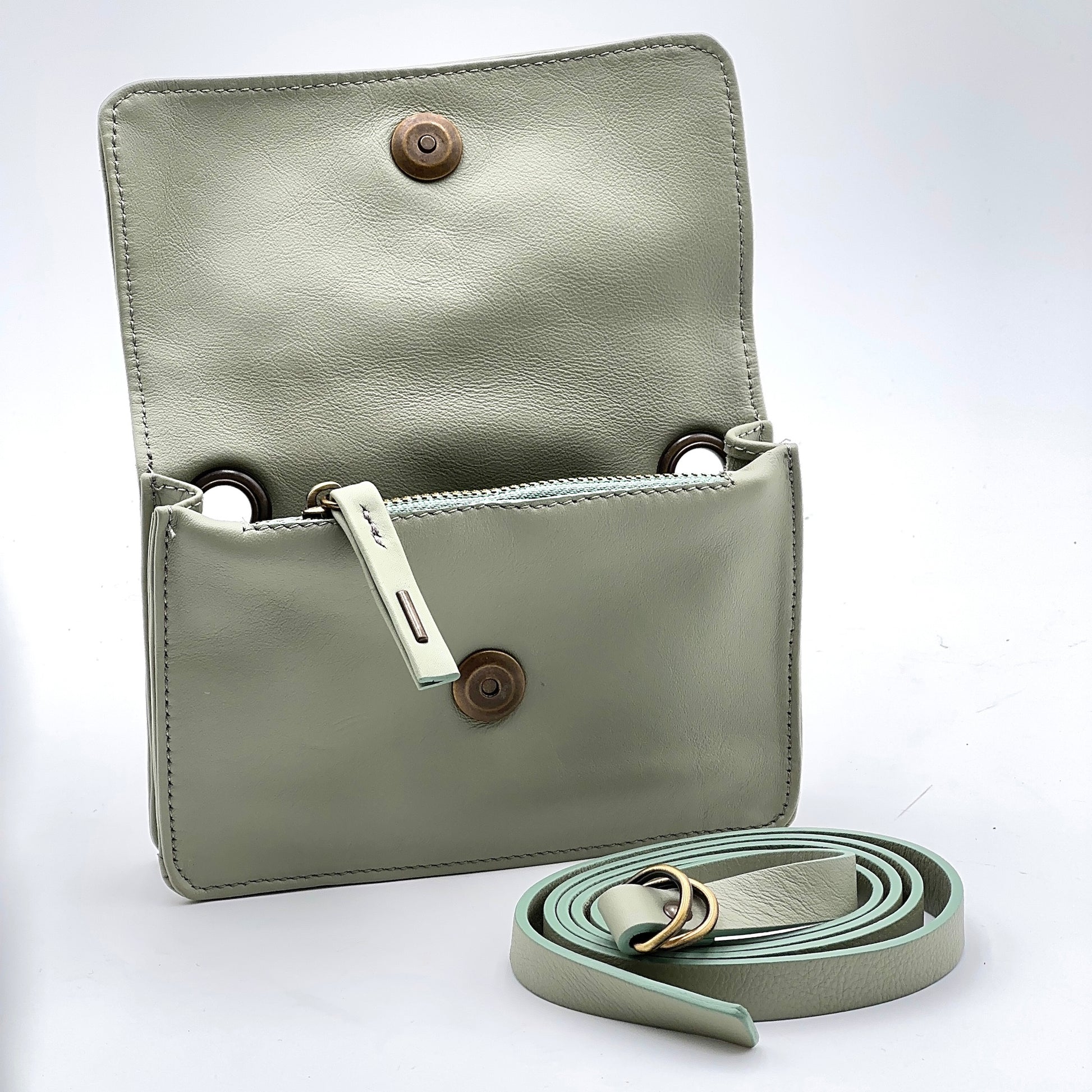La tracolla si rimuove facilmente e può essere sostituita da una sottile cinturina in pelle, trasformandola in un piccolo marsupio.