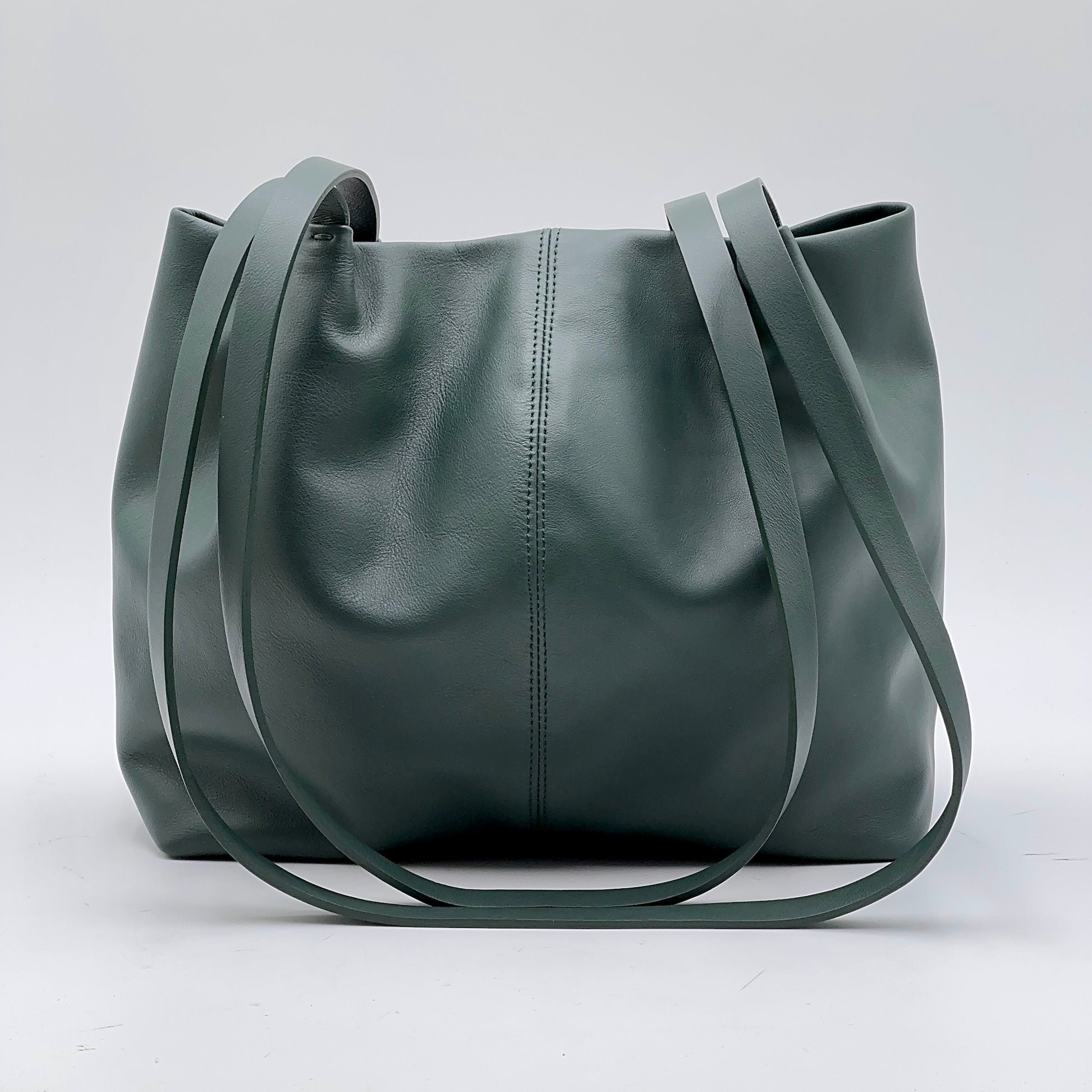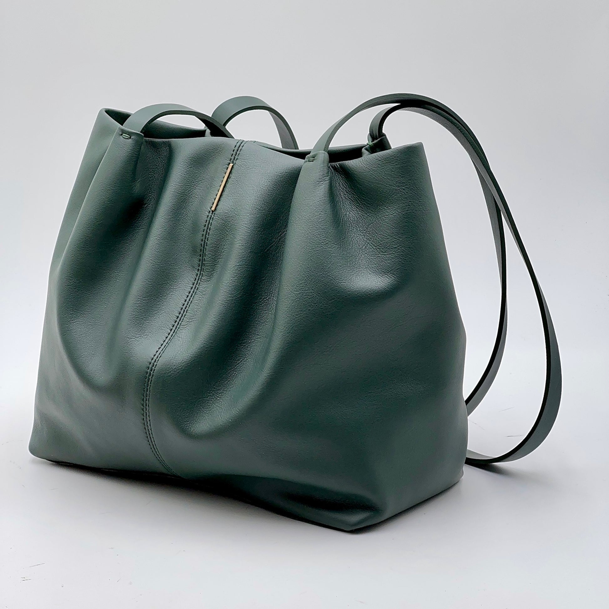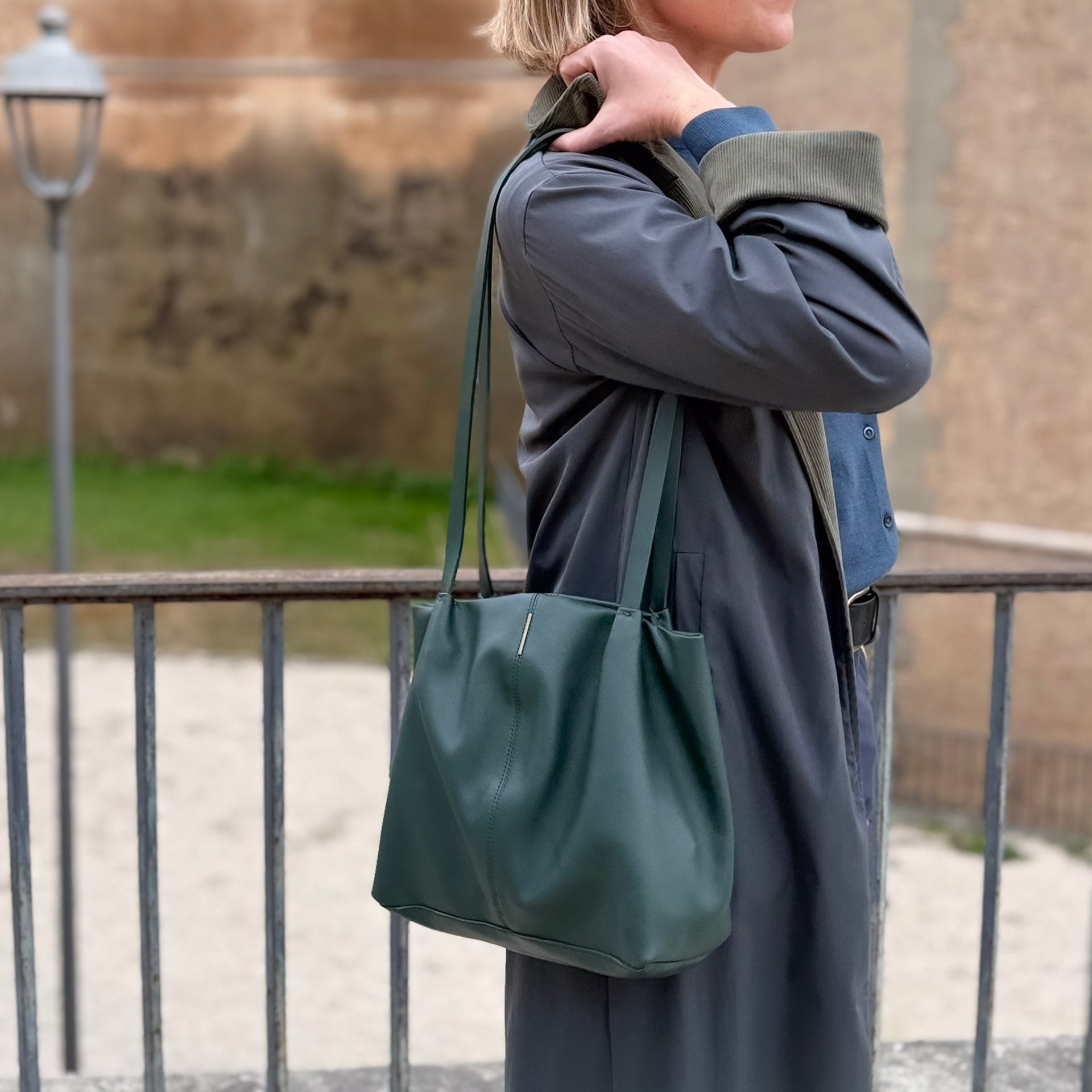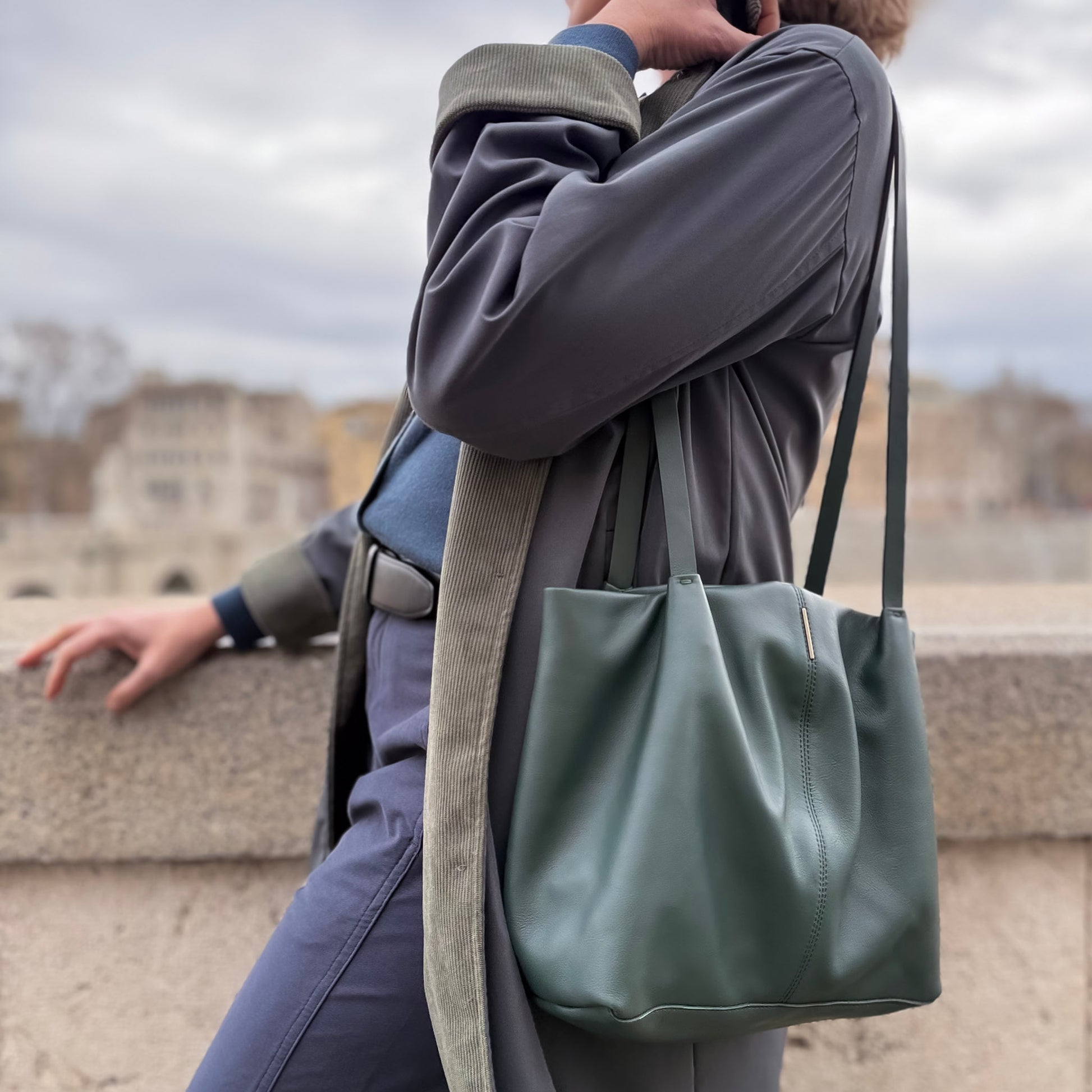 È una borsa morbida, pensata per l’uso quotidiano, che si adagia naturalmente sotto la spalla.