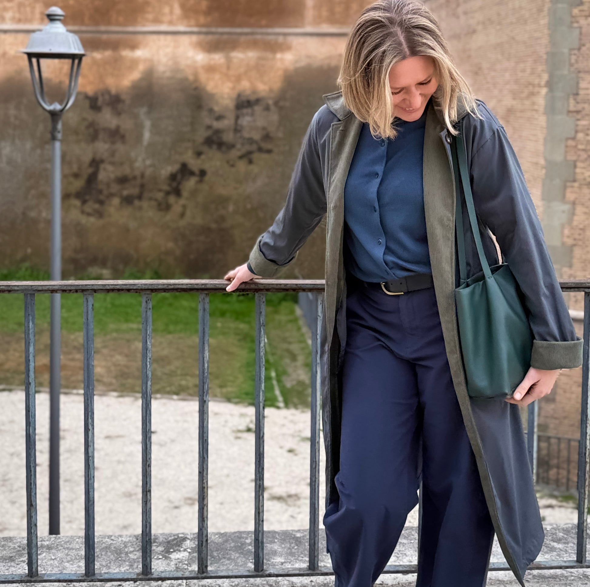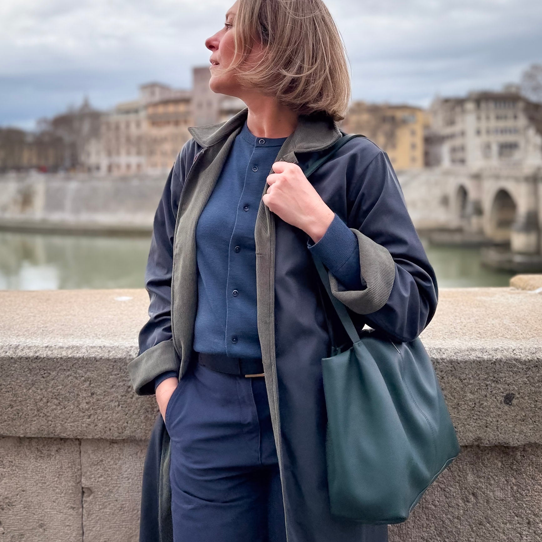 È leggera, comoda e facile da portare. Realizzata in pelle mousse cardo marino — morbida, delicata e molto “easy” nell’insieme.