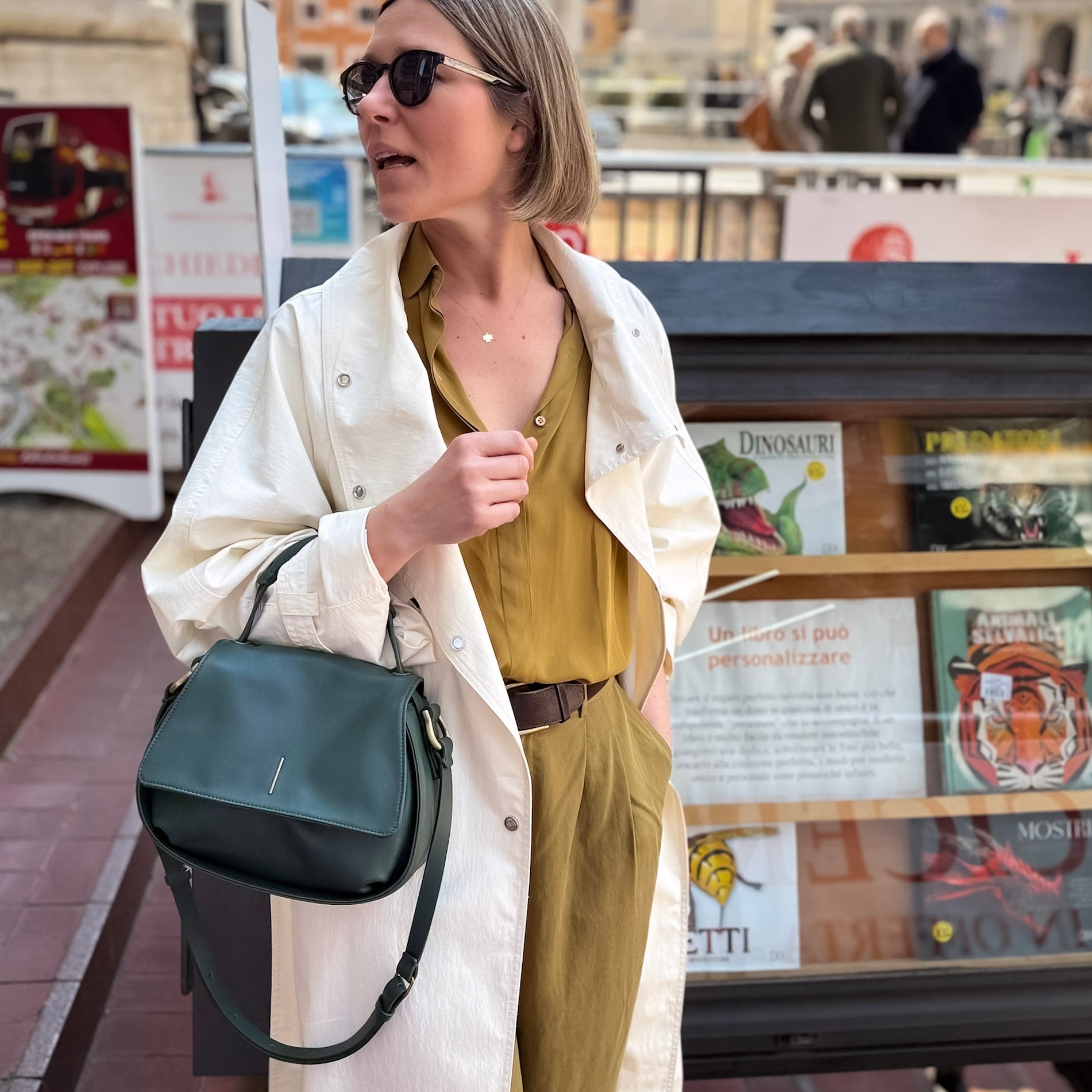 La borsa, ispirata alla tradizione della Tolfa, è un equilibrio naturale tra artigianalità e praticità. Compatta ma sorprendentemente capiente, mantiene una forma perfetta grazie alla sua struttura curata, pur restando morbida e leggerissima.