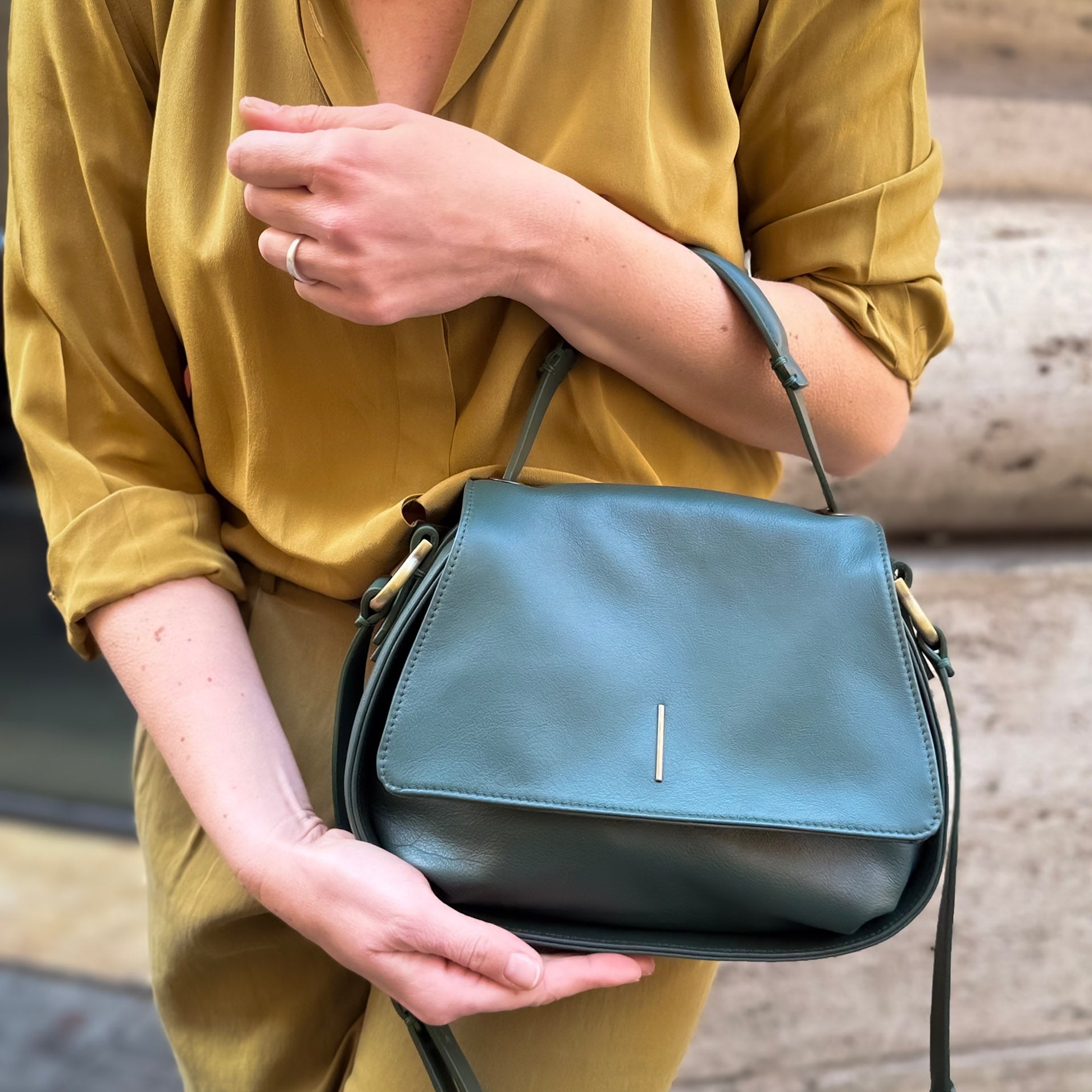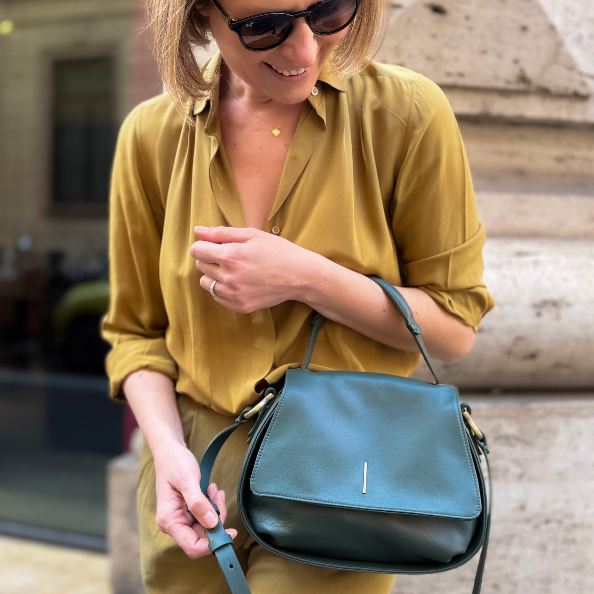 La patta arrotondata con chiusura magnetica nasconde un interno foderato in microfibra grigio chiaro, con una comoda tasca con zip. La pelle mousse cardo marino è morbida e piacevole al tatto, e il comfort nel portarla — quasi impercettibile sulla spalla — la rende un accessorio pensato per accompagnarti ogni giorno, con discrezione e carattere.