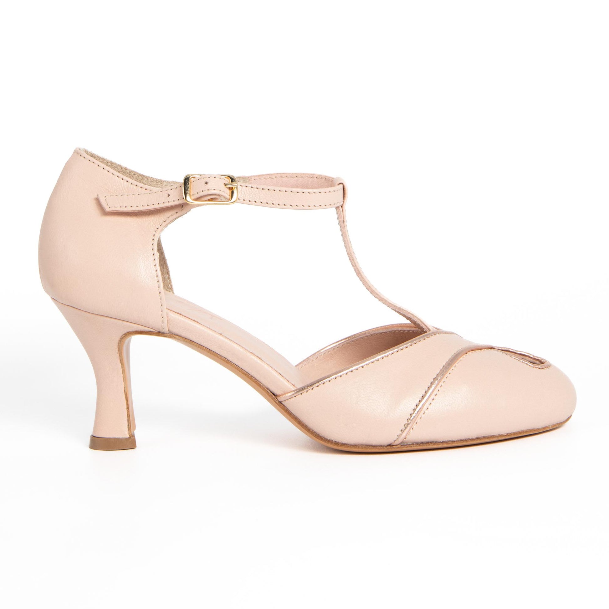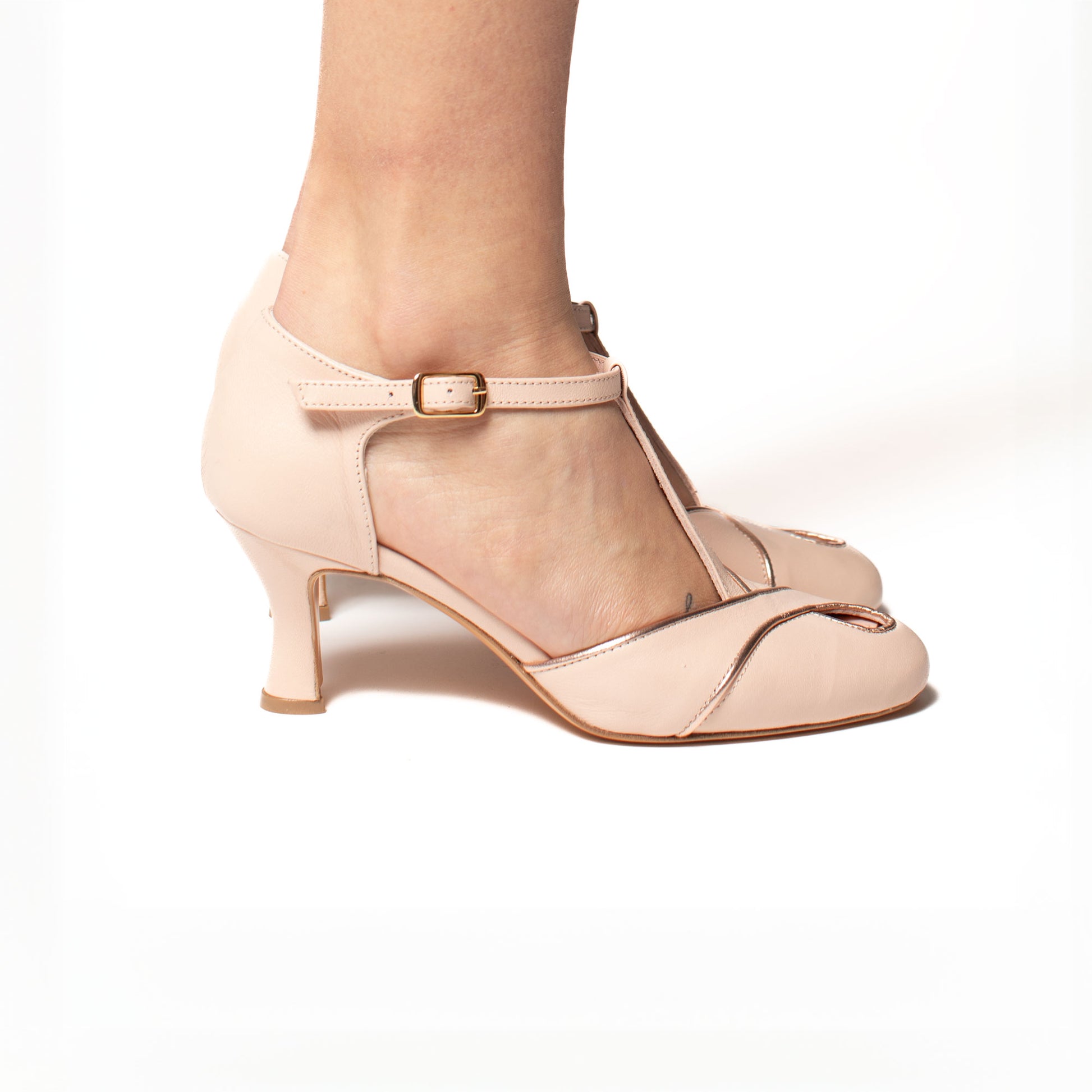 Scarpa in pelle a punta tonda con T-strap e cinturino raccordato e regolabile alla caviglia. Sottopiede in pelle, suolo in cuoio e tacco rivestito di 7cm