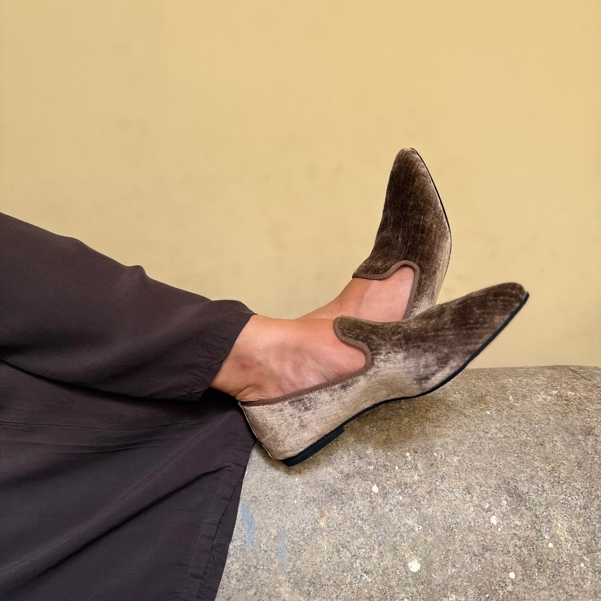 Pantofola a punta realizzata in morbido velluto brillante colore visone. Il velluto ben si abbina a questo modello ed esalta la morbida tonalità del colore.