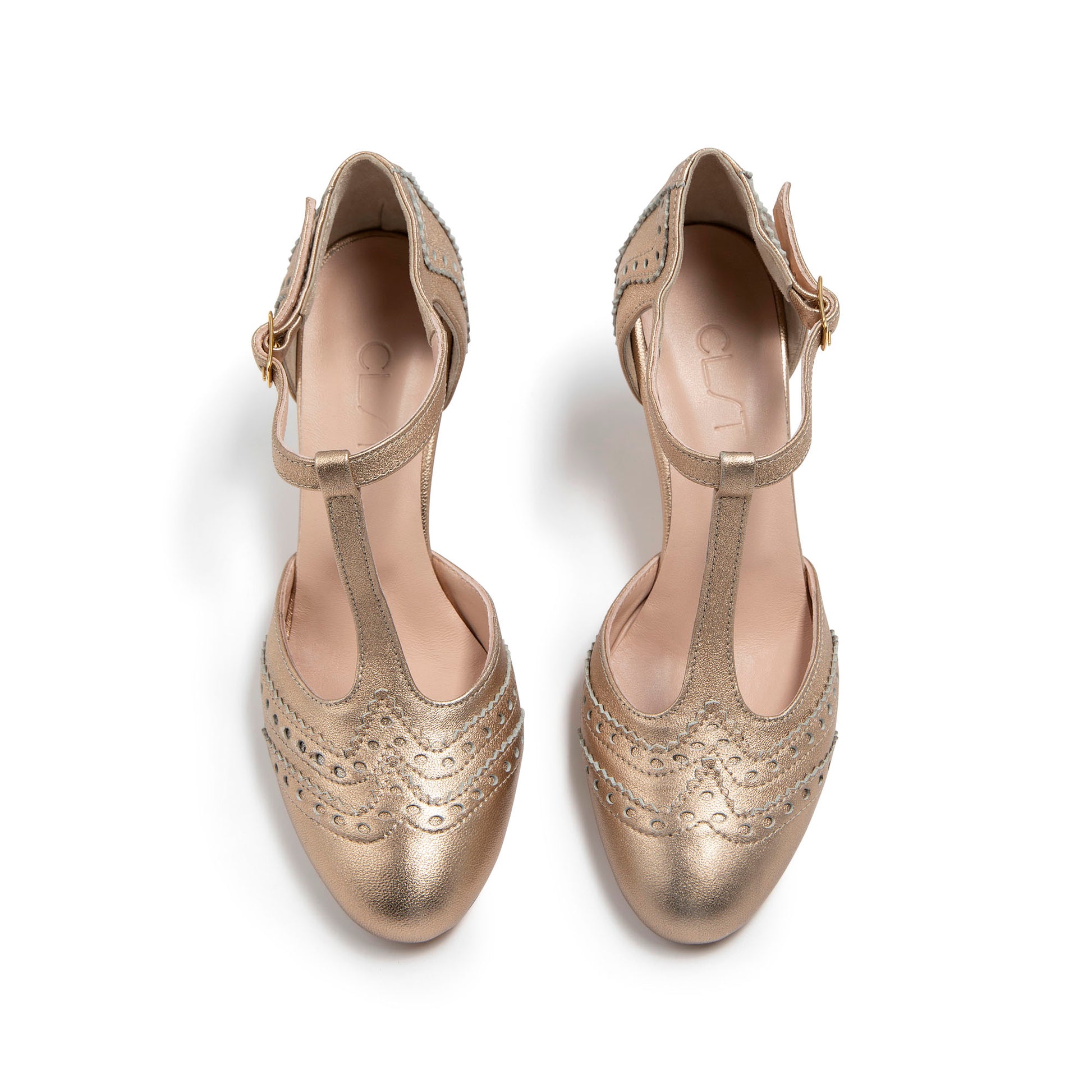 Scarpa in pelle a punta tonda con T-strap e cinturino raccordato e regolabile alla caviglia.