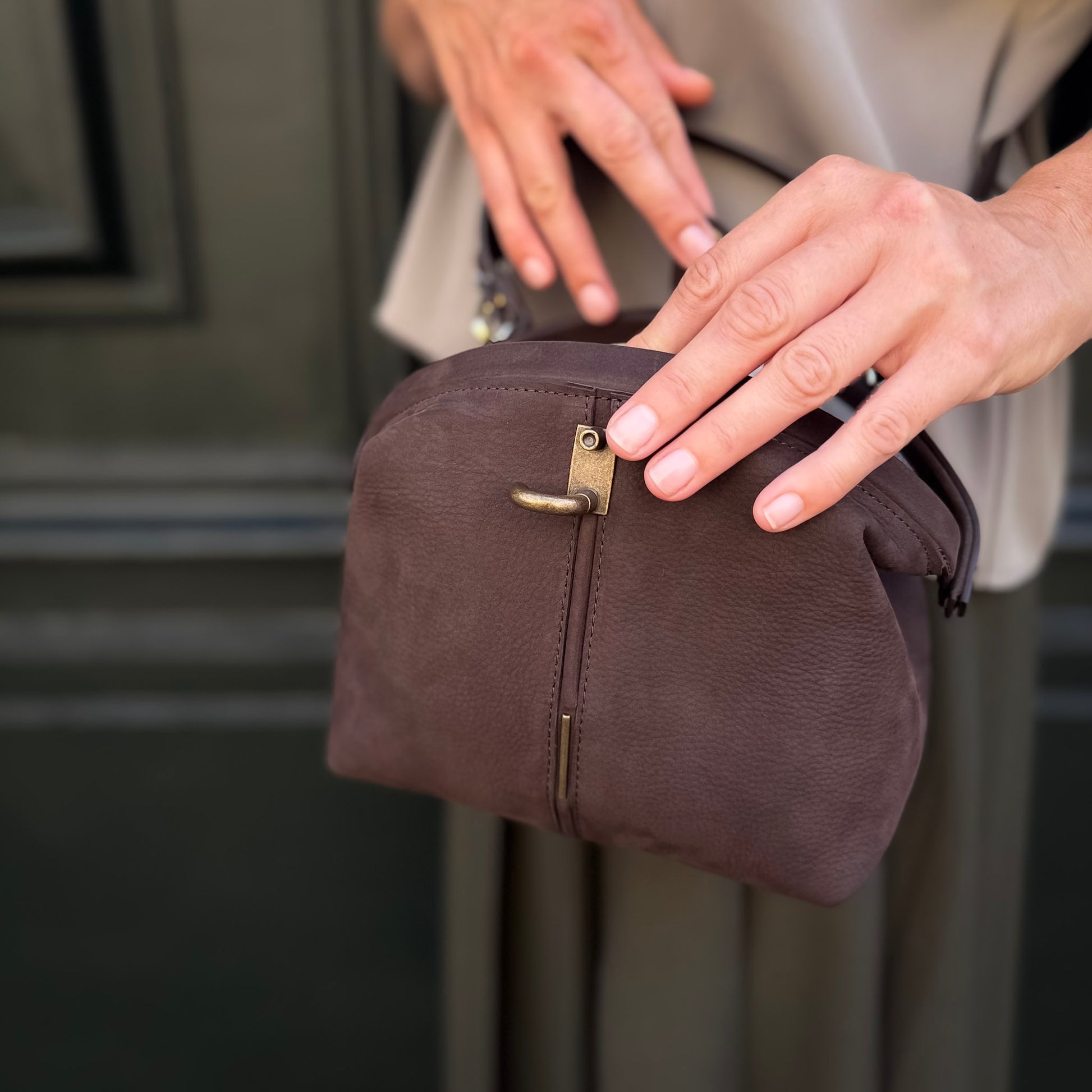 Pouf Medium è una borsa a mano morbida e armoniosa, dalla forma a mezza luna. L’ampia apertura stile doctor bag consente un accesso pratico e veloce, mentre la chiusura con perno e linguetta in tinta aggiunge un dettaglio elegante. Può essere portata a mano oppure a spalla grazie alla tracolla regolabile in cuoio doppiato.