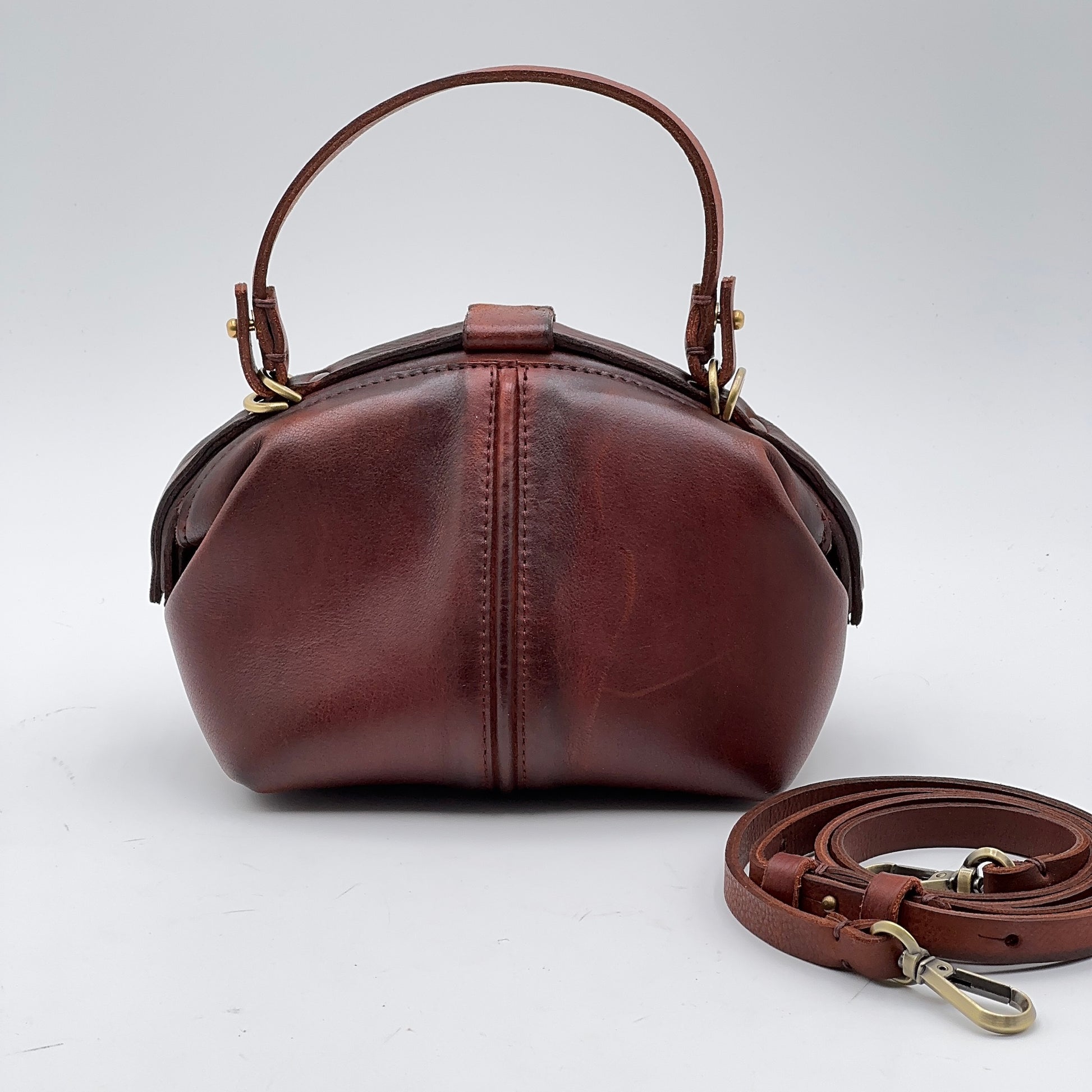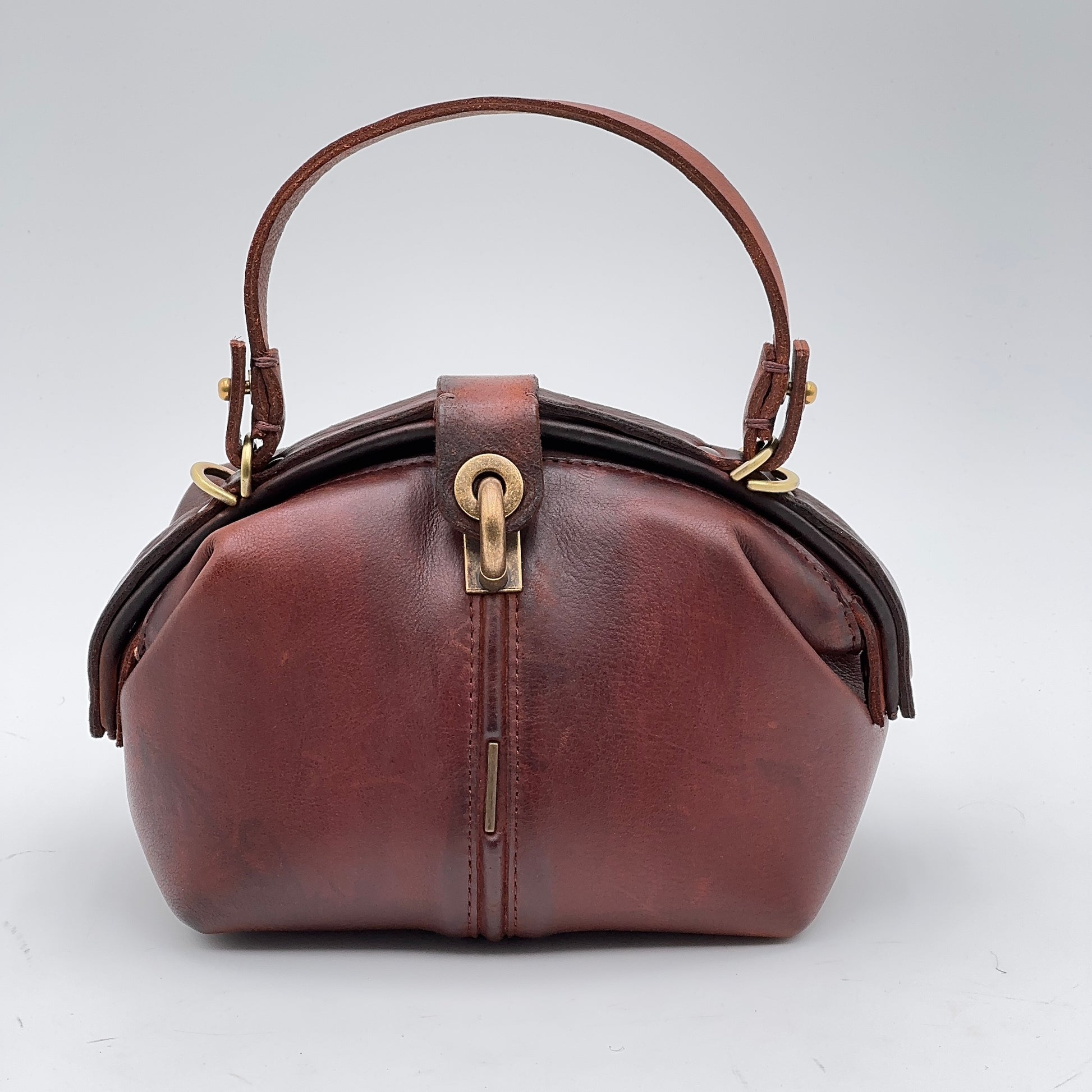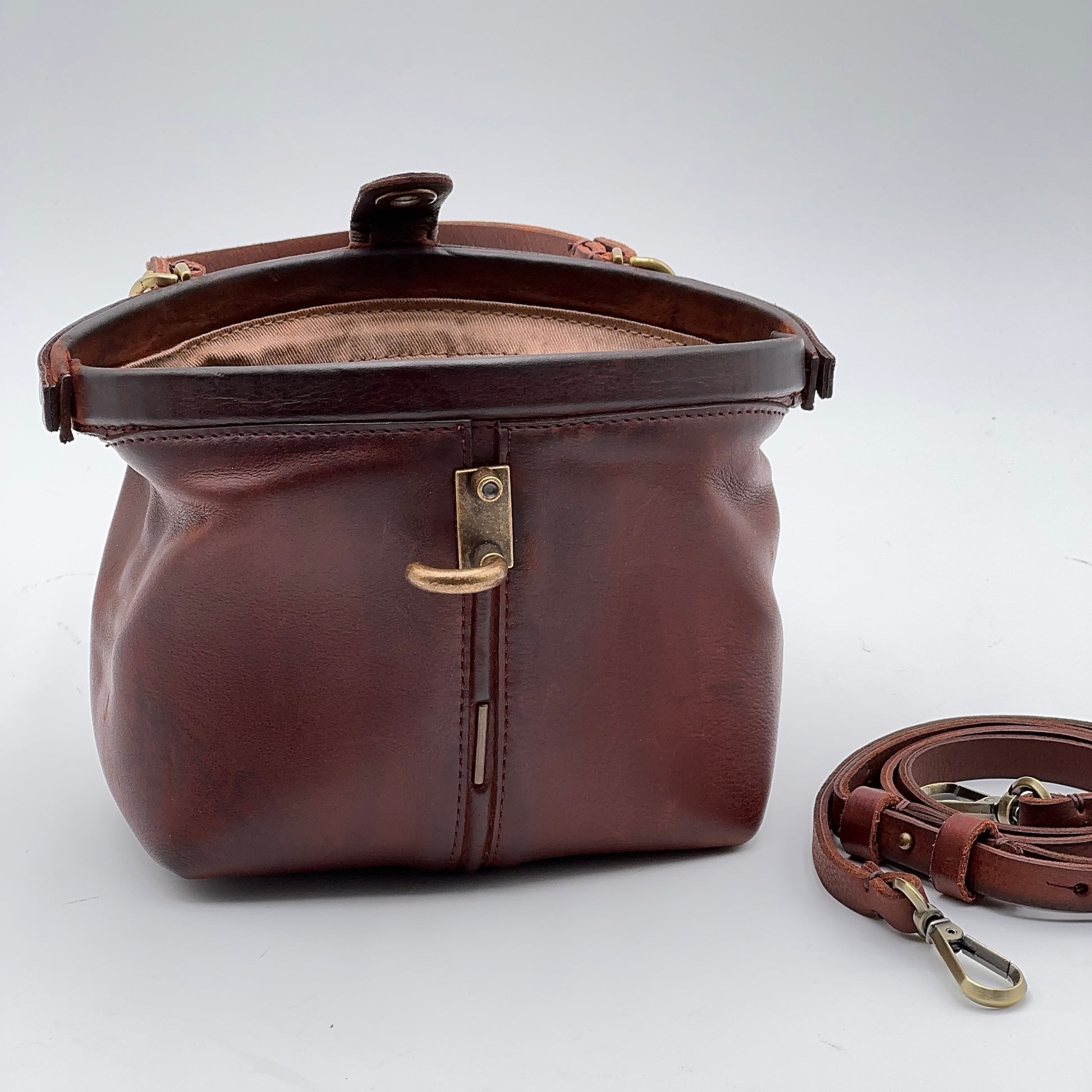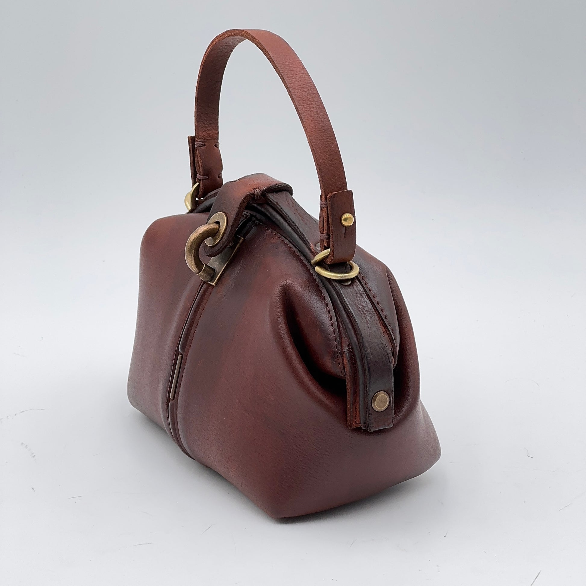 La Pouf Small in pelle tinta con effetto invecchiato nel color corteccia – una lavorazione interamente fatta a mano, con la spazzolatura che rende unico ogni singolo pezzo – conserva il carattere della nostra borsa a mezza luna, ma in una versione più leggera e maneggevole. Si apre ampiamente come una classica doctor bag e si chiude con un perno a scatto, mentre la linguetta coordinata aggiunge un tocco di eleganza.
