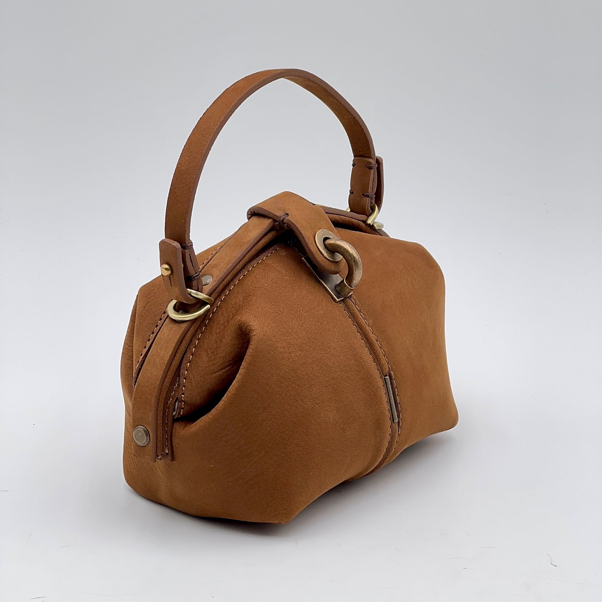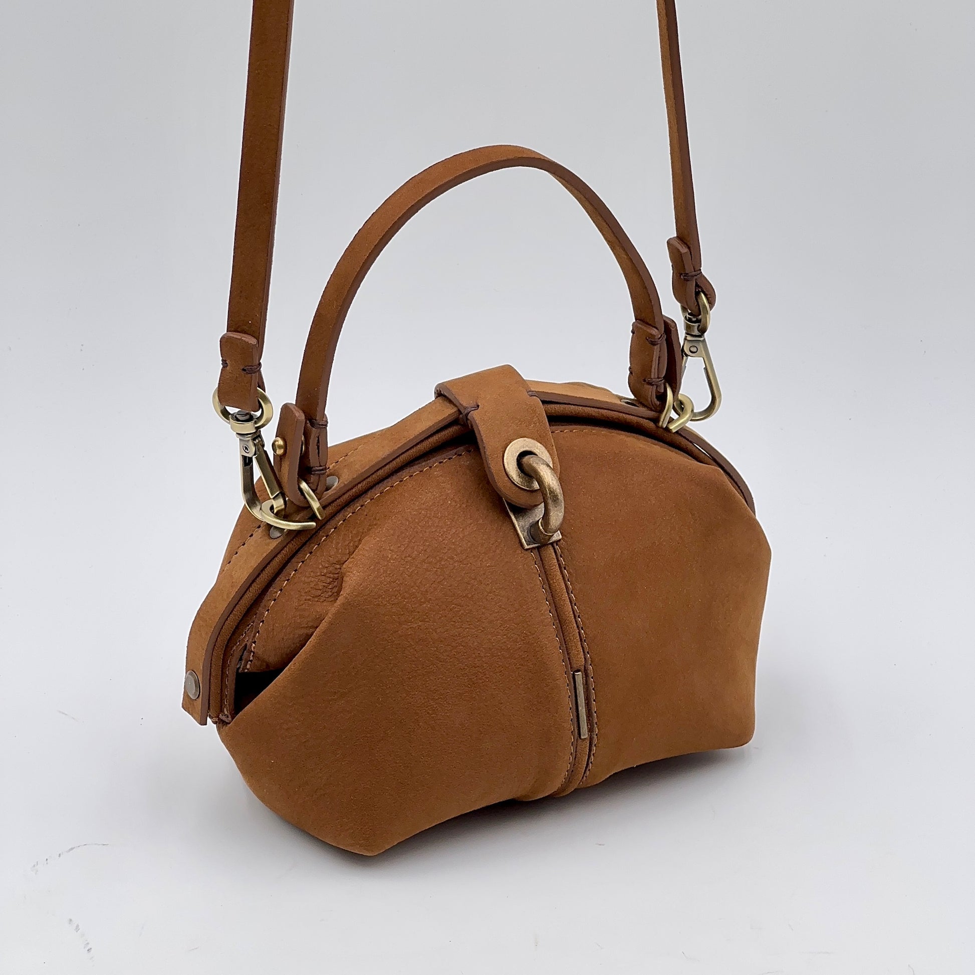 Pouf Small è la versione compatta della nostra iconica borsa a mezza luna. Realizzata in pelle Long Beach color caramello, una tonalità calda e naturale, mantiene tutto il carattere del modello originale in un formato più essenziale e leggero.