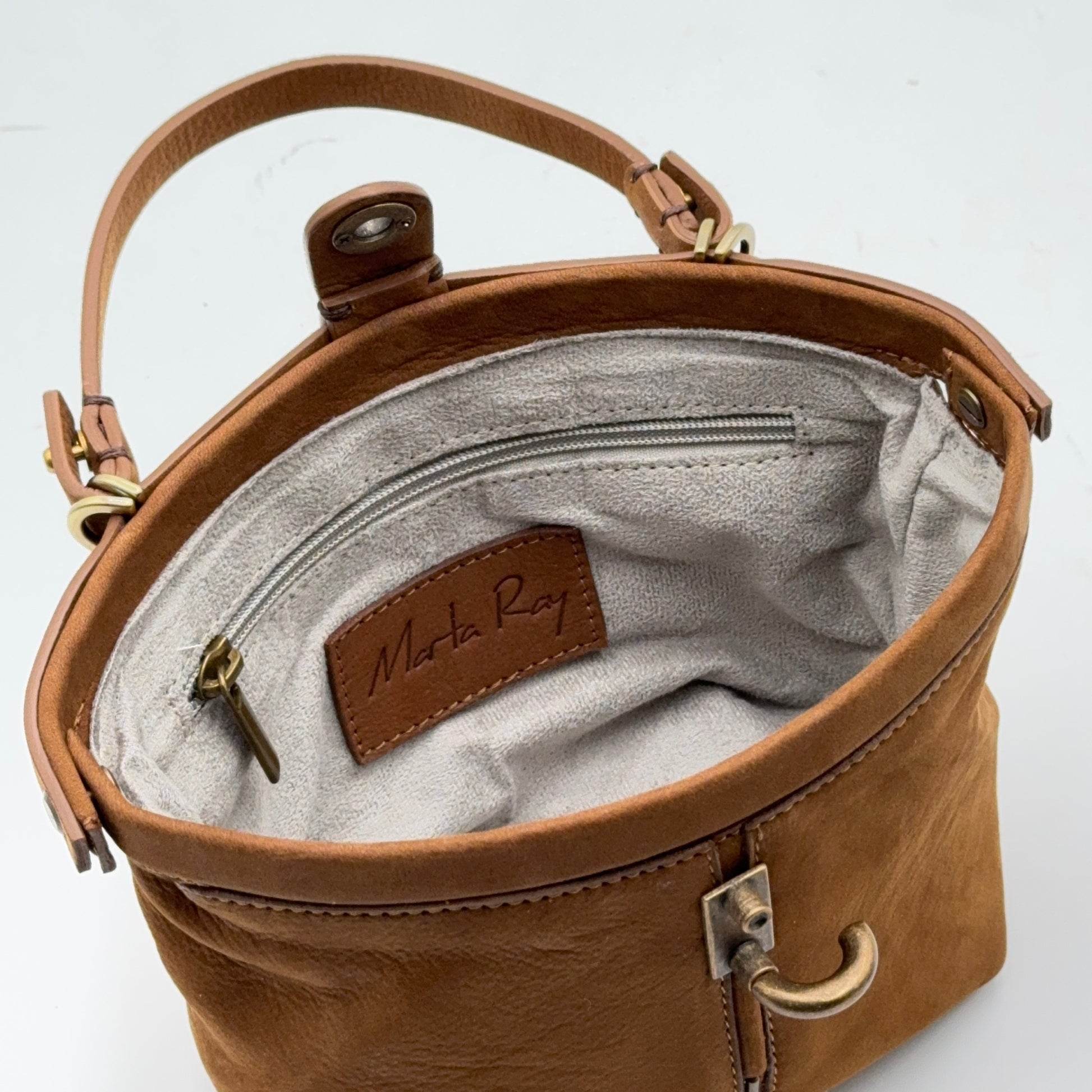 Può essere portata a mano grazie al manico fisso oppure a tracolla con la cinghia in cuoio doppiato, regolabile per il massimo comfort.