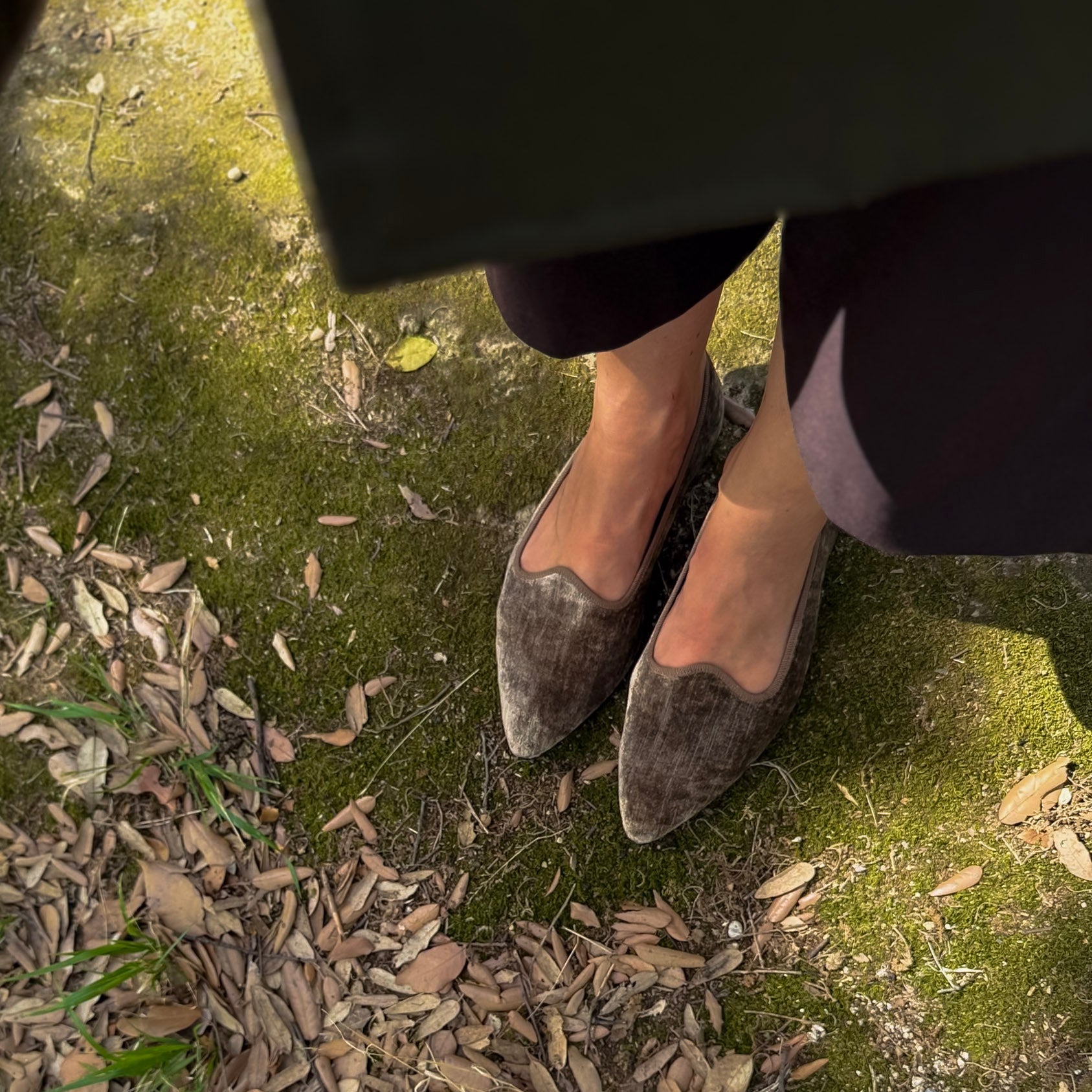 Friulana a punta realizzata in un morbido velluto che ben si abbina a questo modello.